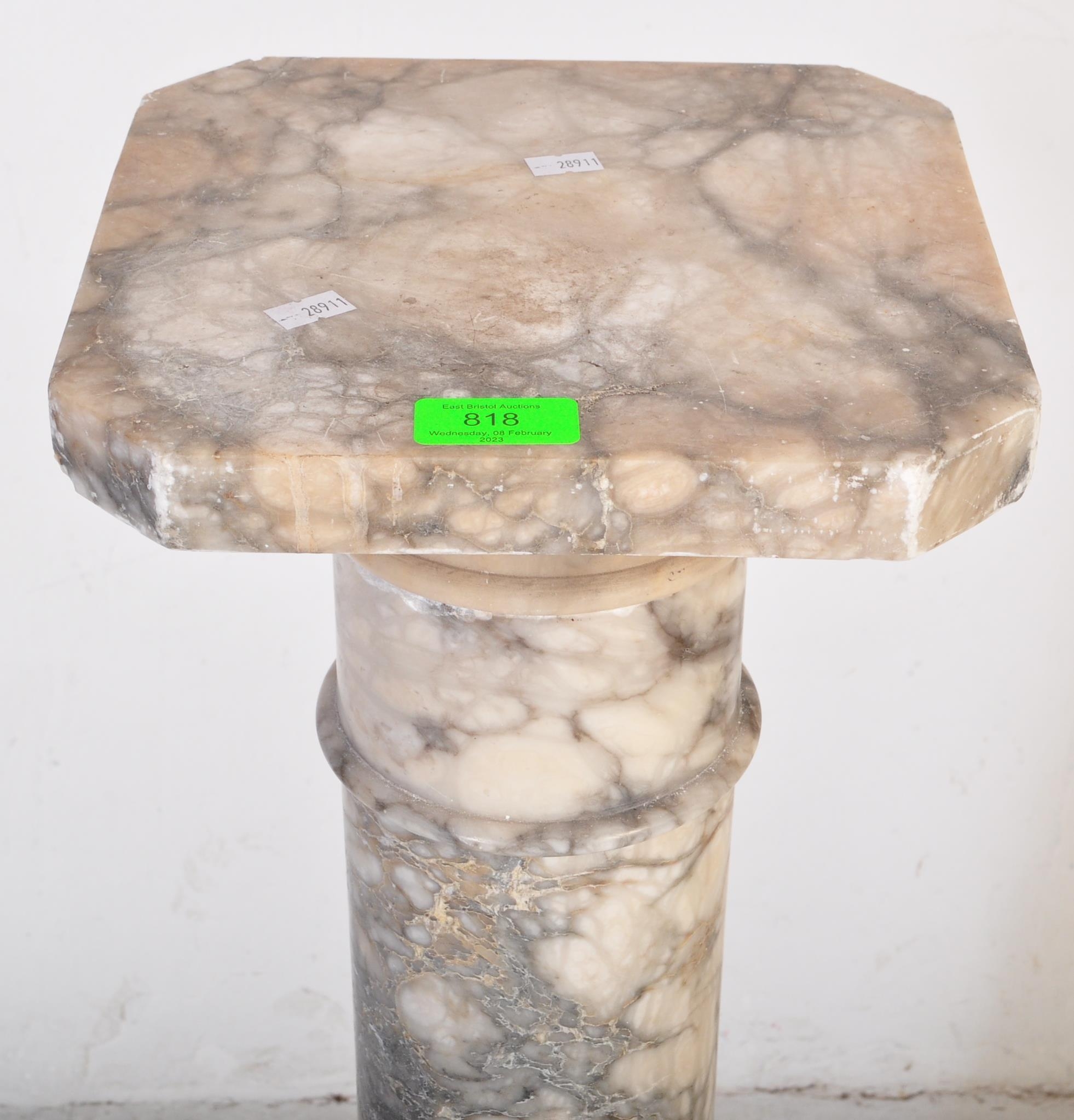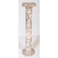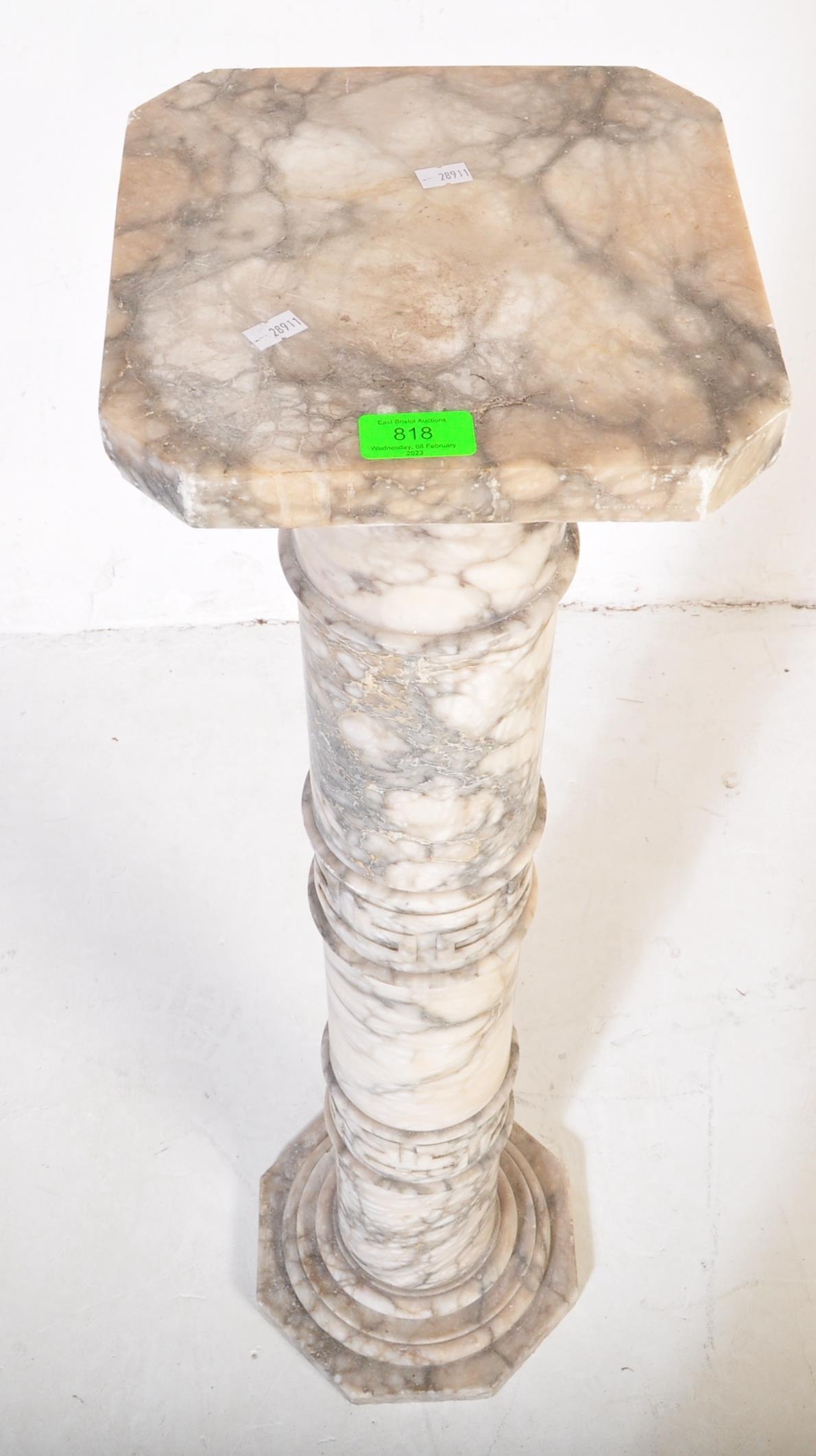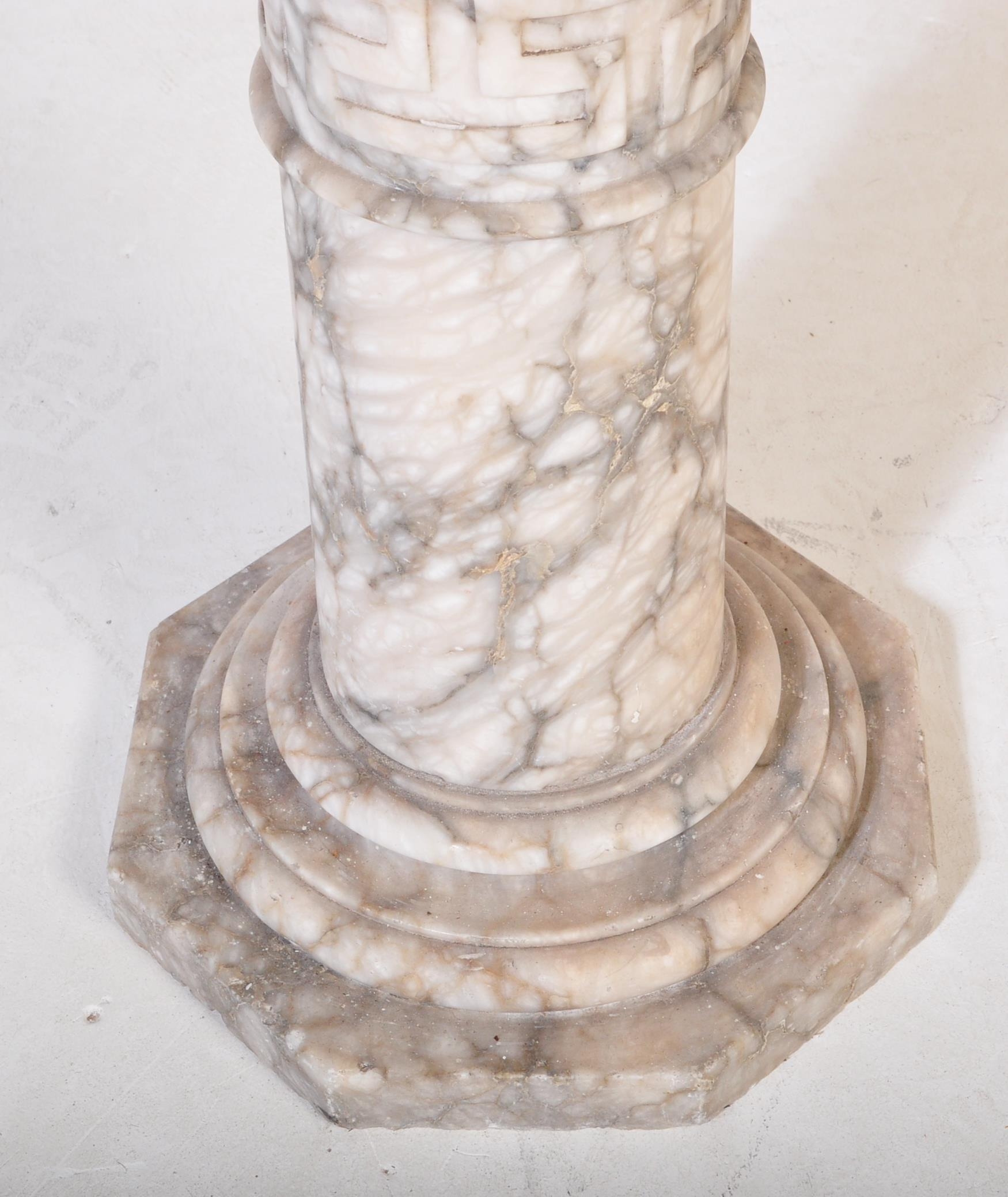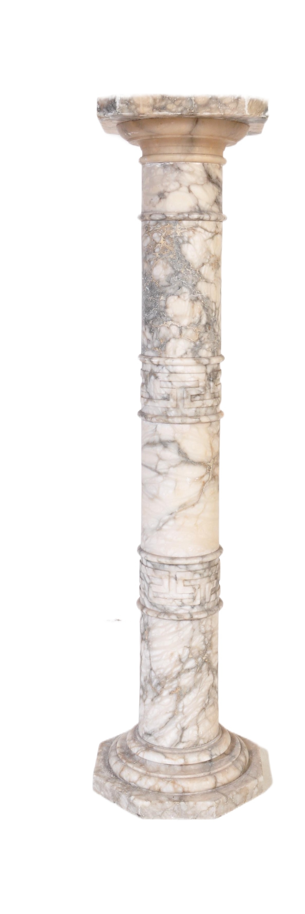 A 20th century carved white marble column torchere stand / bust stand / jardinière planter stand. The stand having a squared top over a turned column with Greek key details on an octagonal base. Measures approx; 106cm x 24cm diameter.