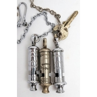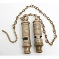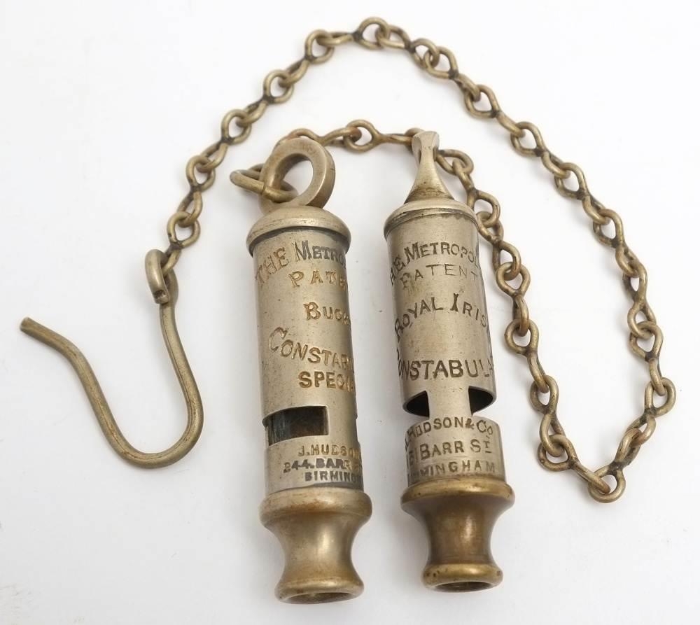 An early 20th century Royal Irish Constabulary and a Bucks Constabulary 'Metropolitan' Police Whistle by J Hudson & Co, Birmingham: the latter with chain (2)
