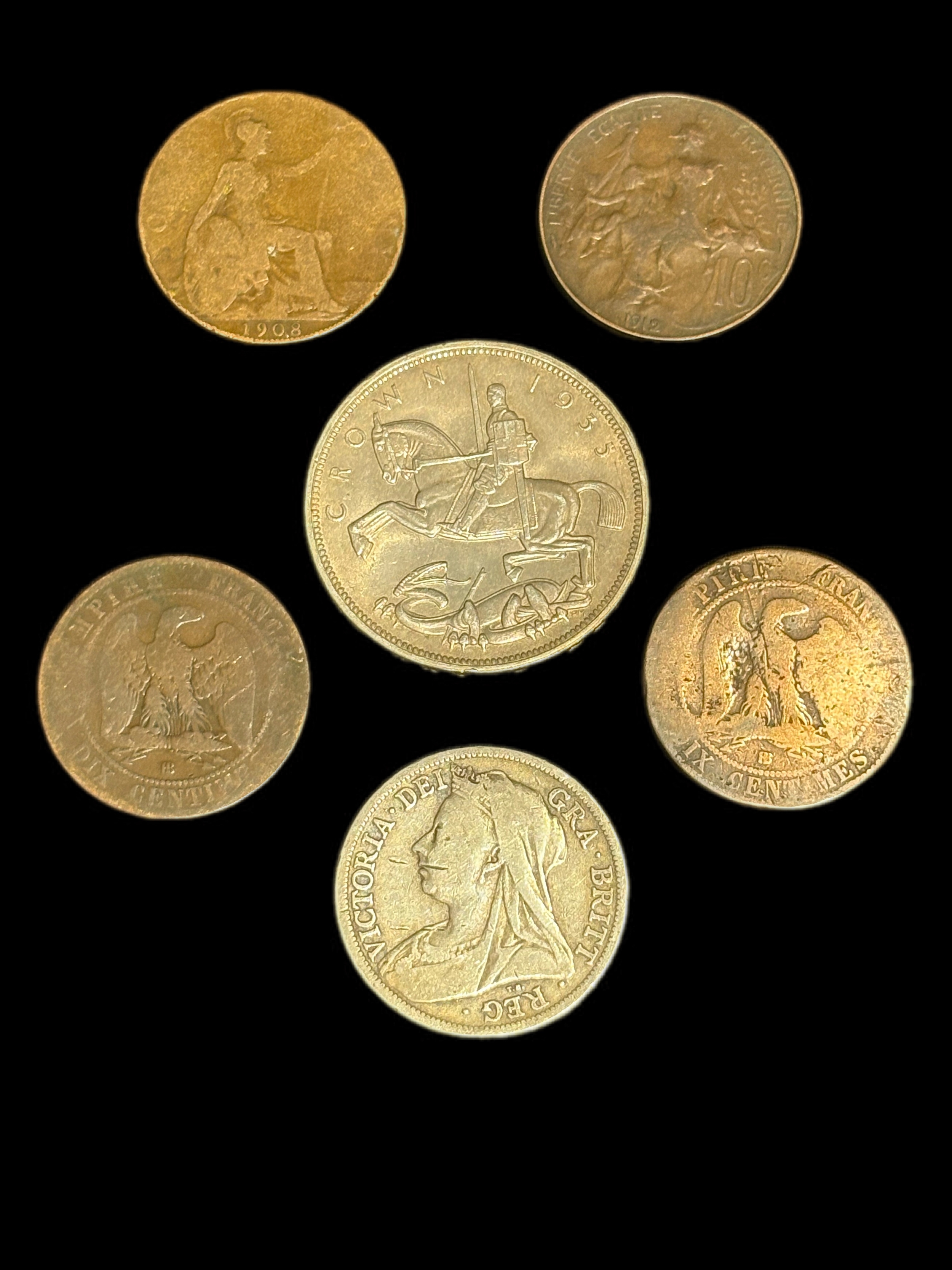 Group of old coins 2 sided penny etcOld 2 side one penny piece dated 1908 and 1918