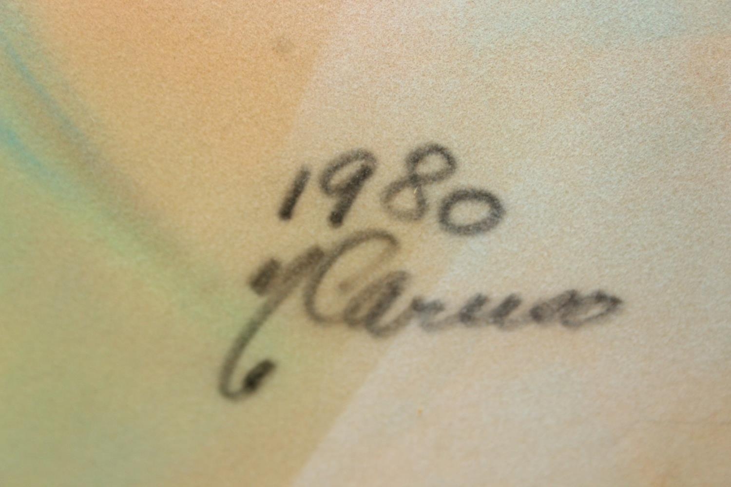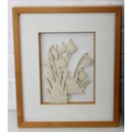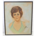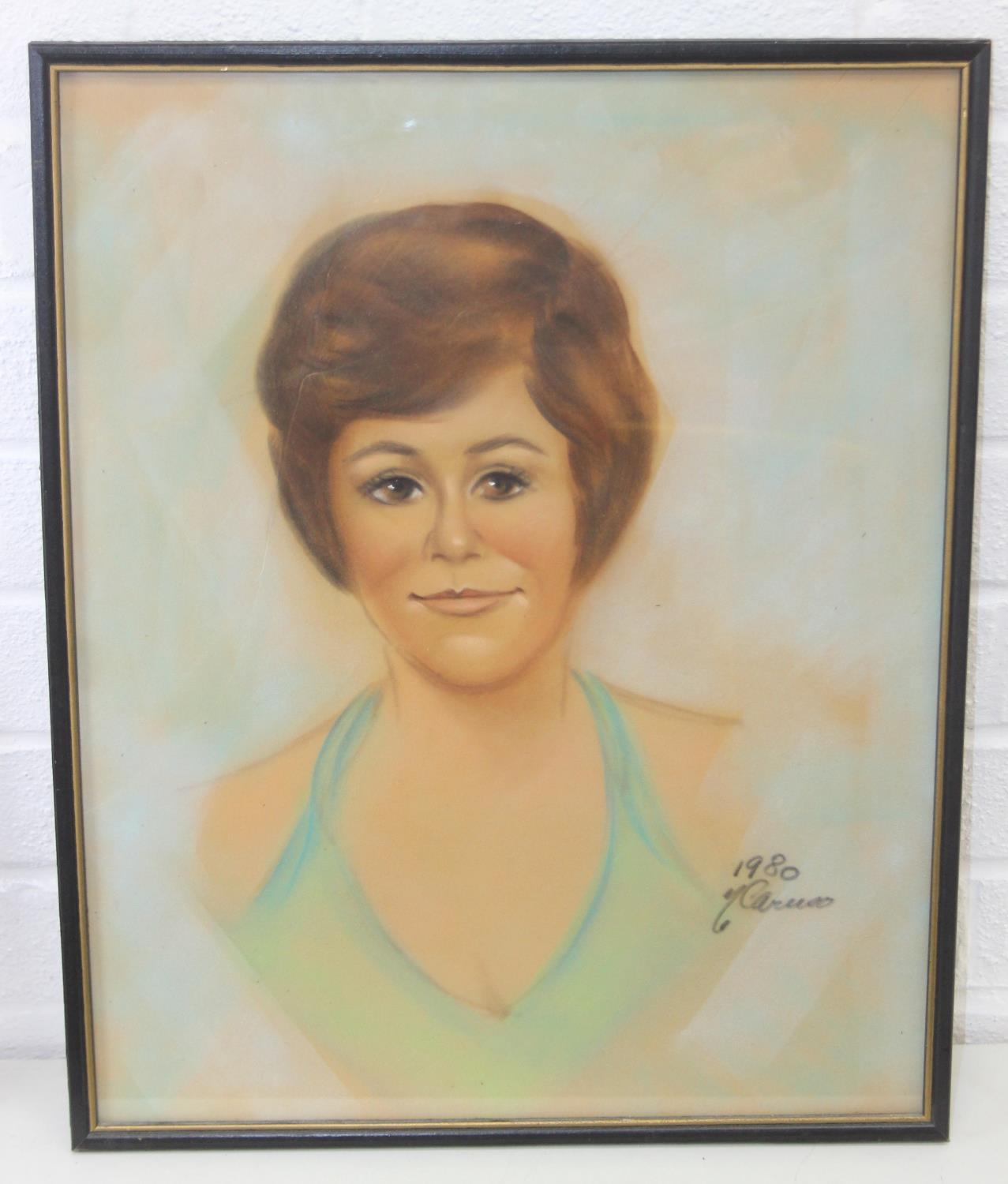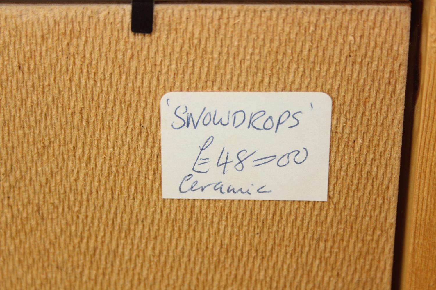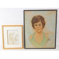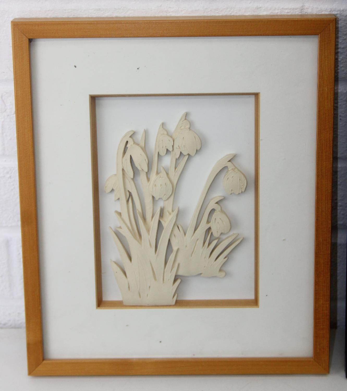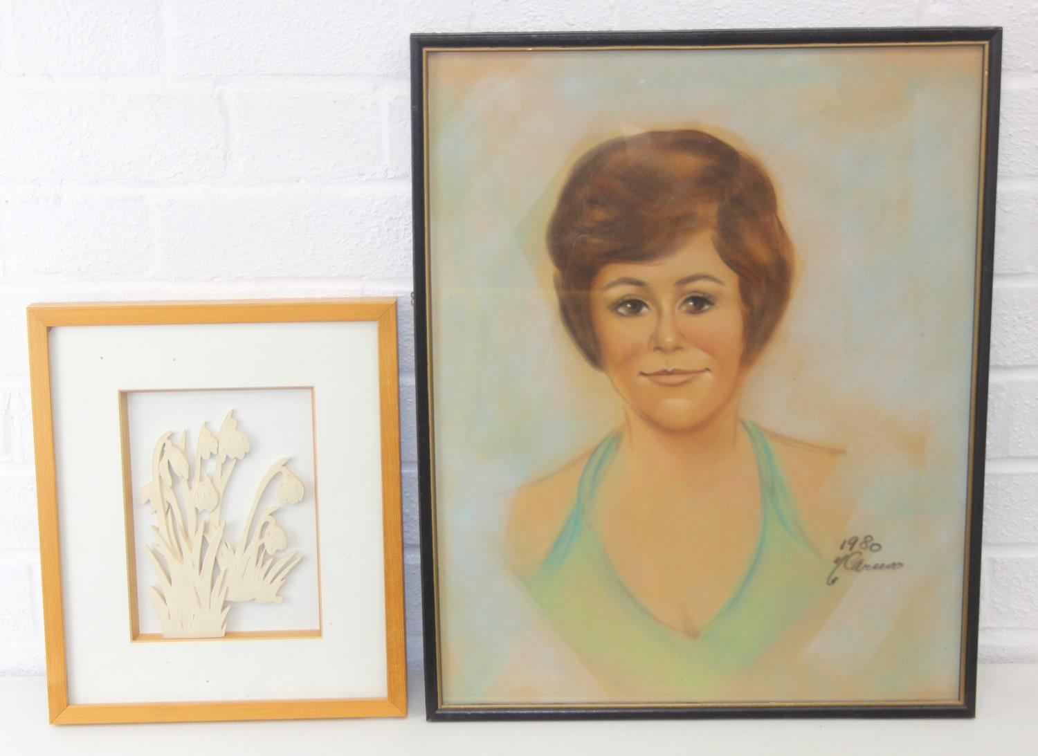 A retro 1980's portrait of a female, believed to be pastel on felt, indistinctly signed lower right and dated 1980, and a framed unglazed ceramic sculpture of snowdrops, unsigned, the largest 53cm x 43cm [2]