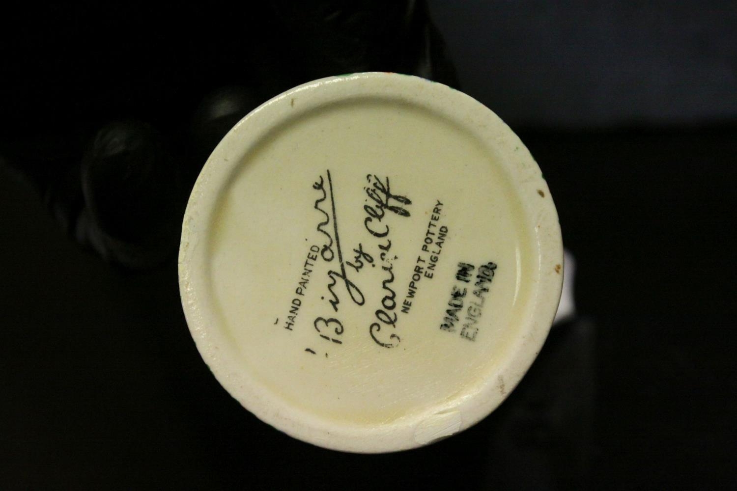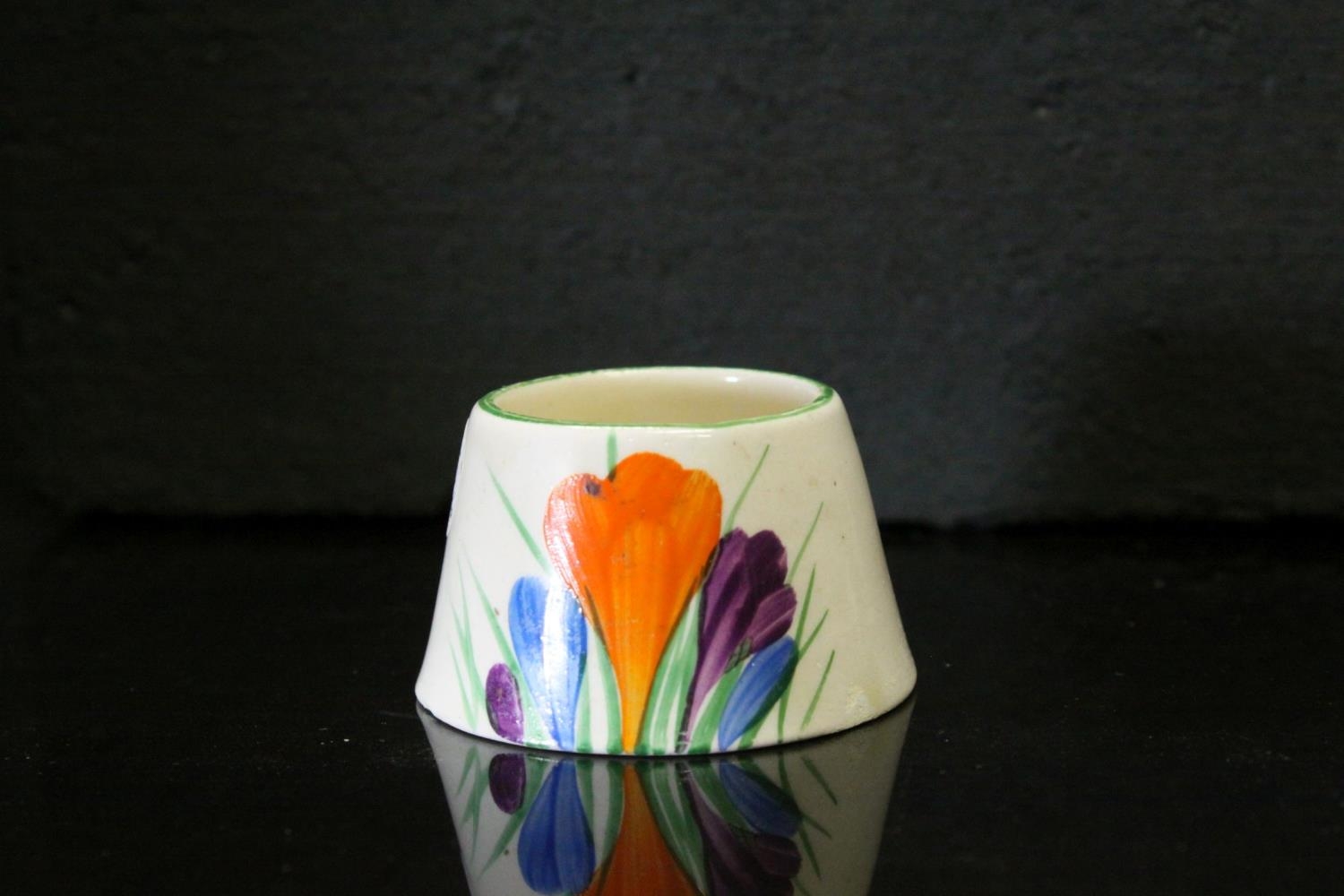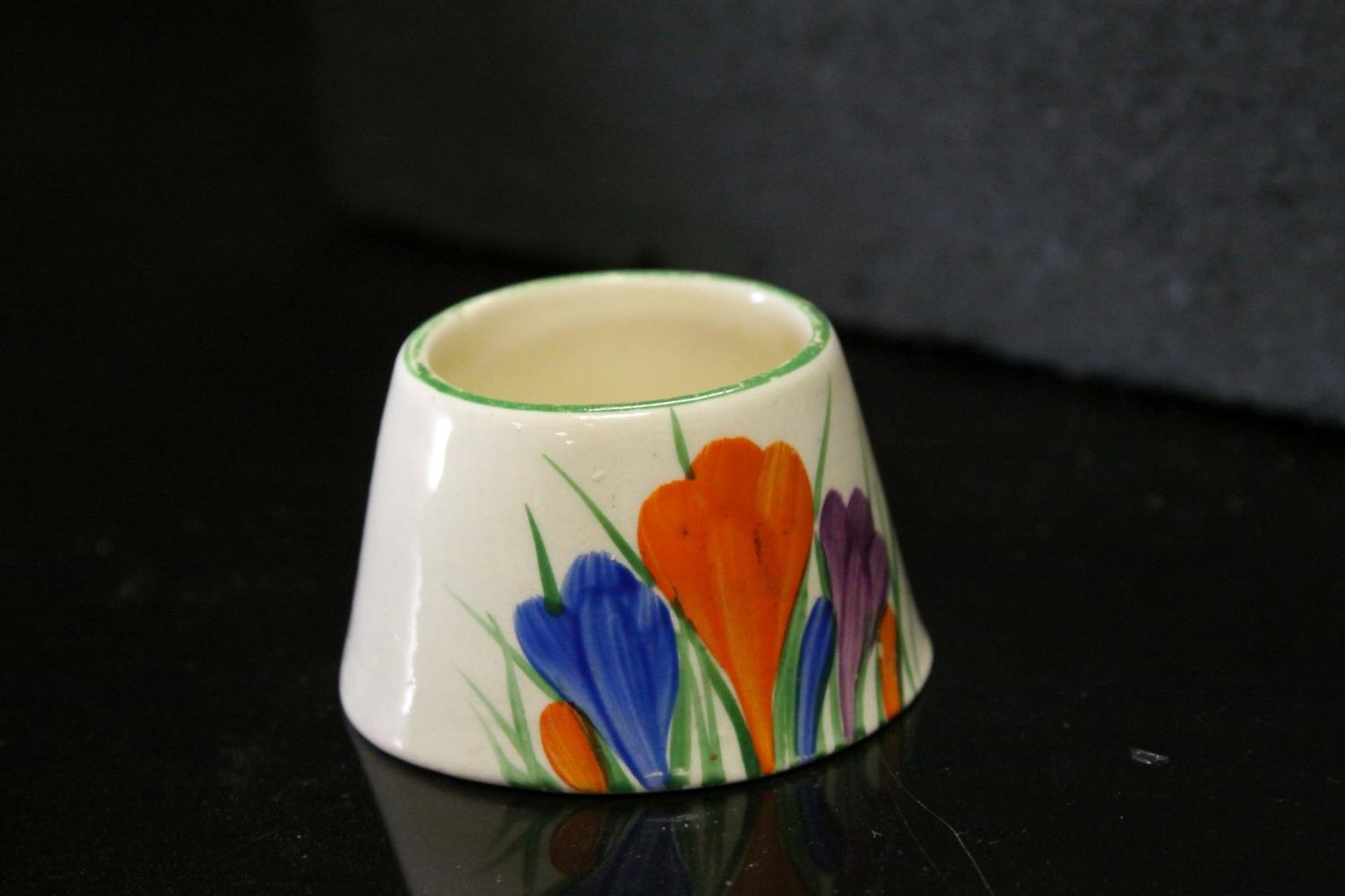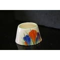 A Clarice Cliff Bizarre Crocus pattern mustard pot lacking lid.