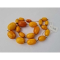 A GRADUATED OVAL AMBER BEADS STRUNG ON WIRE LARGEST BEAD 26 MM X 17.7 MM DIA 17 INCHES IN LENGTH - 36 GMS