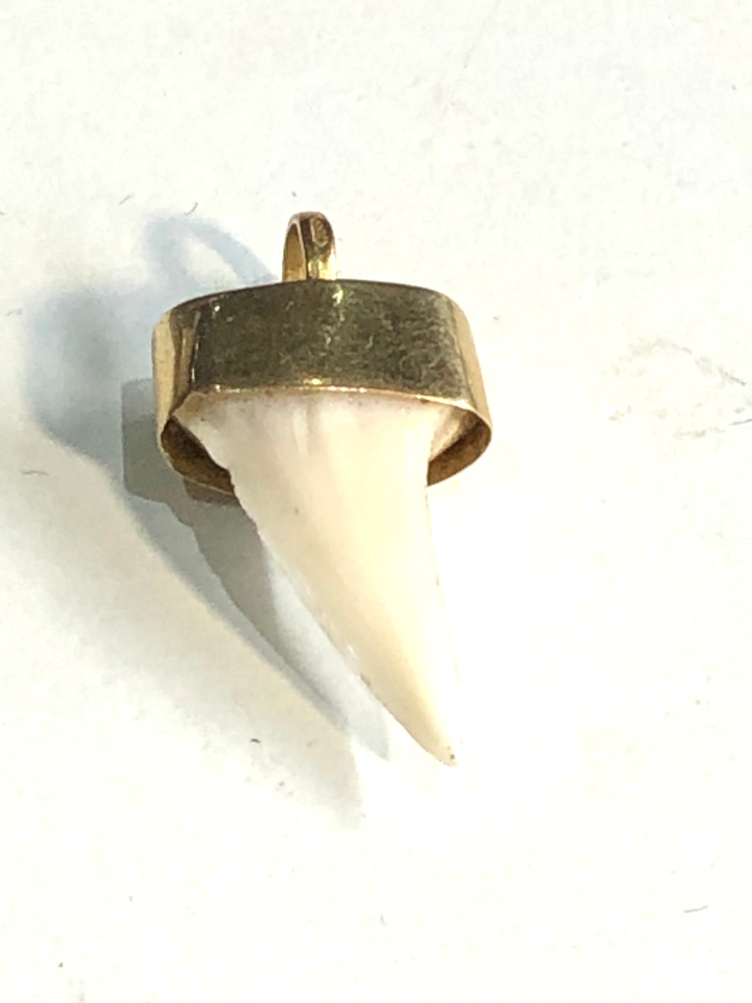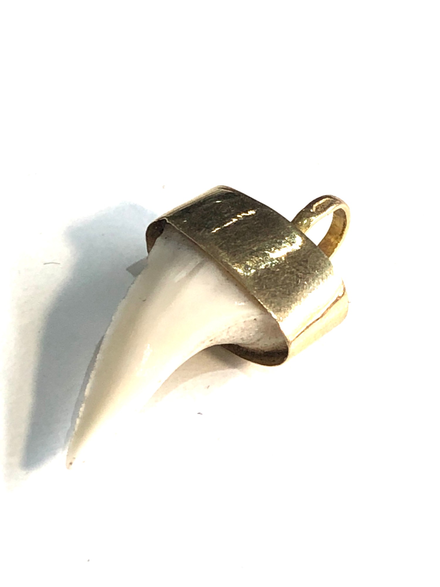 Antique 18ct gold mounted sharks tooth pendant measures approx 2.8cm drop by 1.4cm wide weight 2g