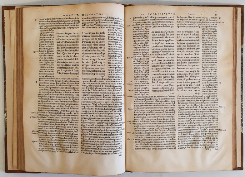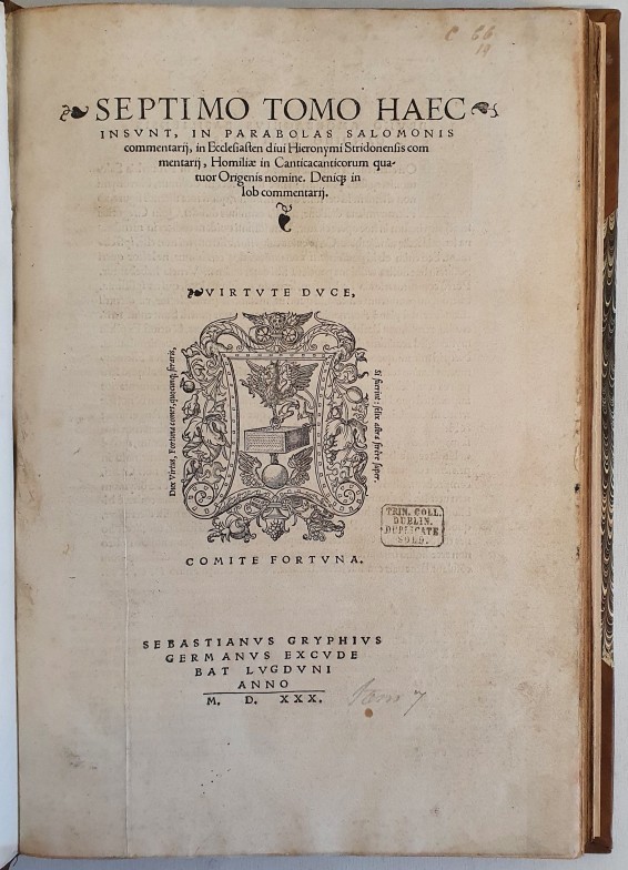 Septimo Tomo Haec insunt, in Parabolas Salomonis commētarij, in Ecclesiasten diui Hieronymi Stridonensis commentarij, Homiliae in Canticacanticorum" - commentaries on the "Parables of Solomon" and the "Ecclesiastes" by St. Jerome, as well as homilies on the "Song of Songs". Published by Sebastianus Gryphius, German. Lugovni (Lyon, France), 1530. Ex-libris stamp for "Trinity Coll. Dublin. Duplicate Sold". Large folio, half calf with gilt title and date on spine with five raised bands.