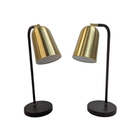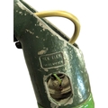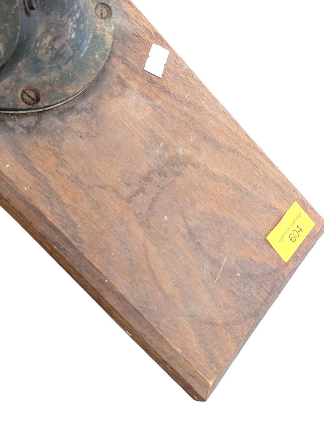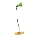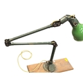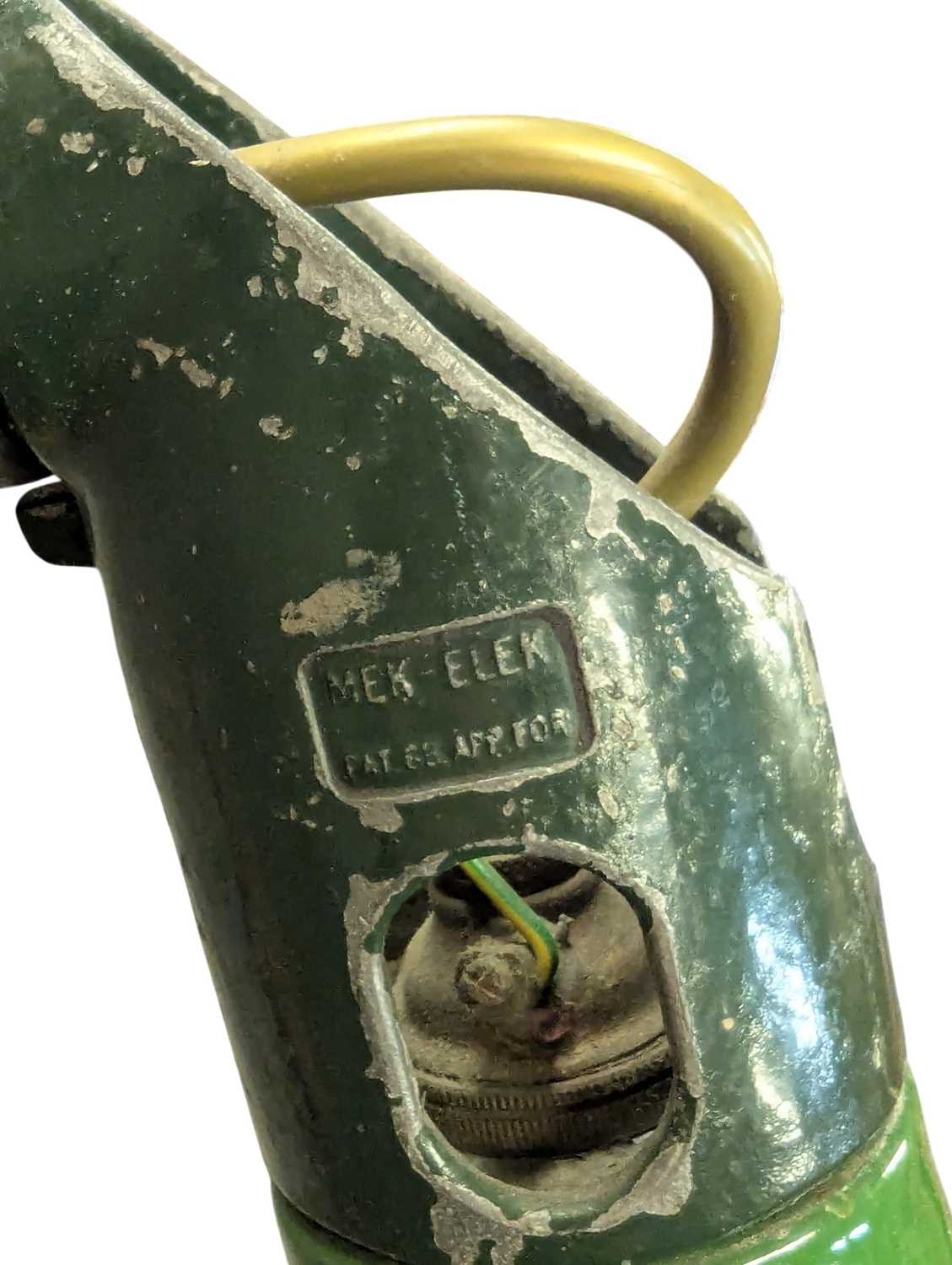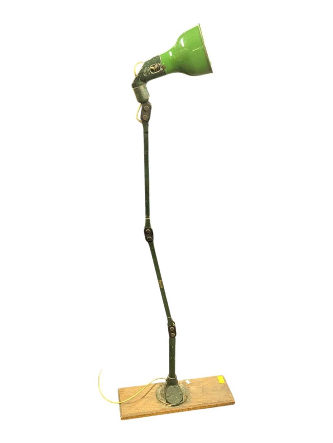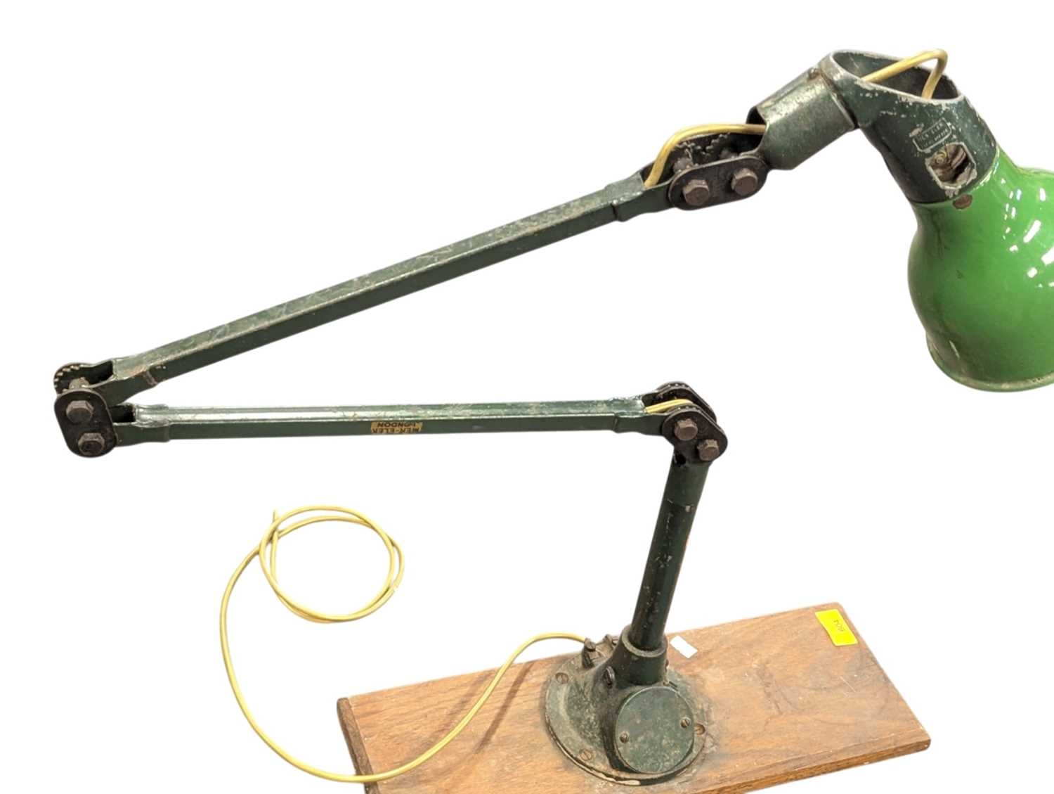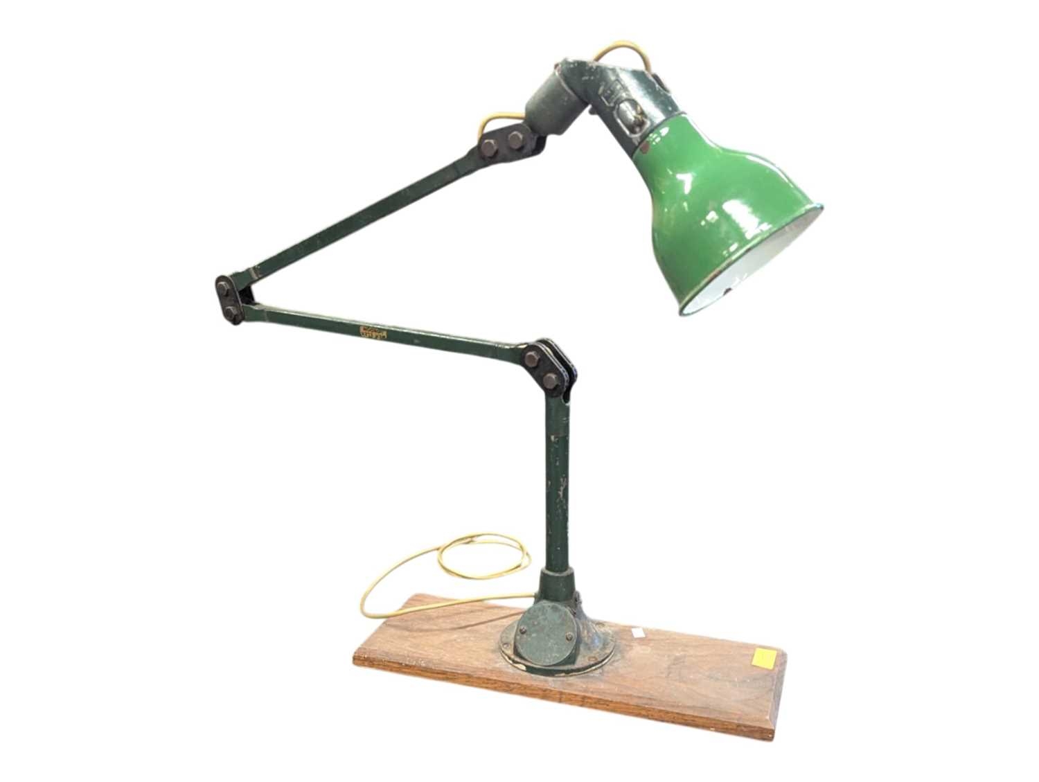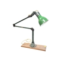 Mek-Elek - A retro early 20th century circa 1940s brass industrial two part adjustable arm lamp light. The light having a conical shade over a two part adjustable arm with wood plinth base.
