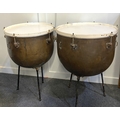 Two vintage English made Premier Everplay kettle drums on stands, 58cm diameter by 83cm high and 52cm diameter by 80cm high.