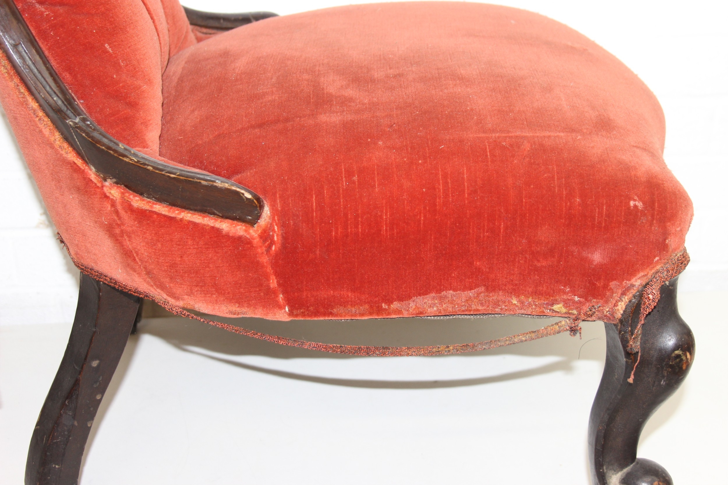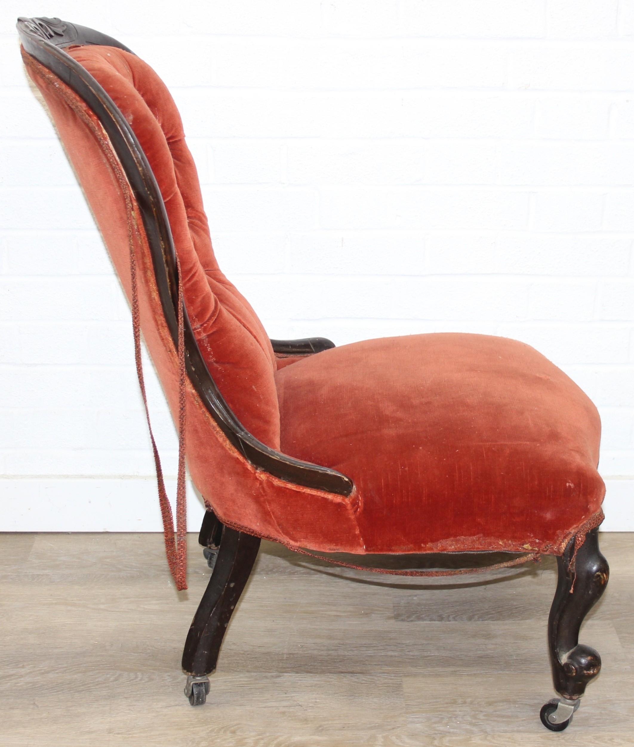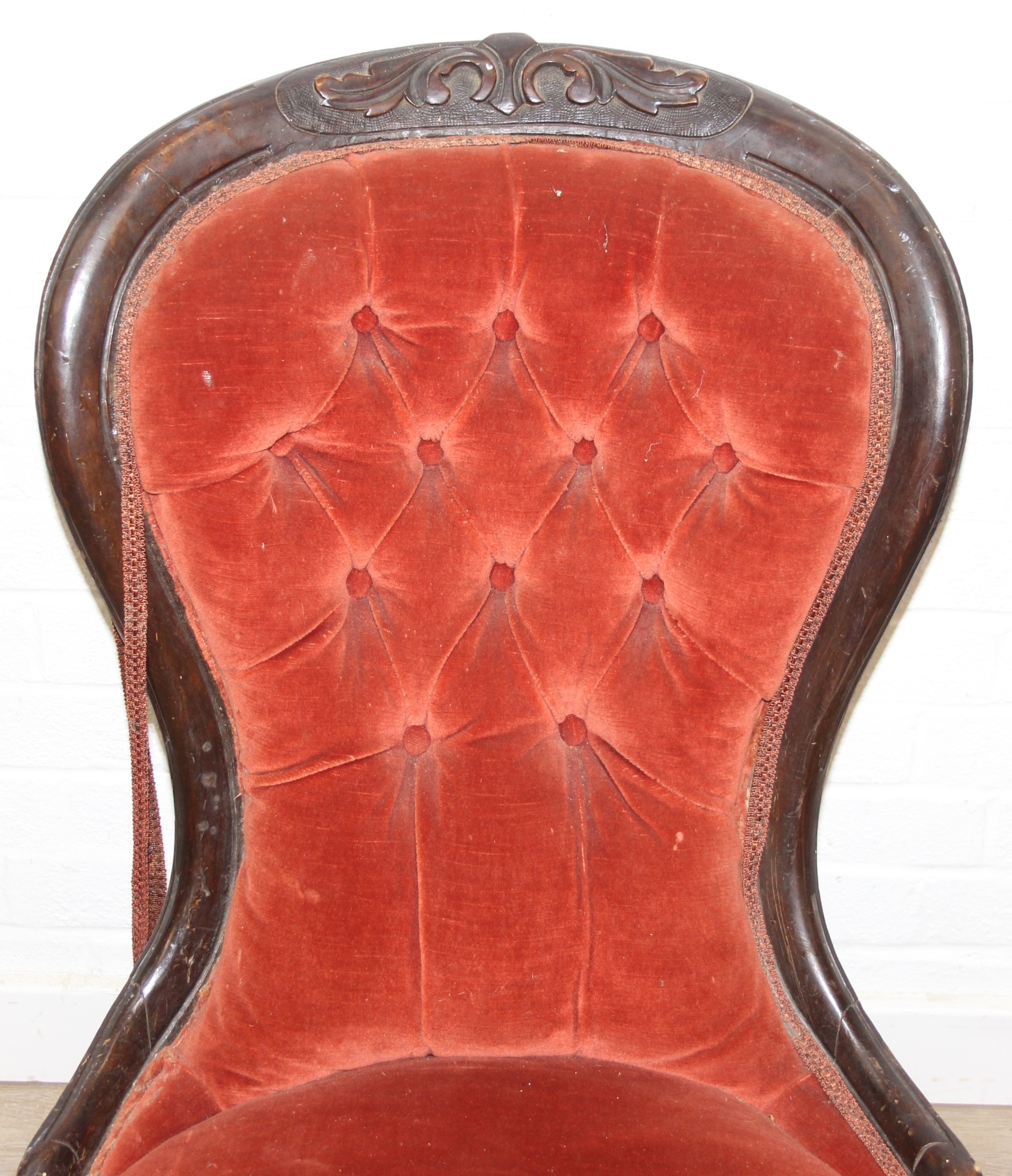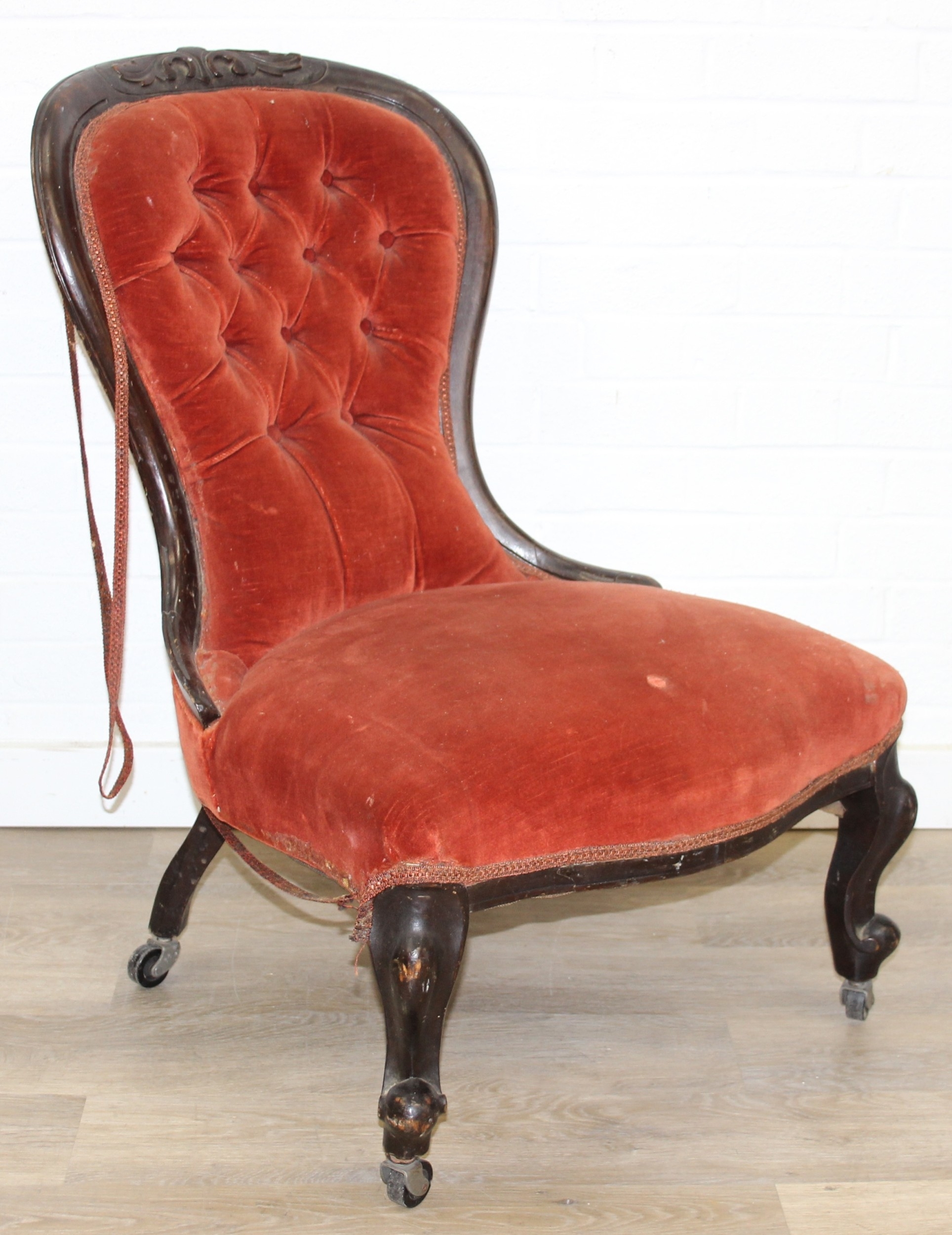 A 19th century low chair with shaped button back and exposed carved frame, 87cm tall