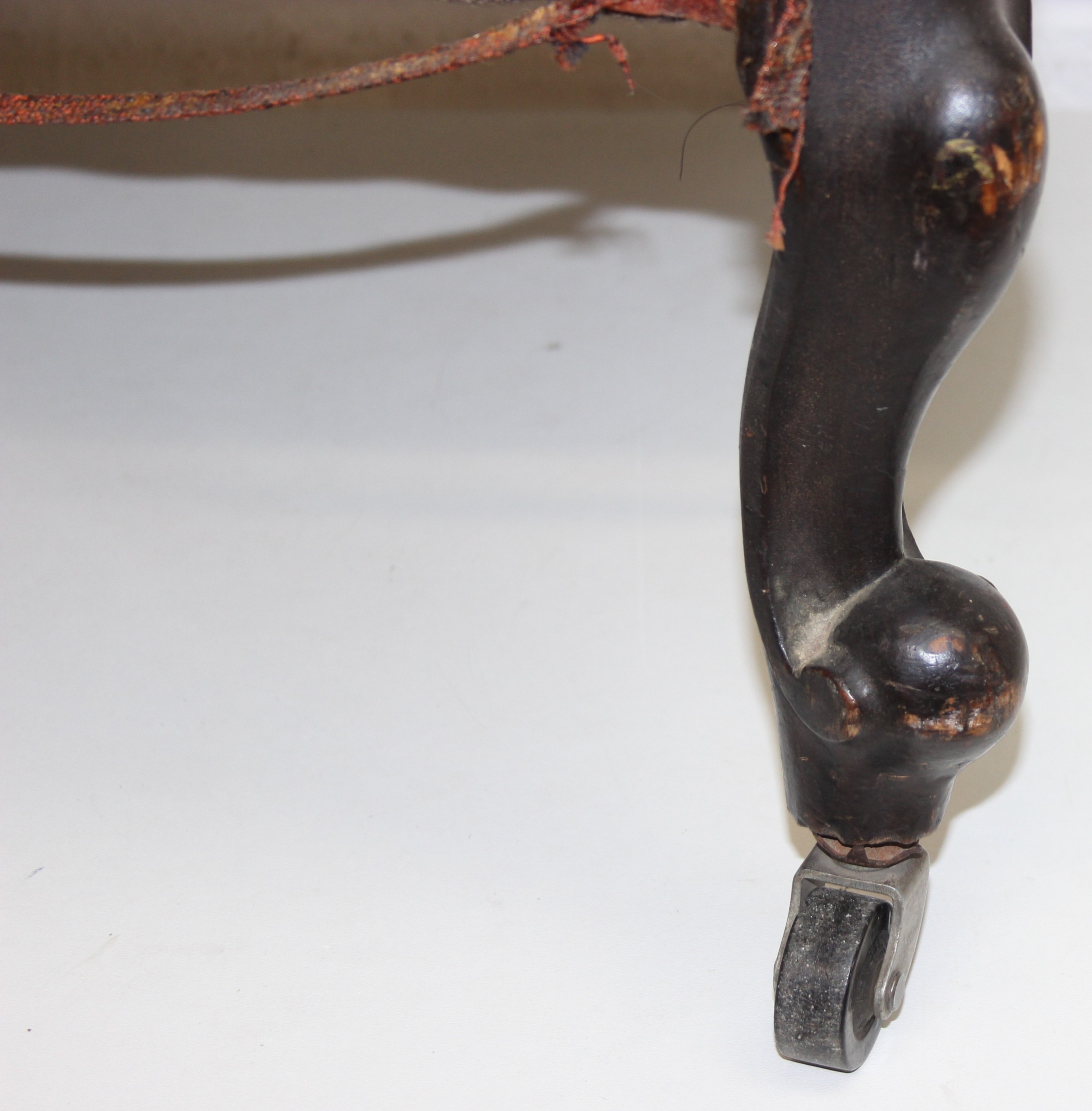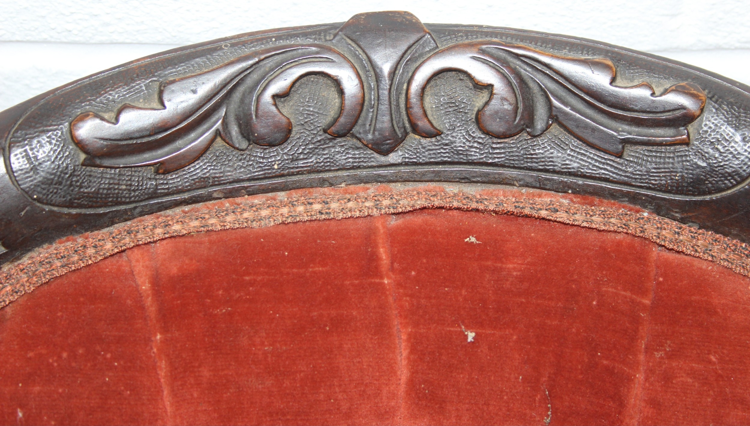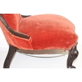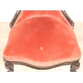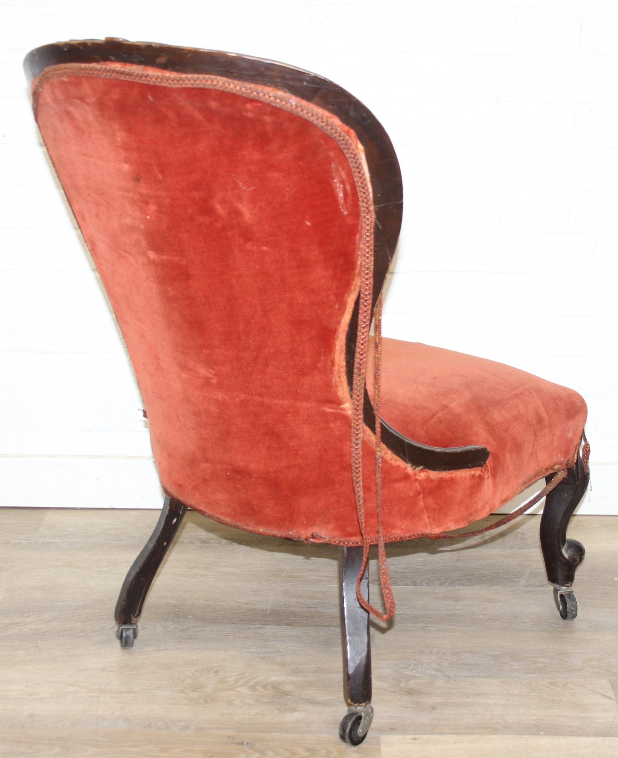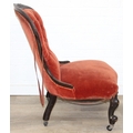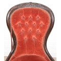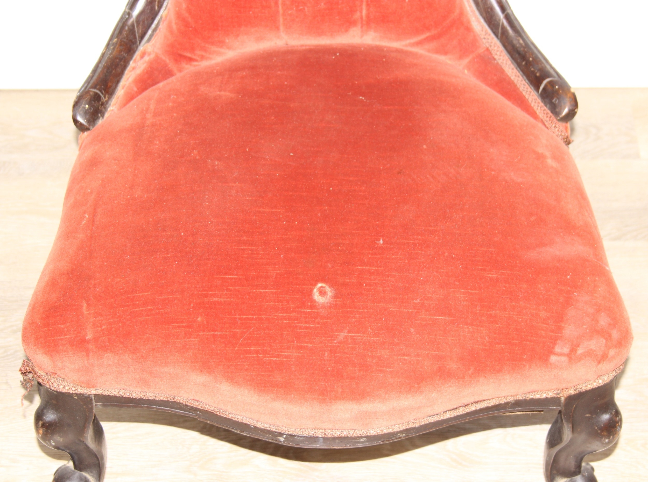 A 19th century low chair with shaped button back and exposed carved frame, 87cm tall