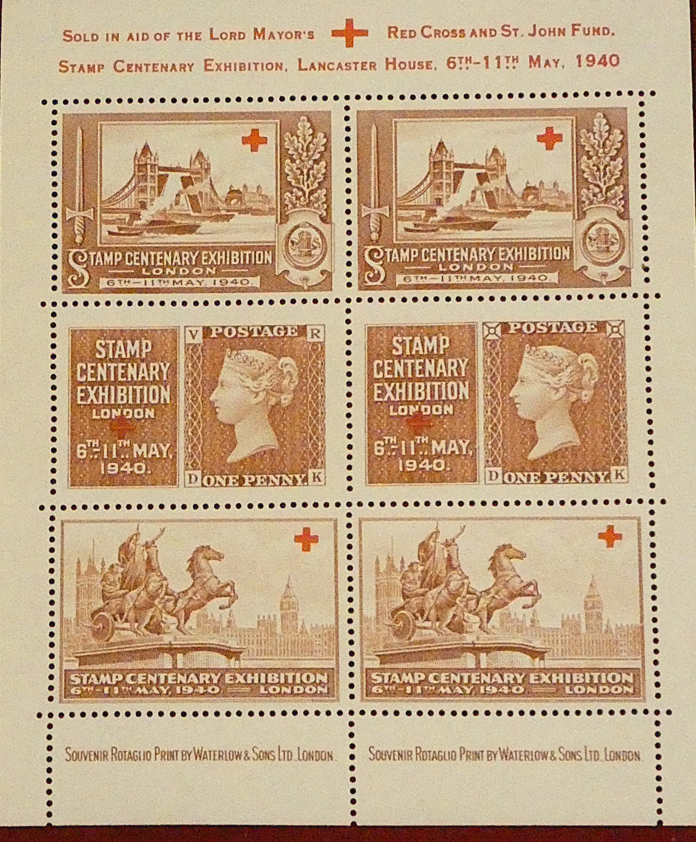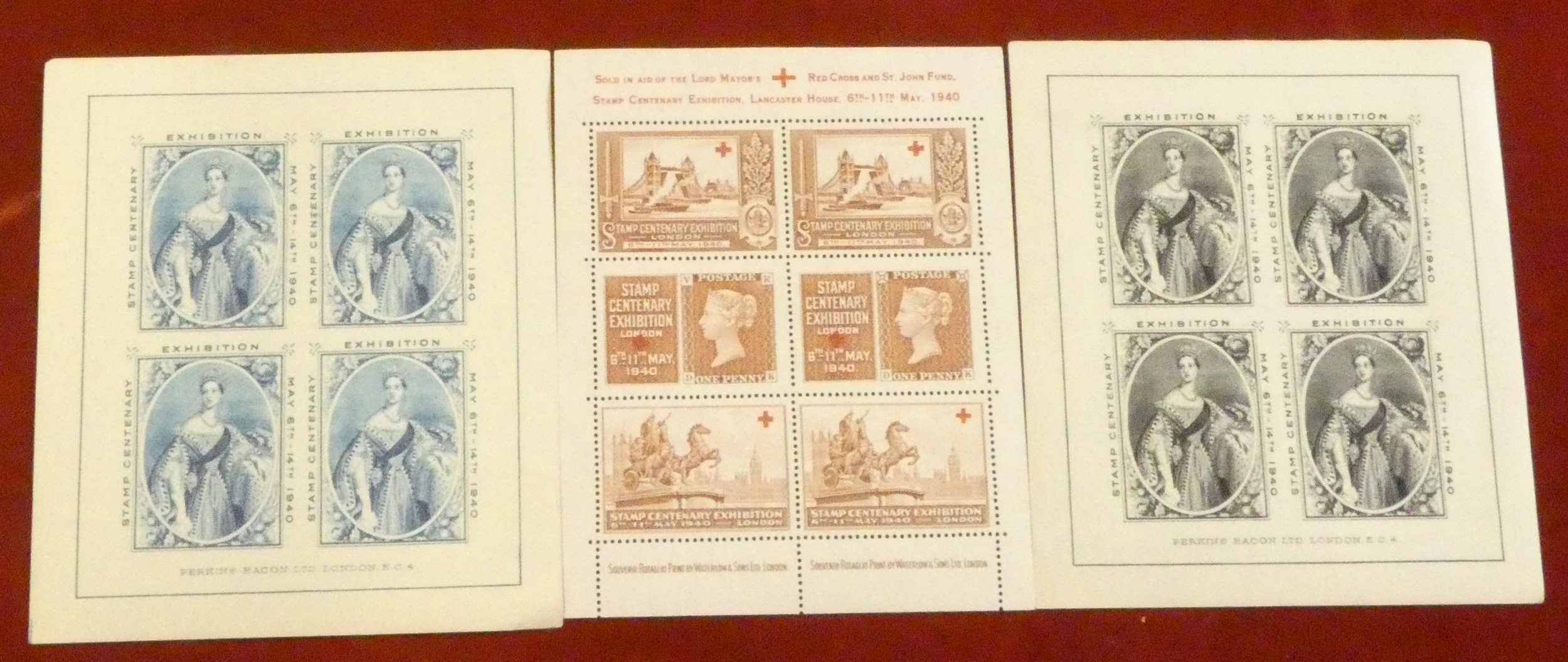 GB 1940 Stamp Centenary exhibition on Perkins Bacon sheets of fins in black, blue and Waterlow sheet in aid of the Red Cross. All three u/m mint.