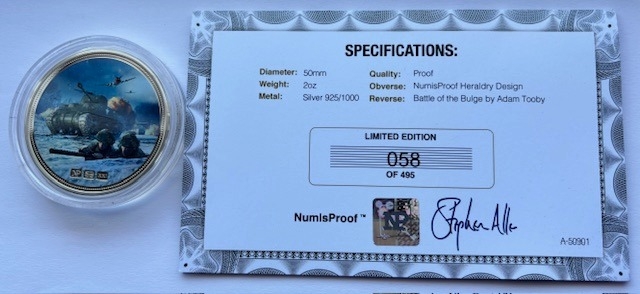 Solid Silver Battle of the Bulge Commemorative Medallion, .925 Silver Proof with colour print, Diameter 50mm, Weight 2oz, COA, Presentation box