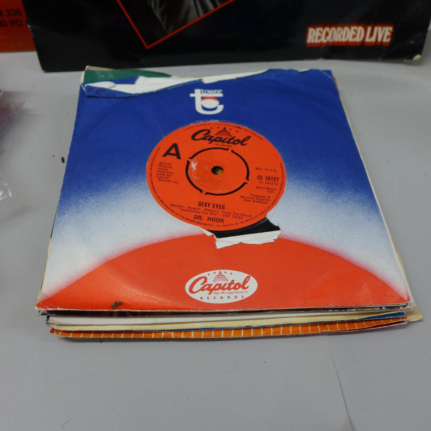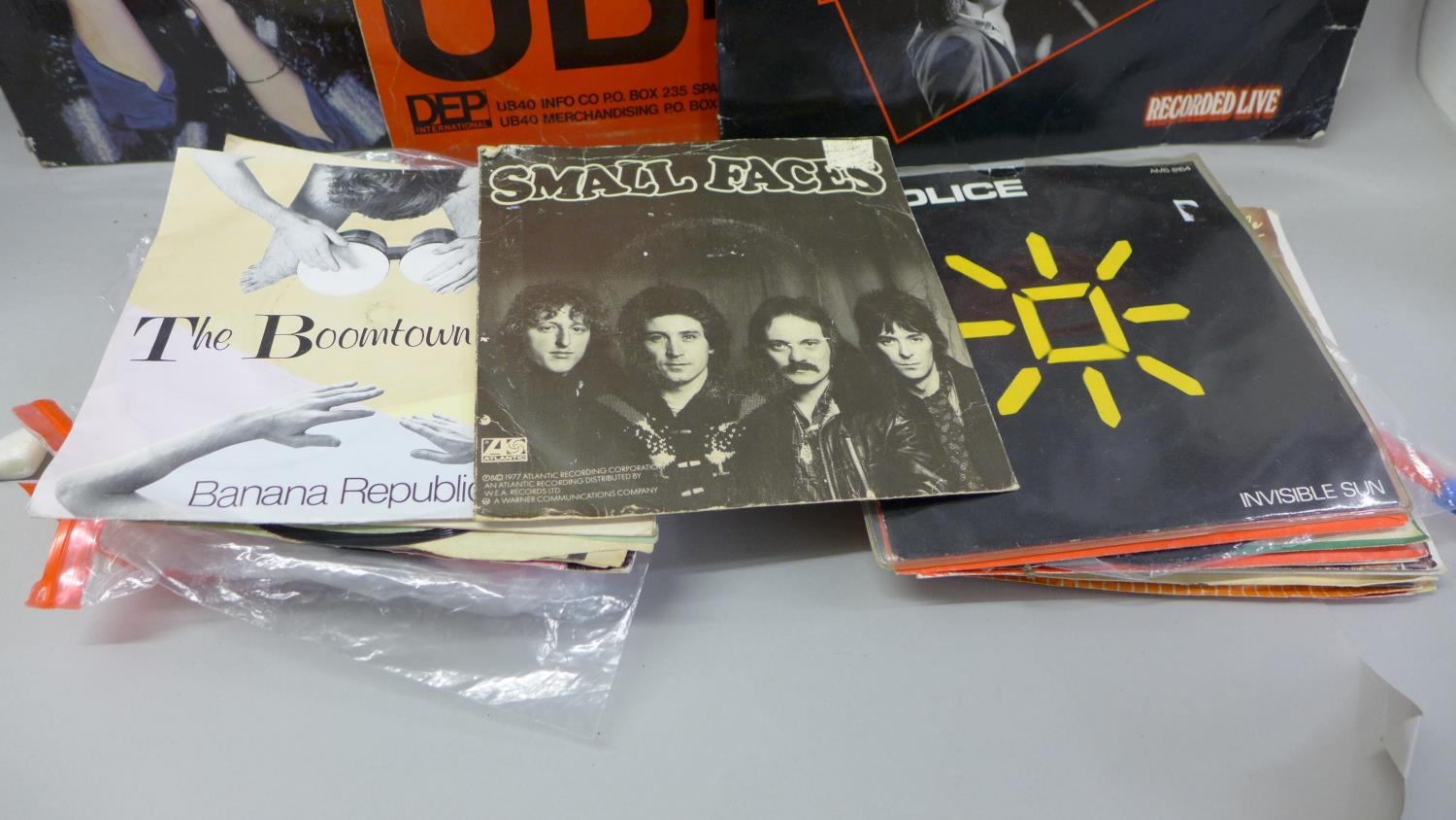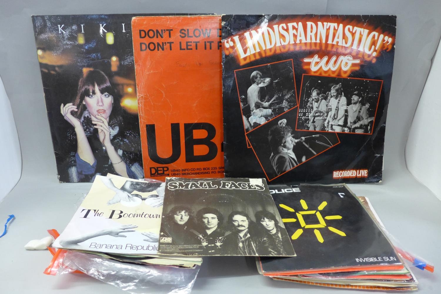 Three LP records including one autographed Lindisfarne and twenty-six 45rpm 7" singles including Small Faces and The Police