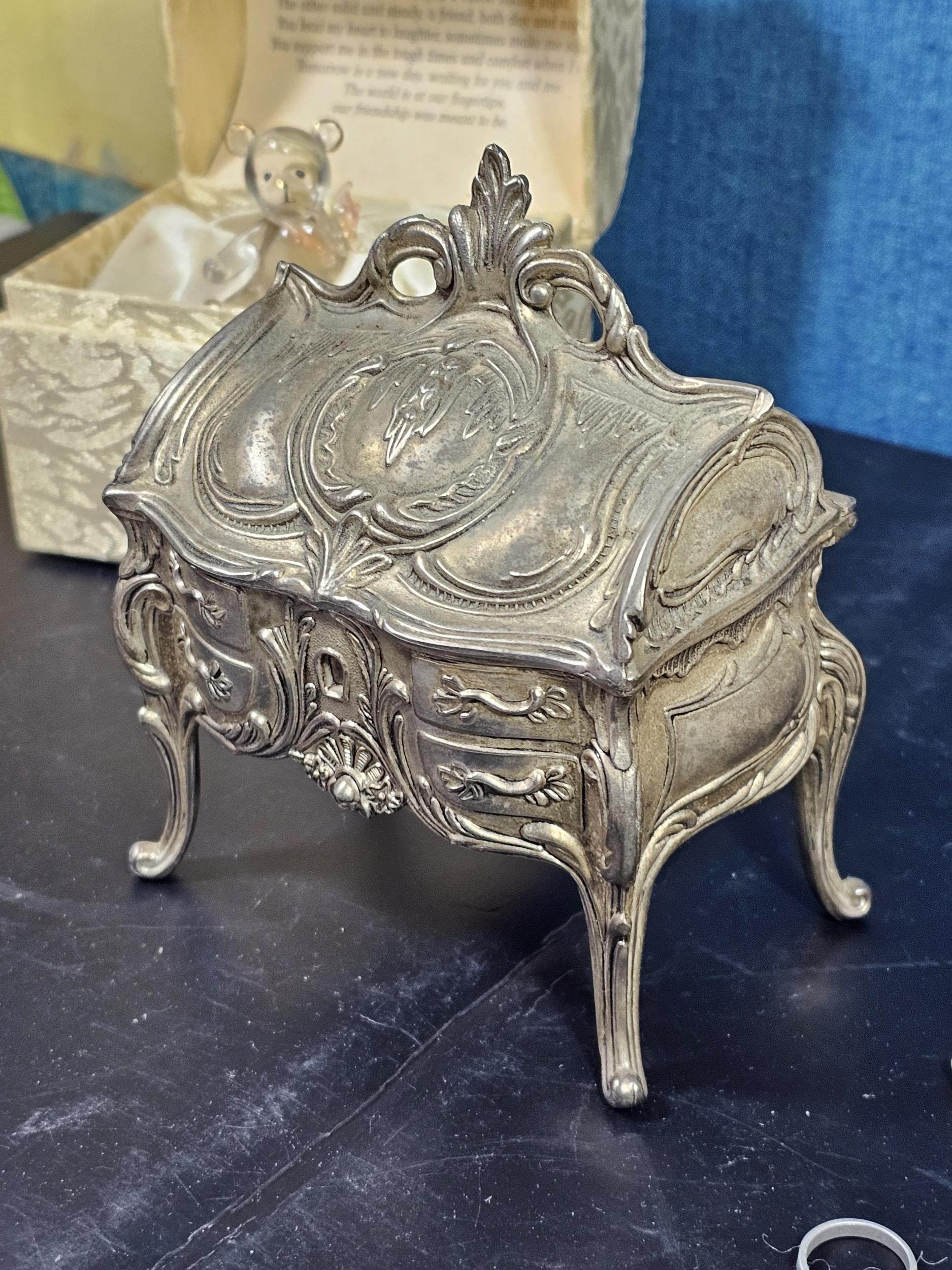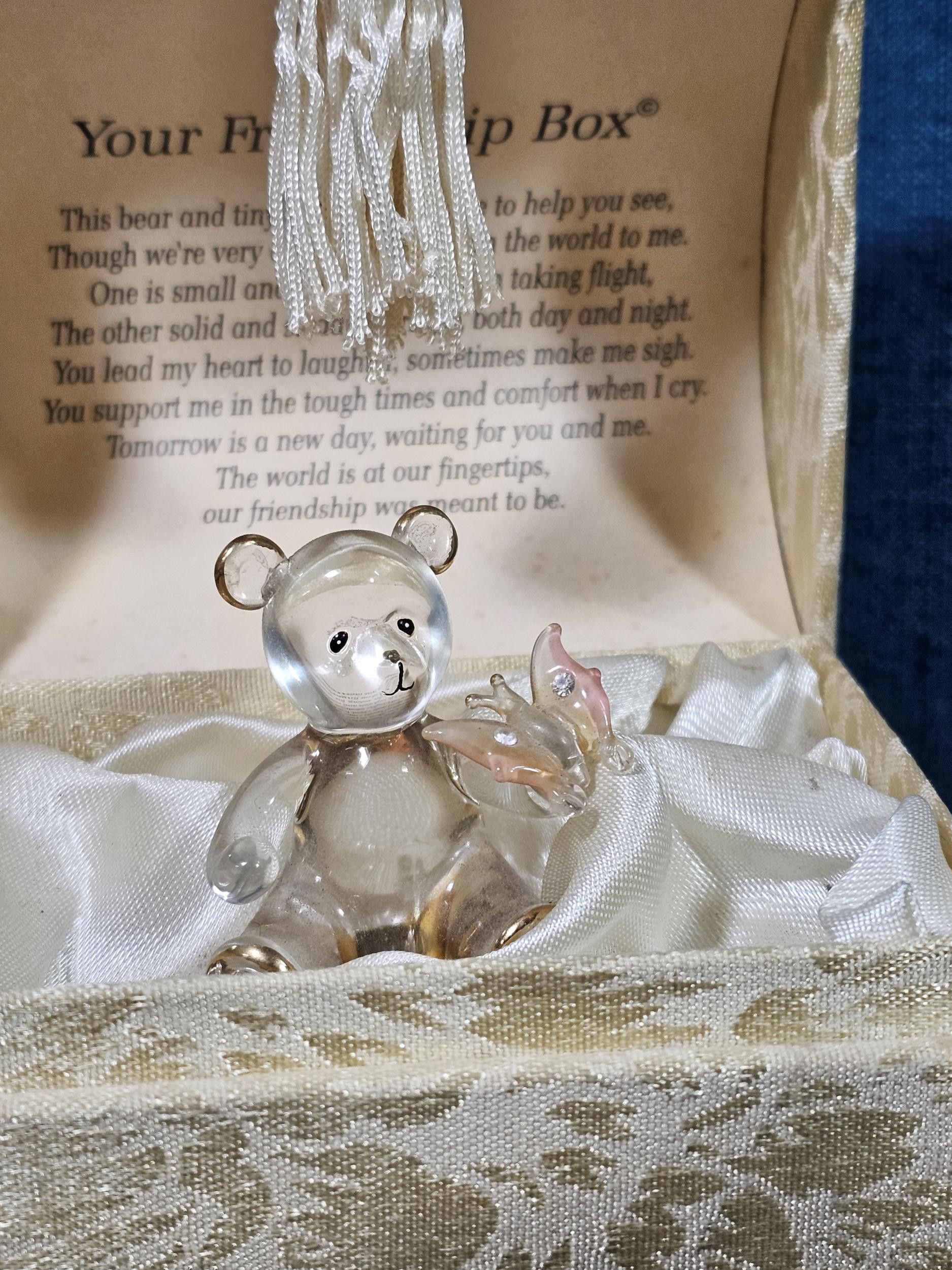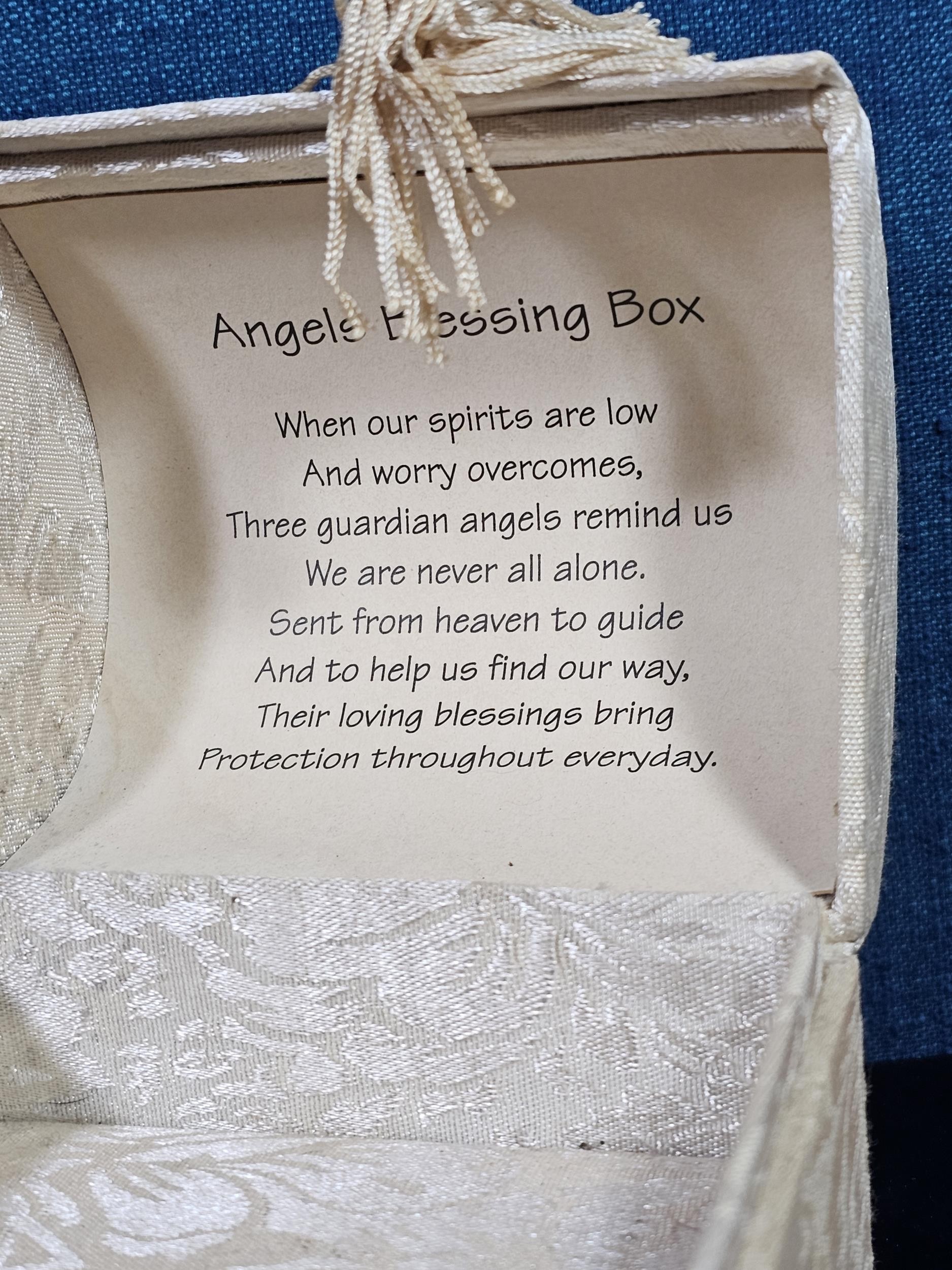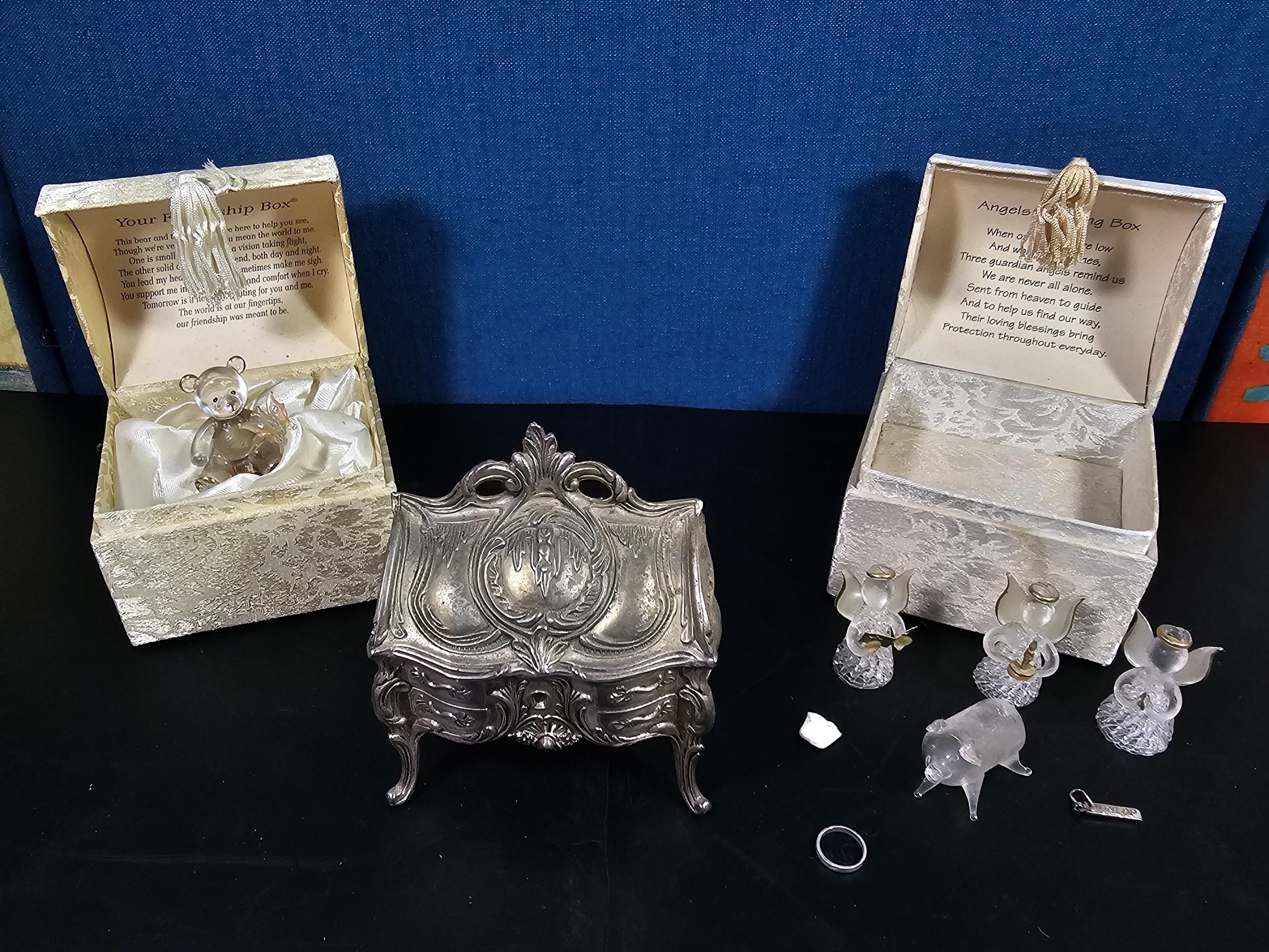 A collection of 3 lidded boxes to include a Angels Blessing box containing glass angels, a friendship box containing a glass teddy bear and butterfly along with a metal lidded trinket box in the form of a bureau in the style of the music box in Beauty and the Beast. The bureau has a height of 15cm with a length of 12cm.