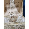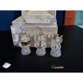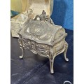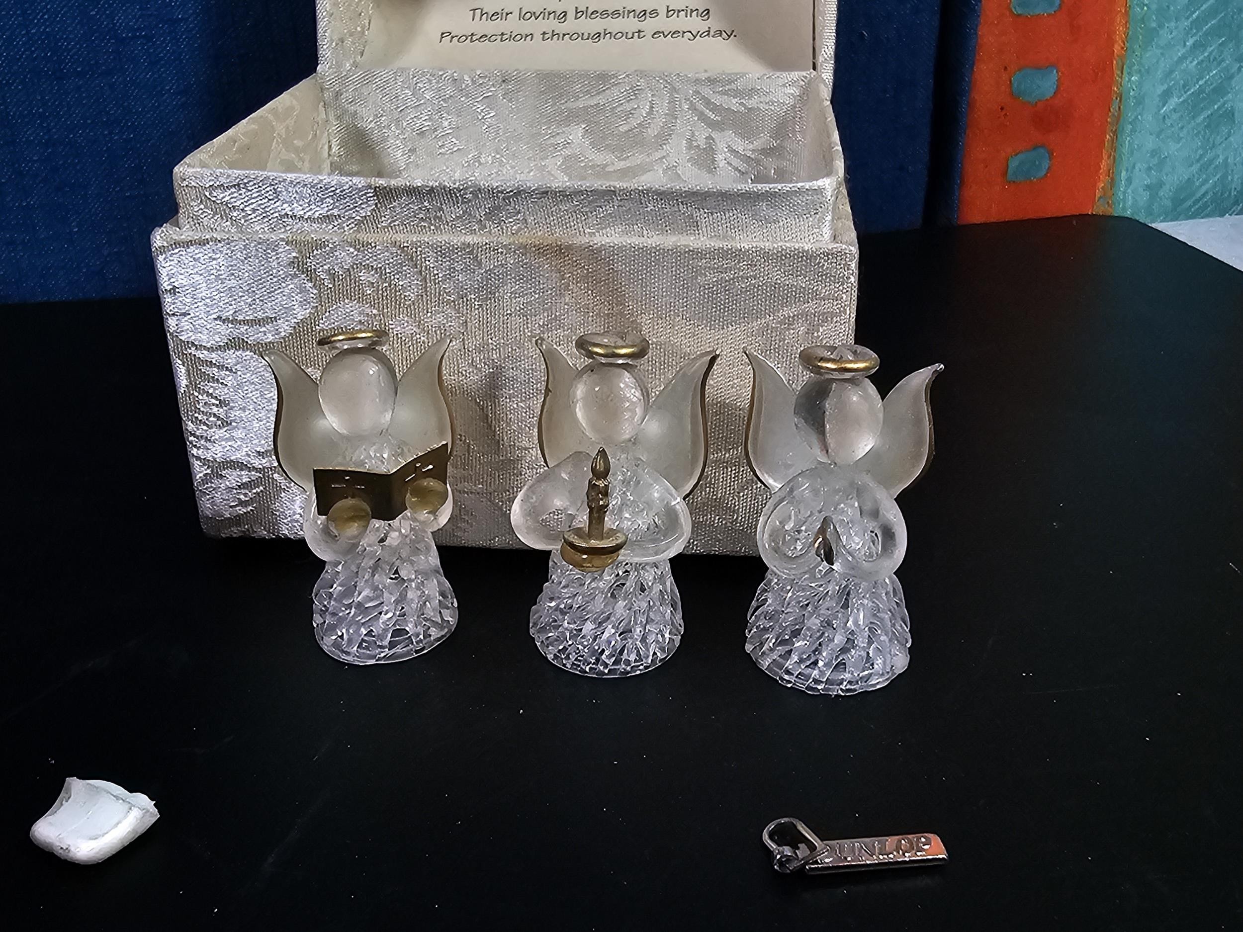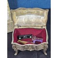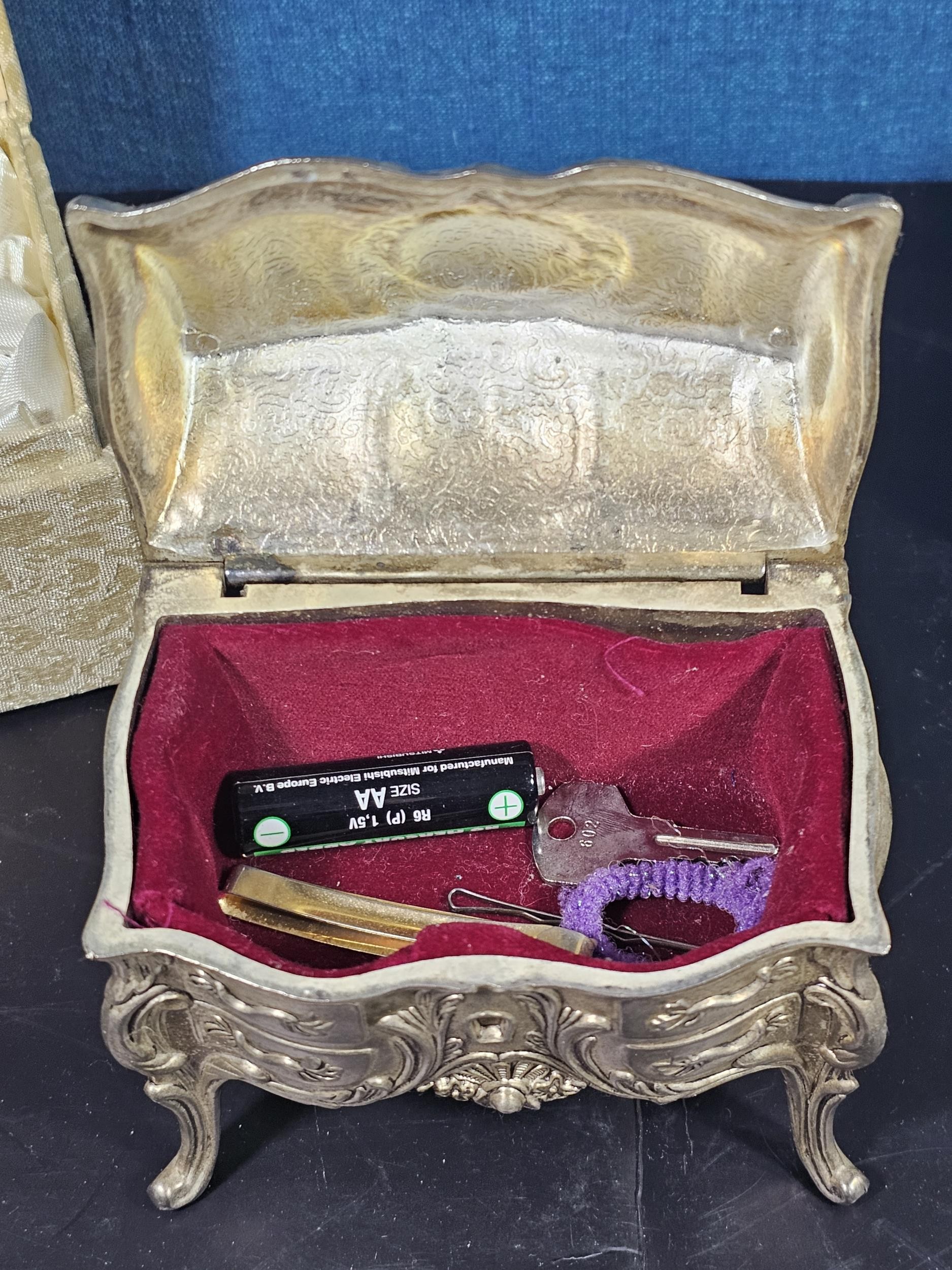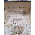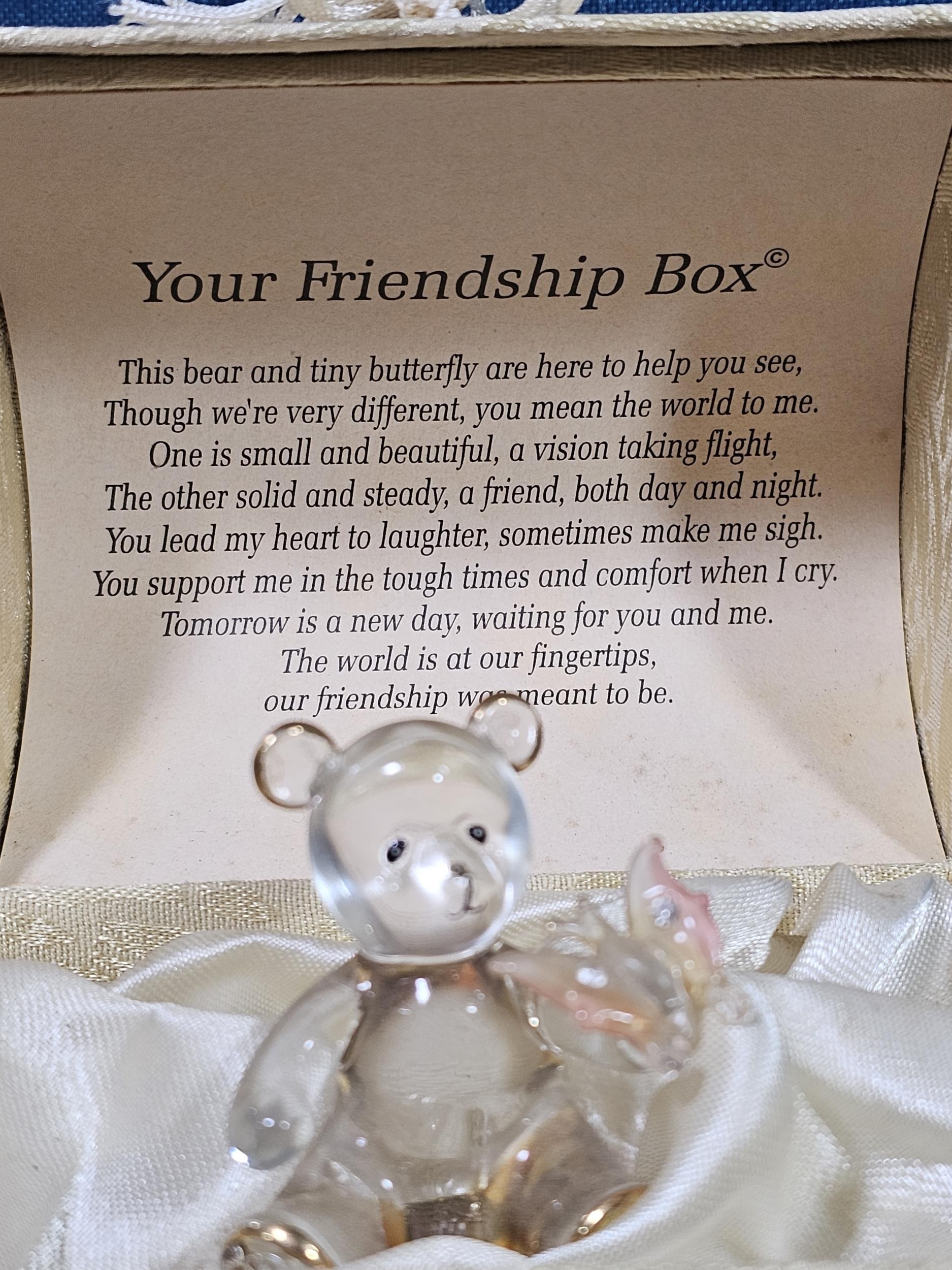 A collection of 3 lidded boxes to include a Angels Blessing box containing glass angels, a friendship box containing a glass teddy bear and butterfly along with a metal lidded trinket box in the form of a bureau in the style of the music box in Beauty and the Beast. The bureau has a height of 15cm with a length of 12cm.