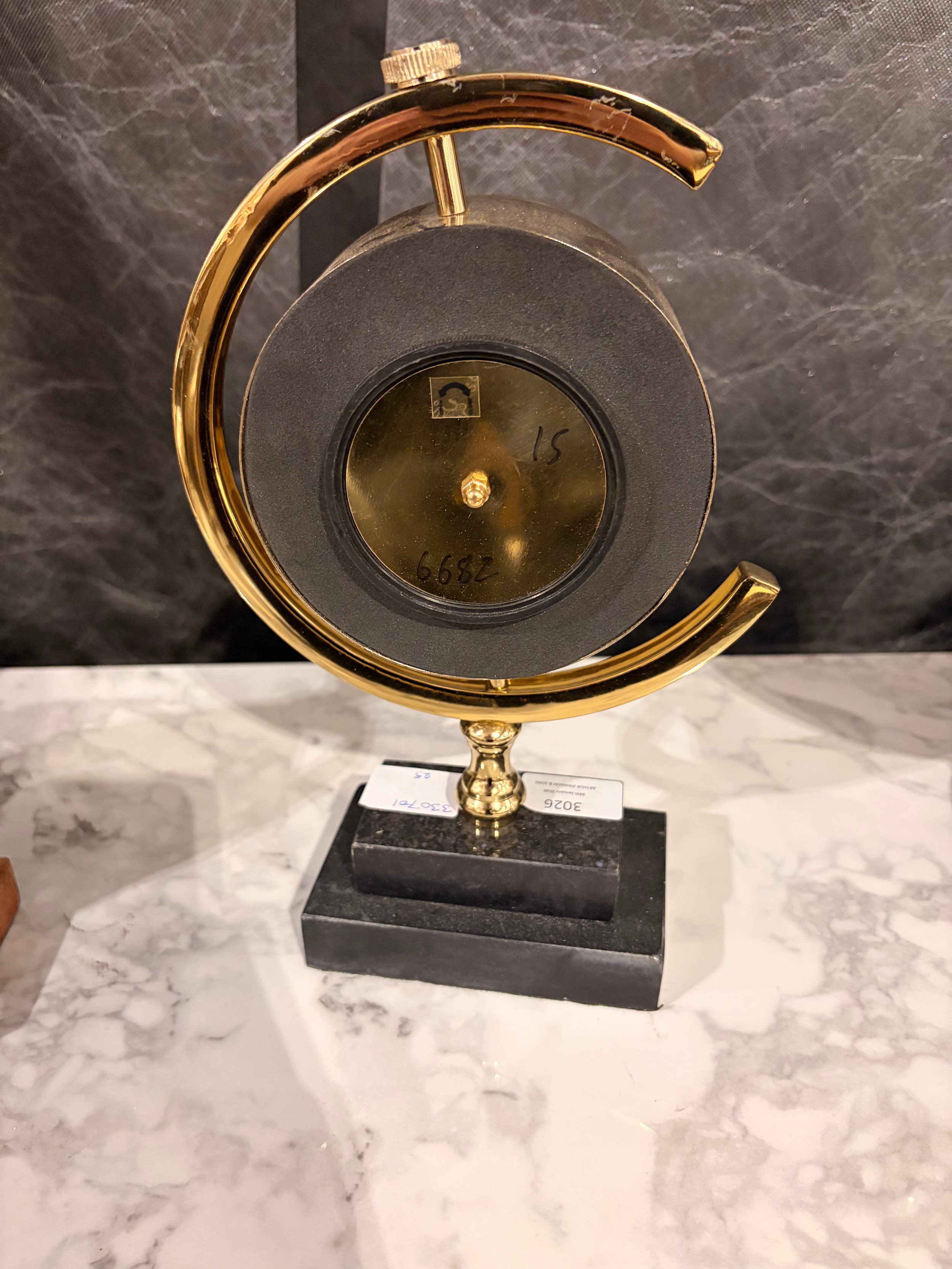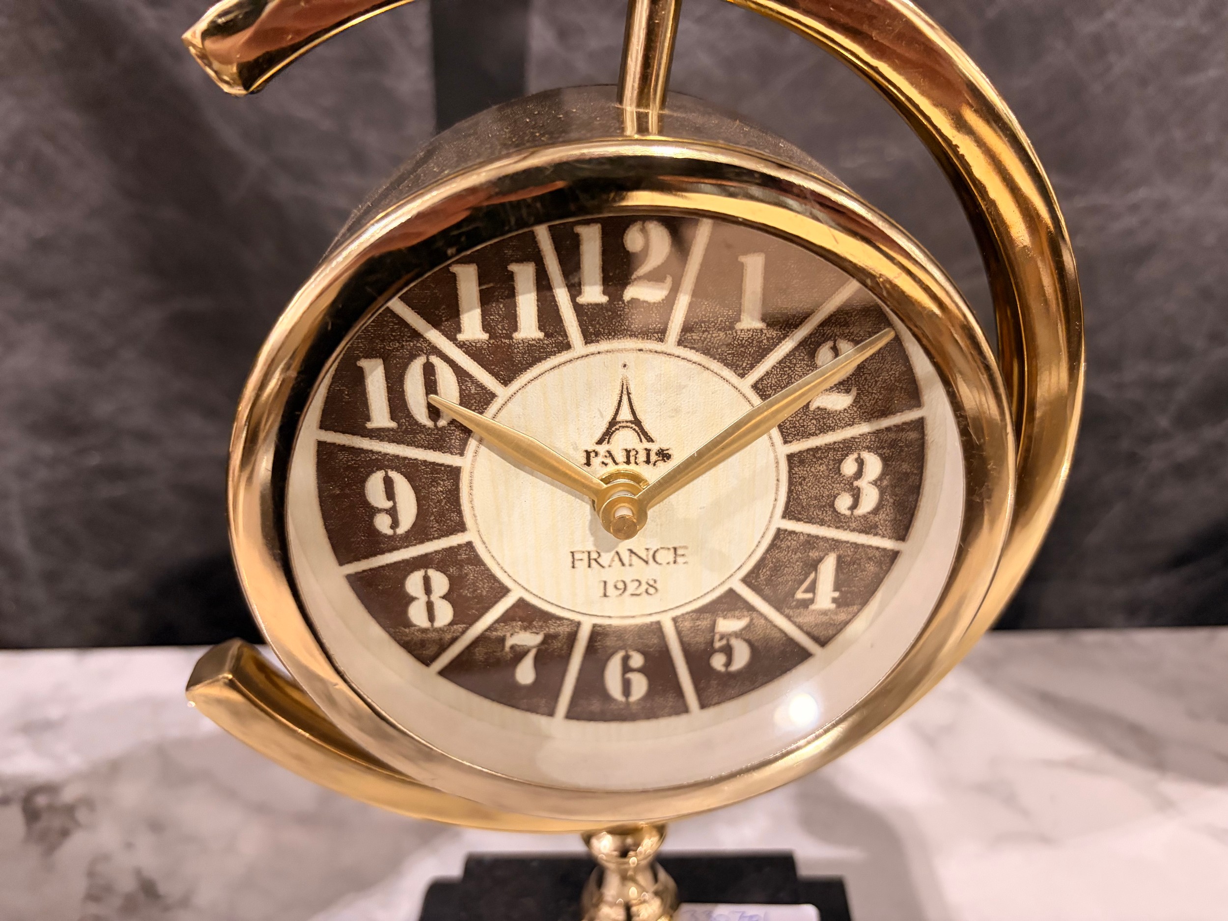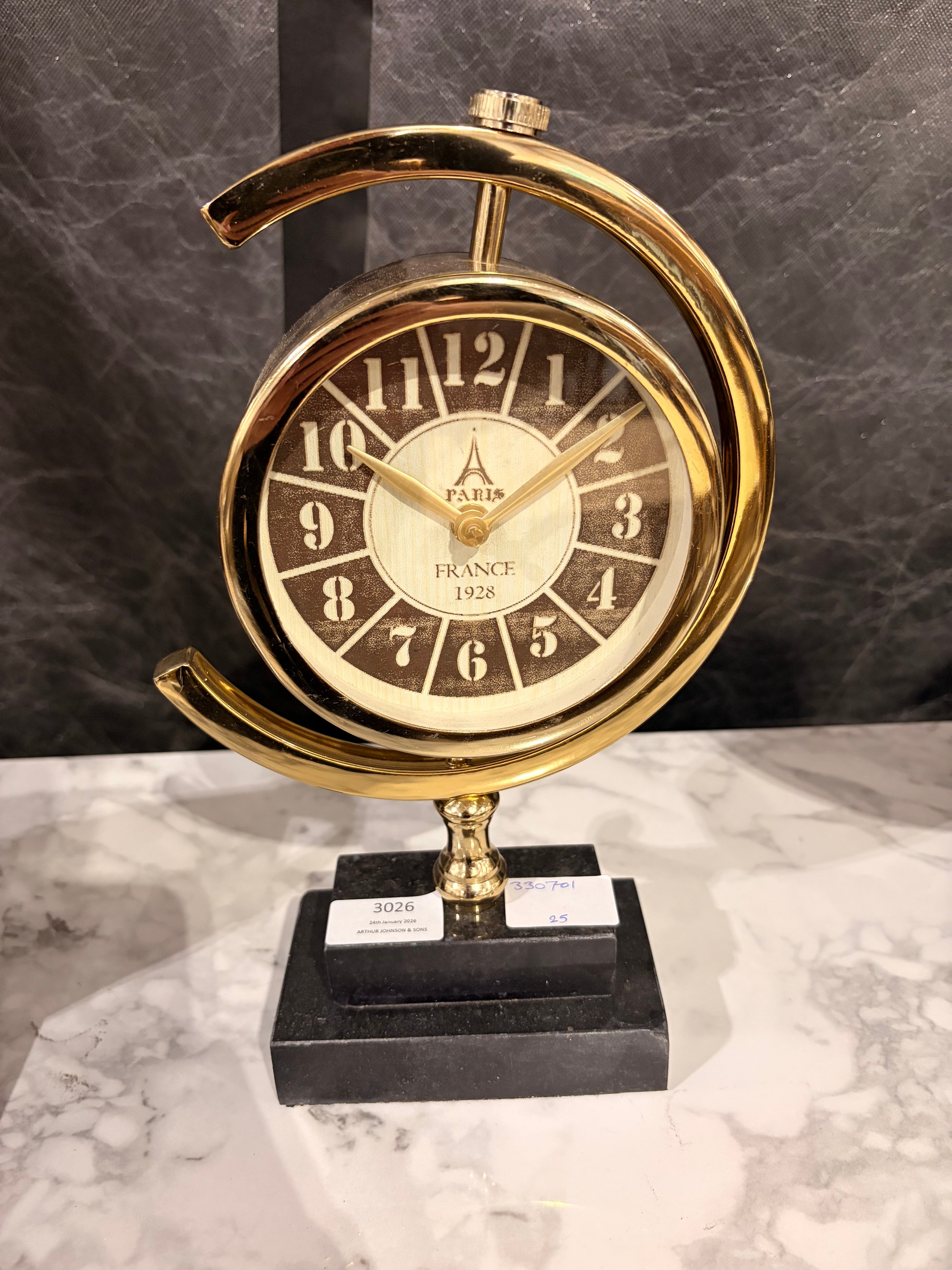 A gold effect ‘Paris’ mantle clock with a black marble base