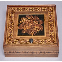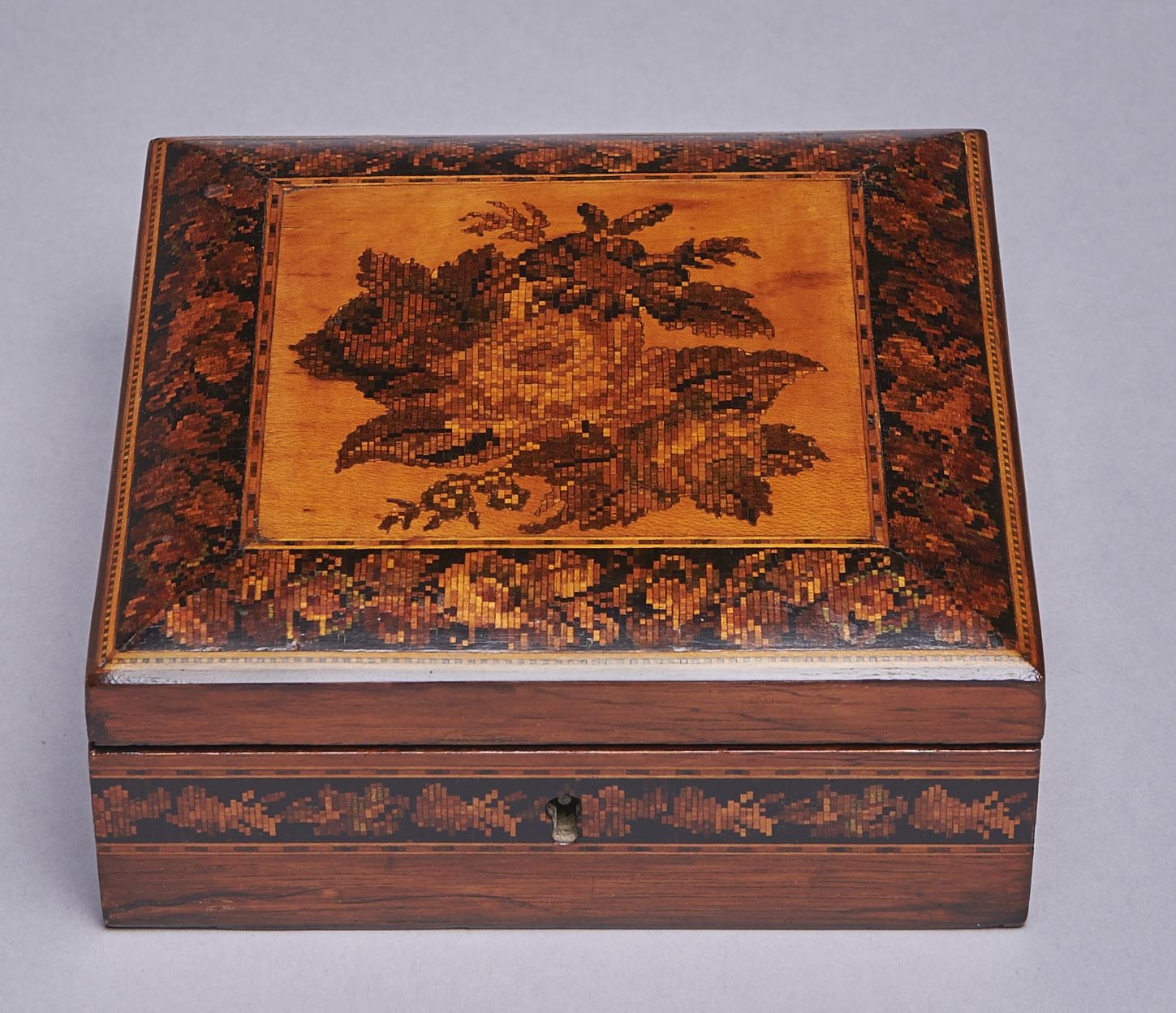 A Victorian Tunbridge ware square box, c1860, of rosewood and decorated with flowers, 15 x 15.5cm