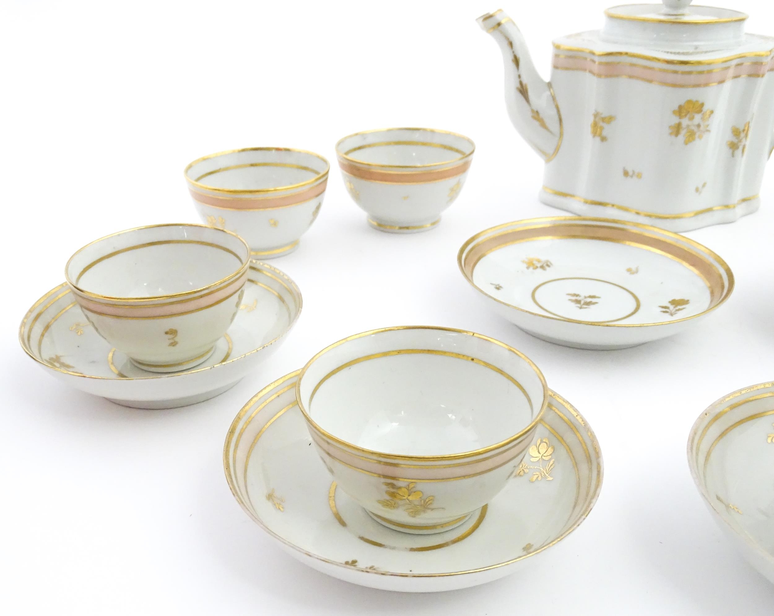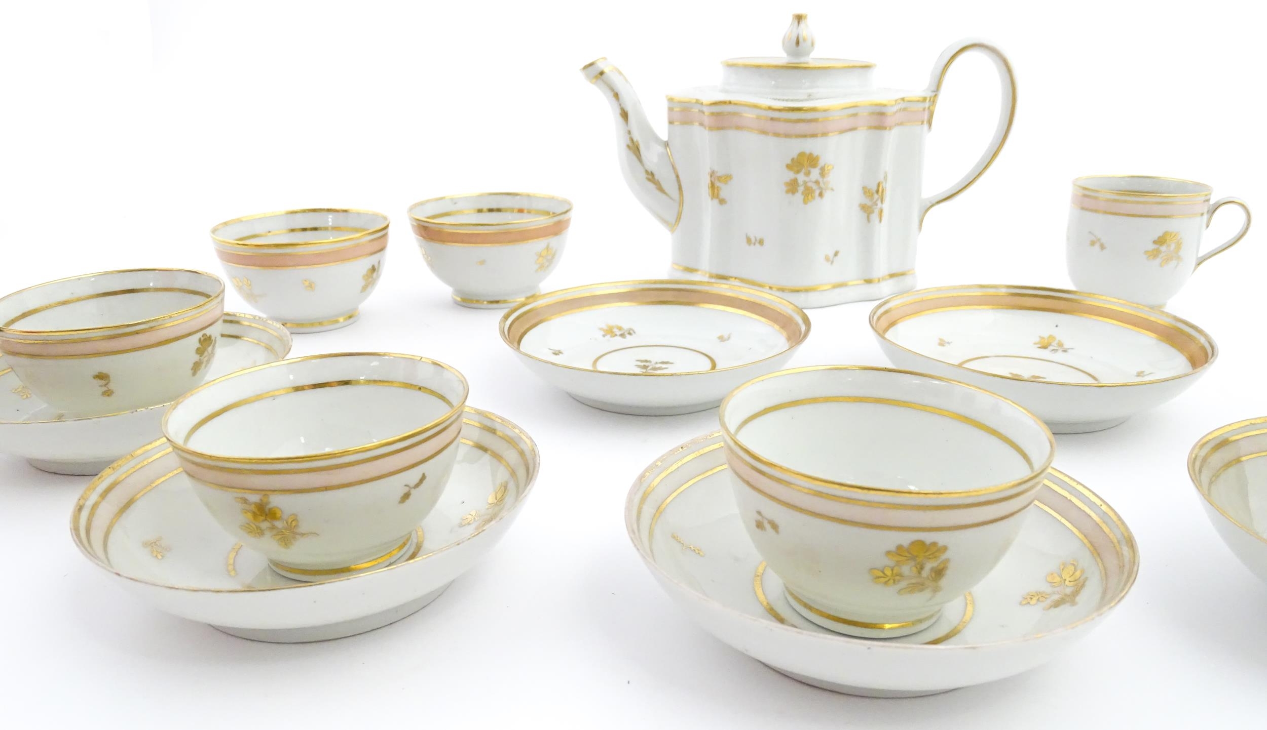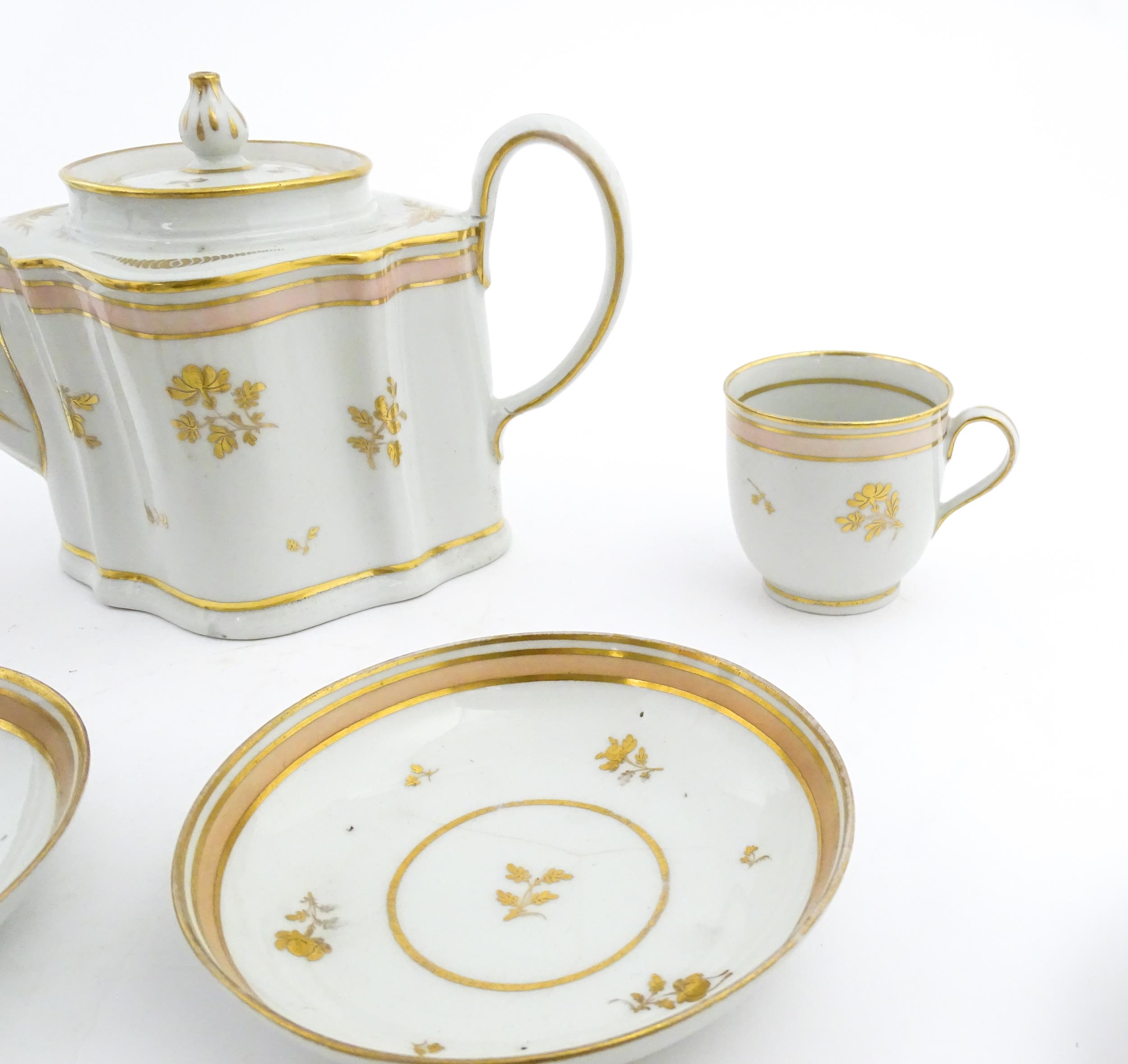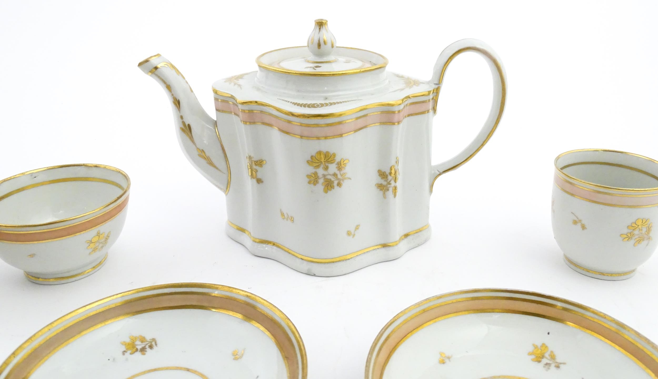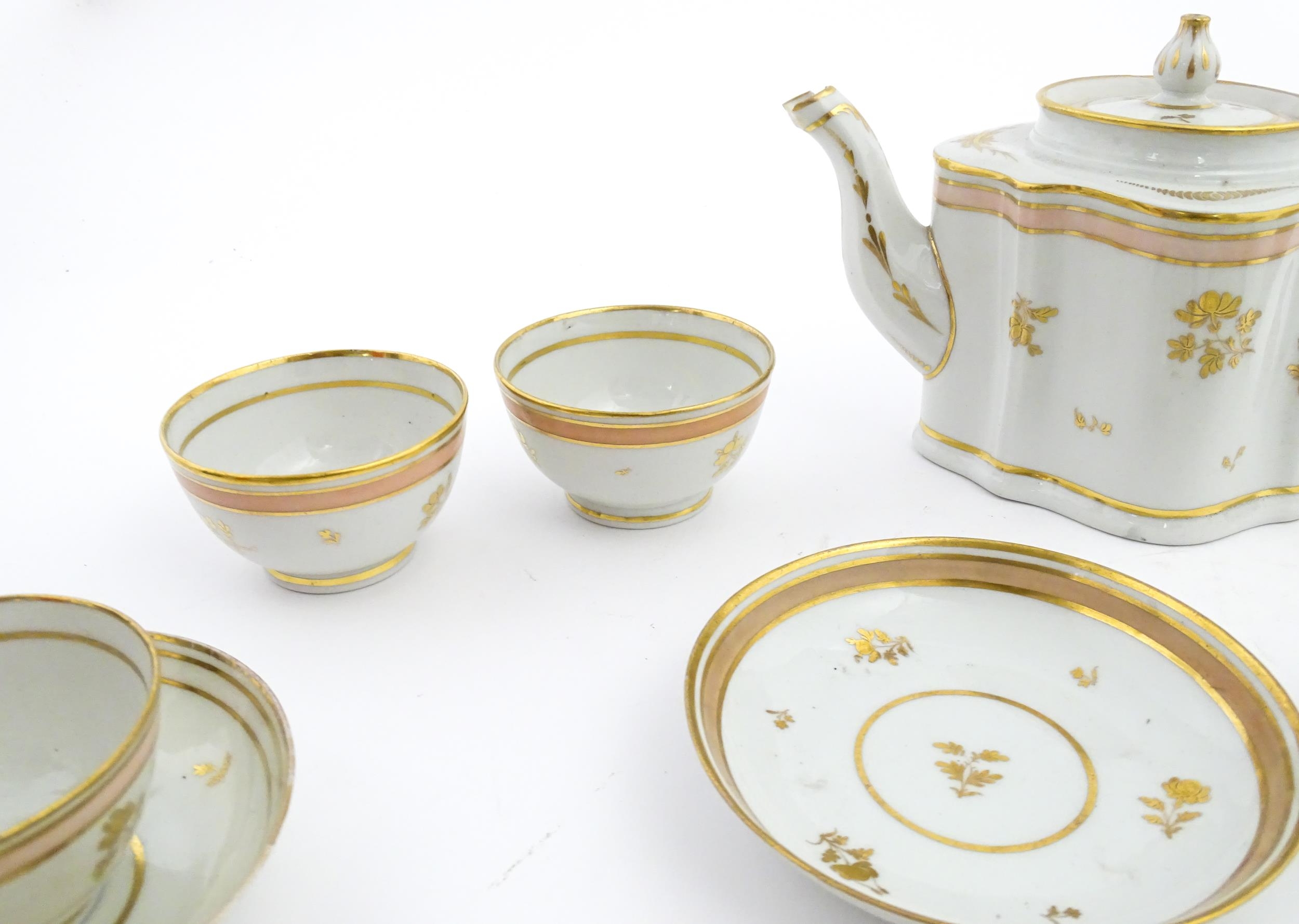 19thC New Hall tea wares decorated with a pink band and gilt detail, to include teapot, tea bowls, saucers, etc. Teapot approx. 9 1/2" long