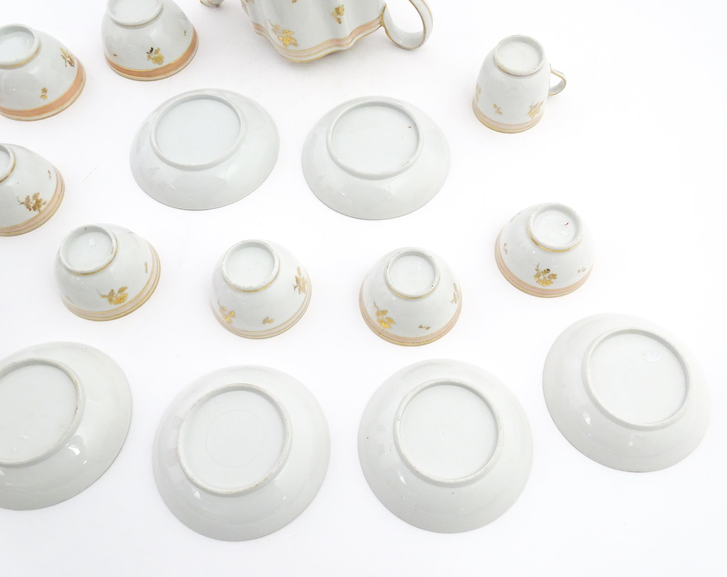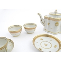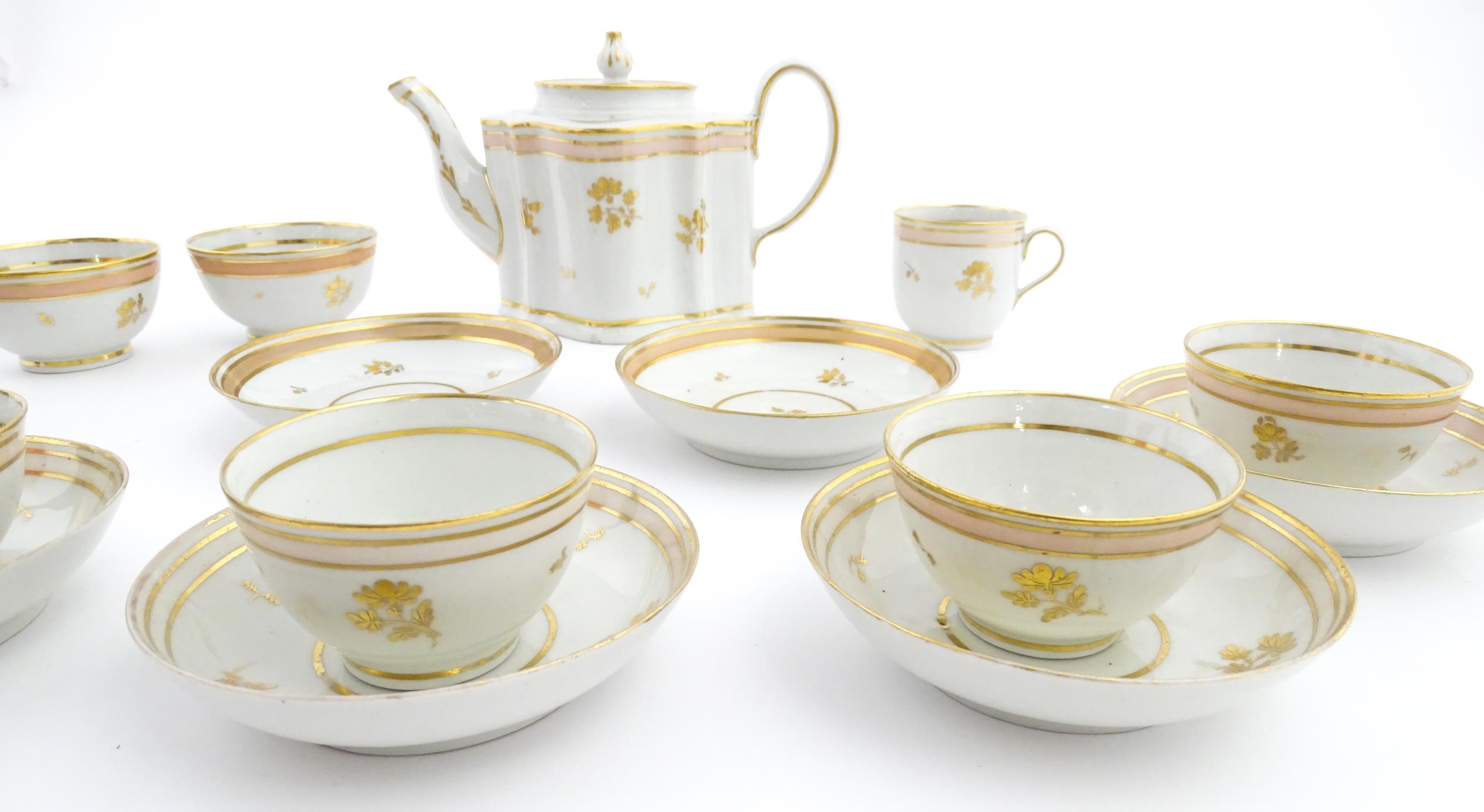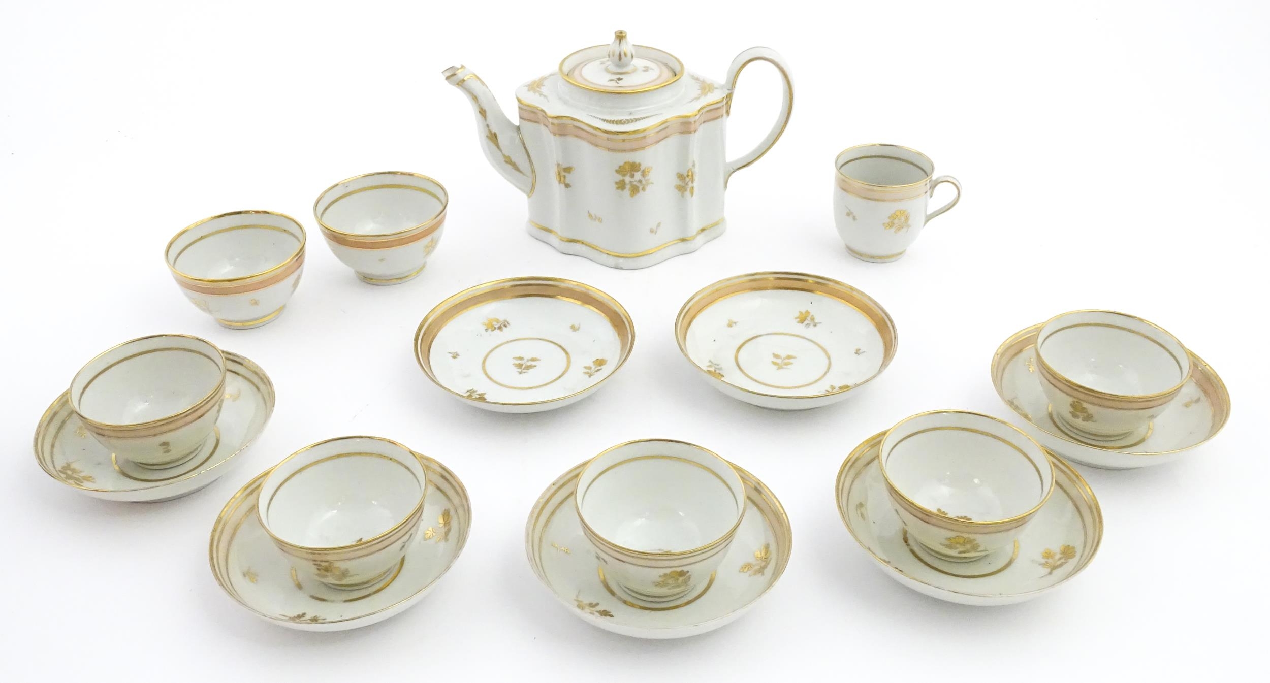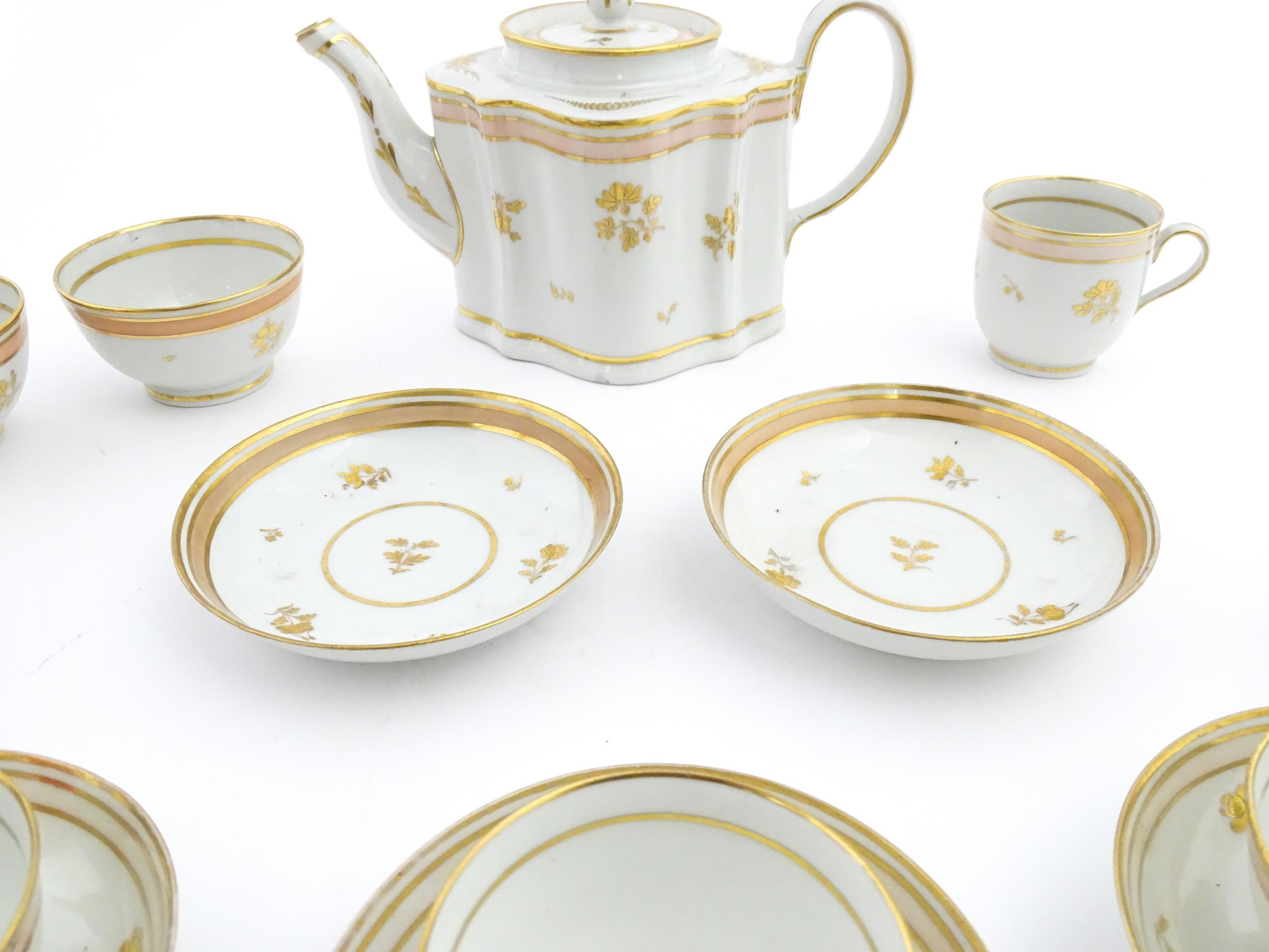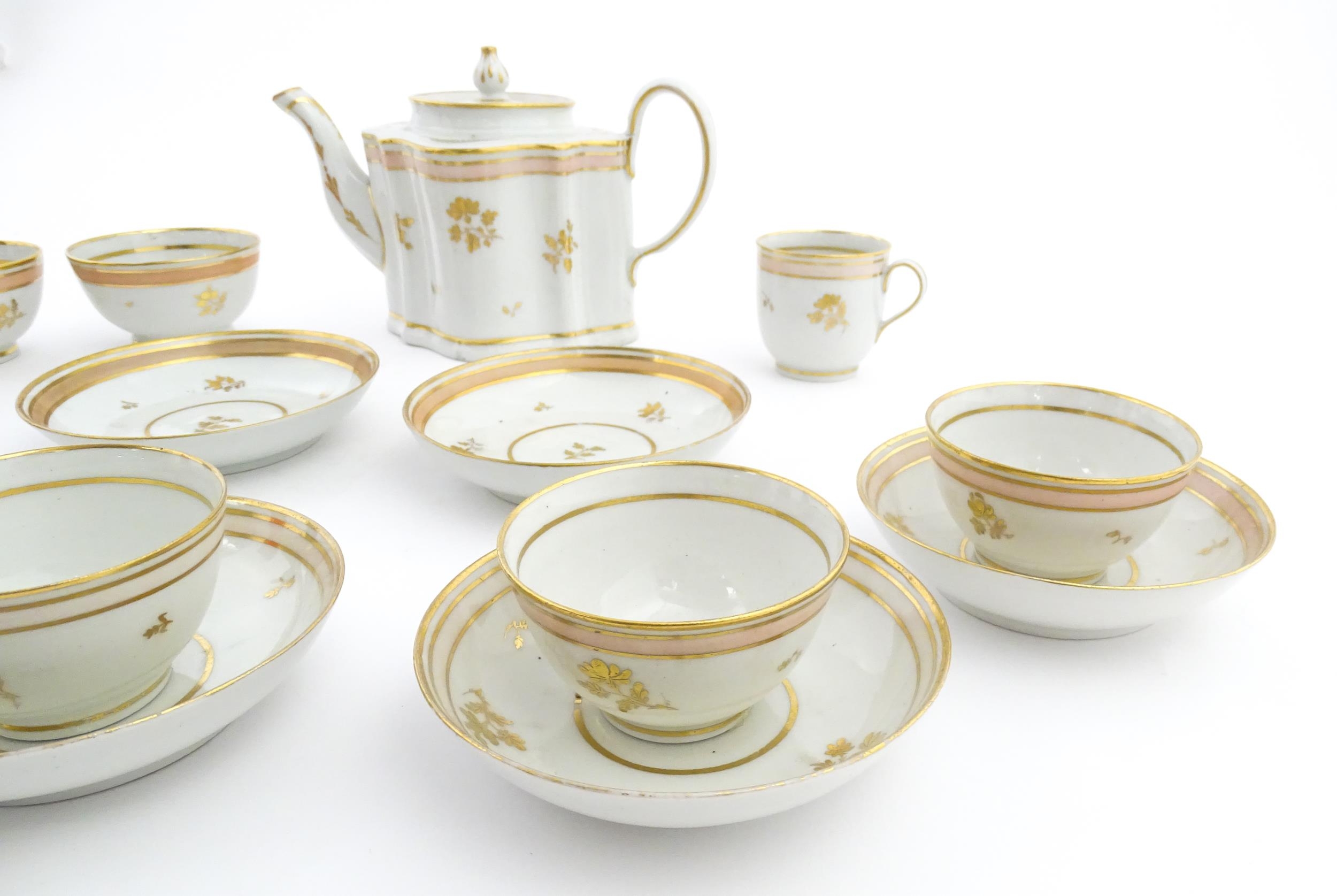 19thC New Hall tea wares decorated with a pink band and gilt detail, to include teapot, tea bowls, saucers, etc. Teapot approx. 9 1/2" long