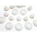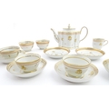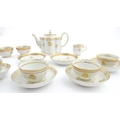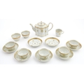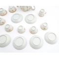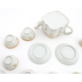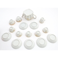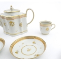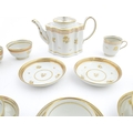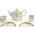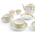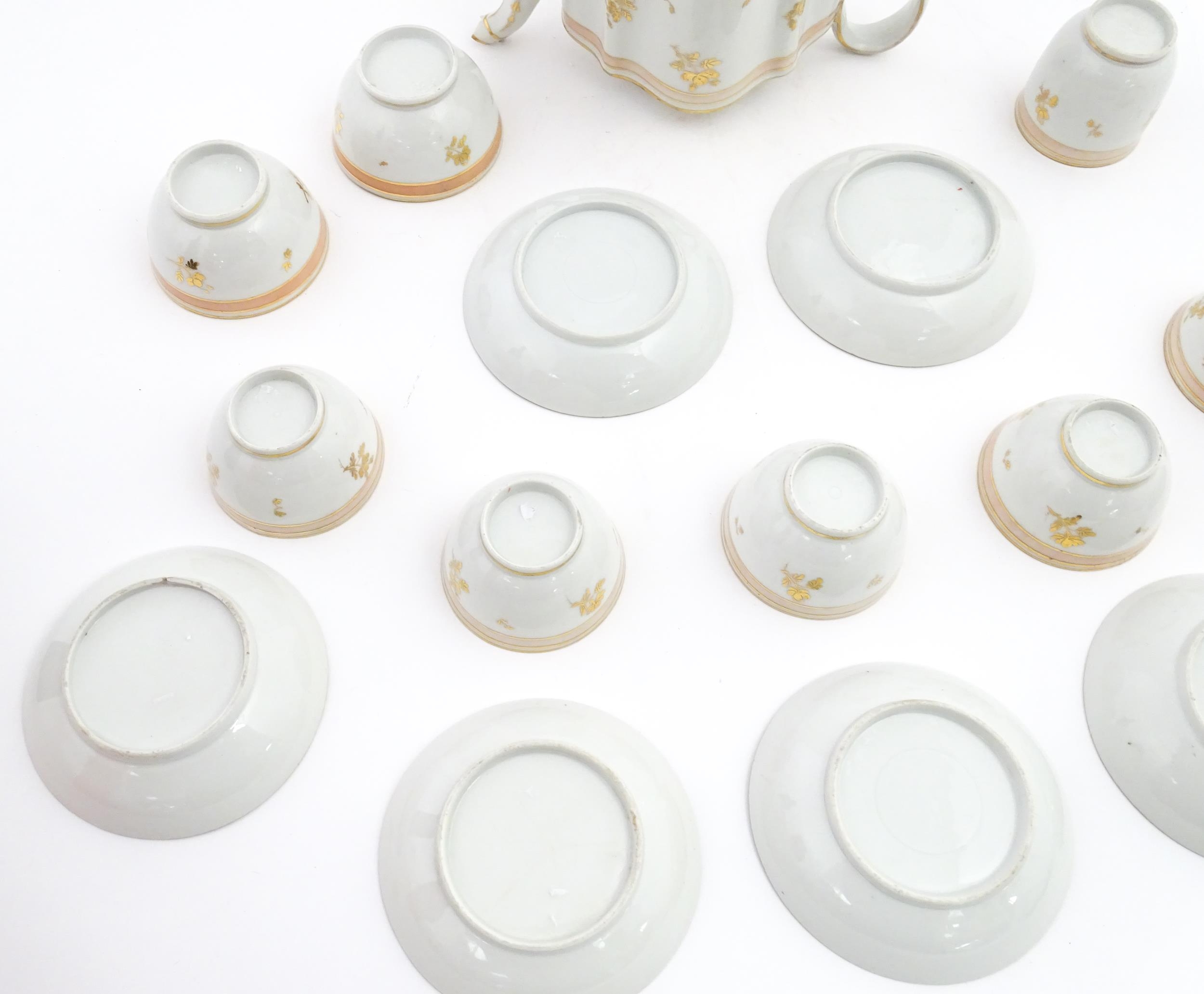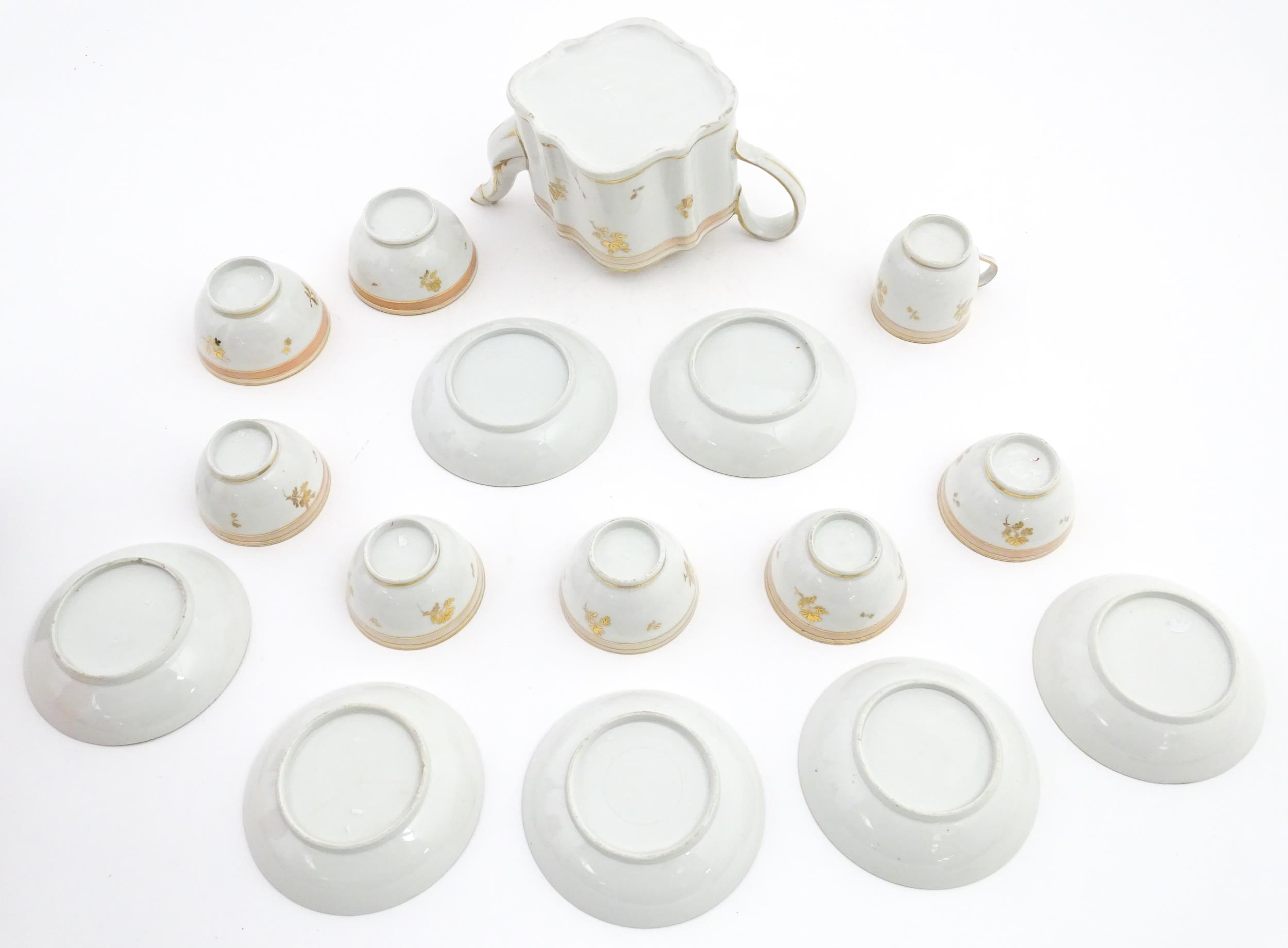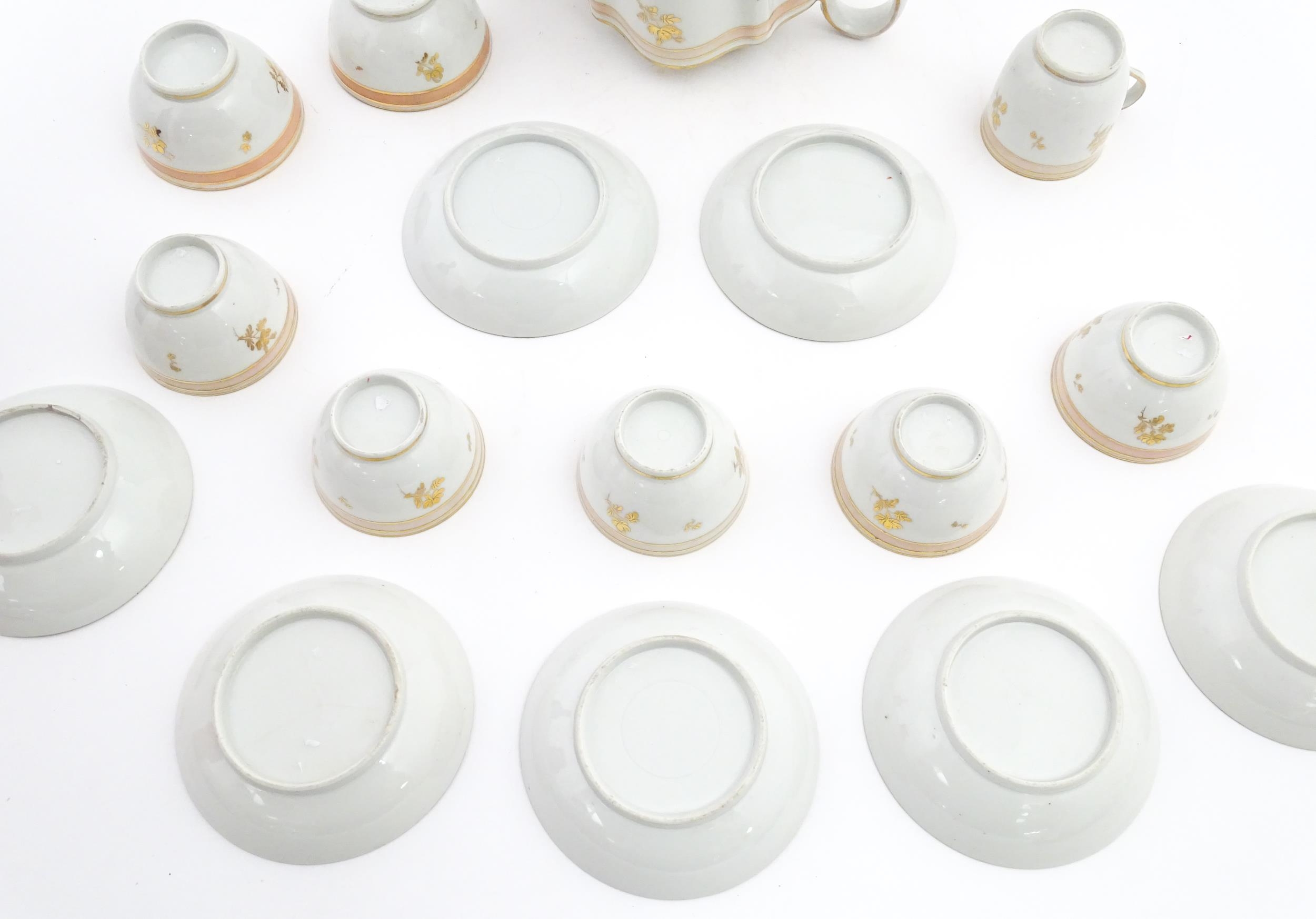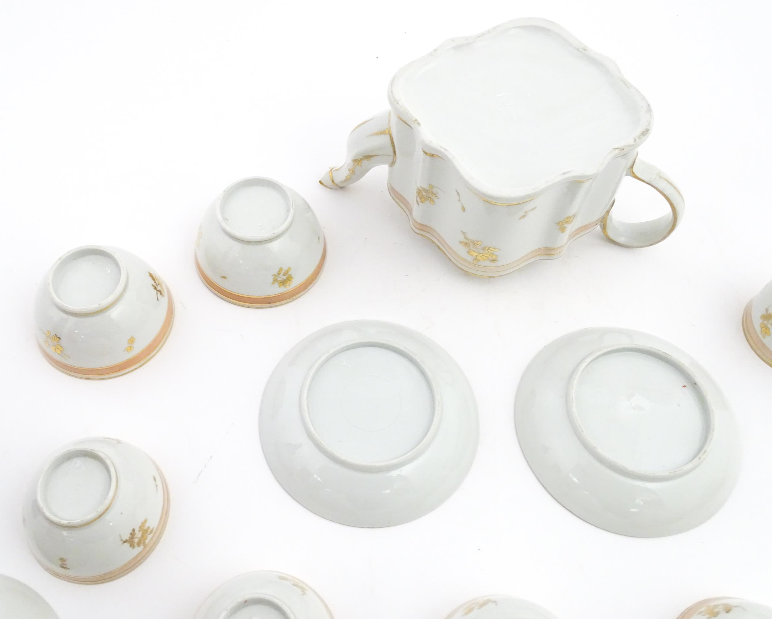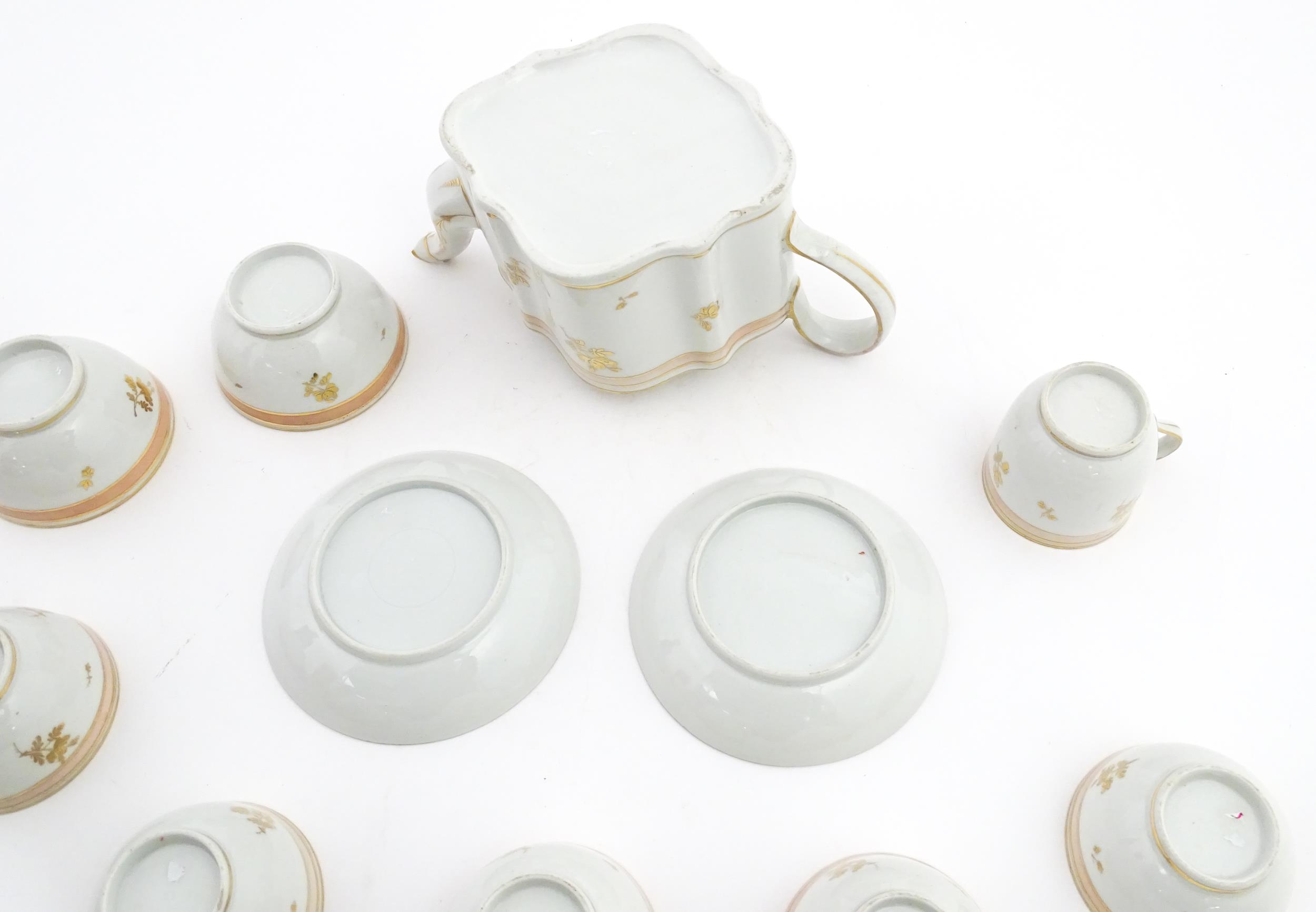 19thC New Hall tea wares decorated with a pink band and gilt detail, to include teapot, tea bowls, saucers, etc. Teapot approx. 9 1/2" long