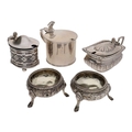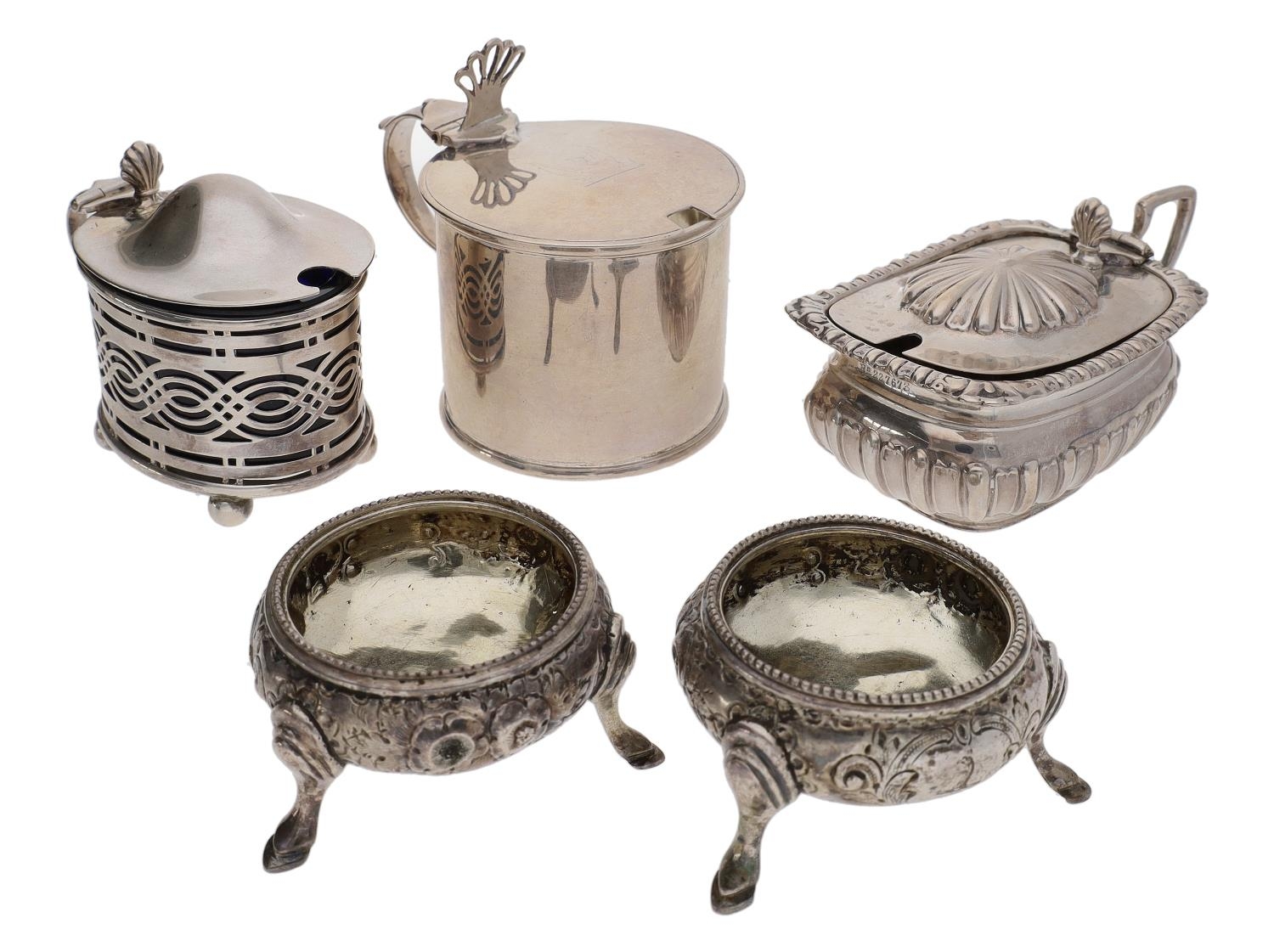 Group of five assorted cruets, various makers and dates, to include a pair of ornate Victorian Sheffield silver salts, total weight approximately 220gm