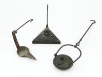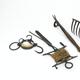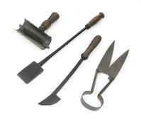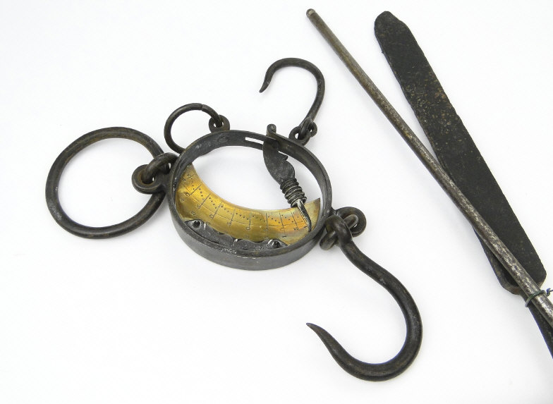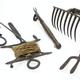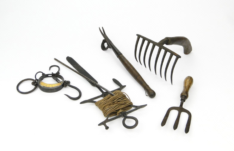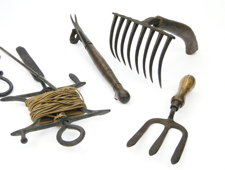 Antique agricultural tools - daisy grubber, spring operated scale with graduations, early garden line, early hand fork and a hand rake/groomer