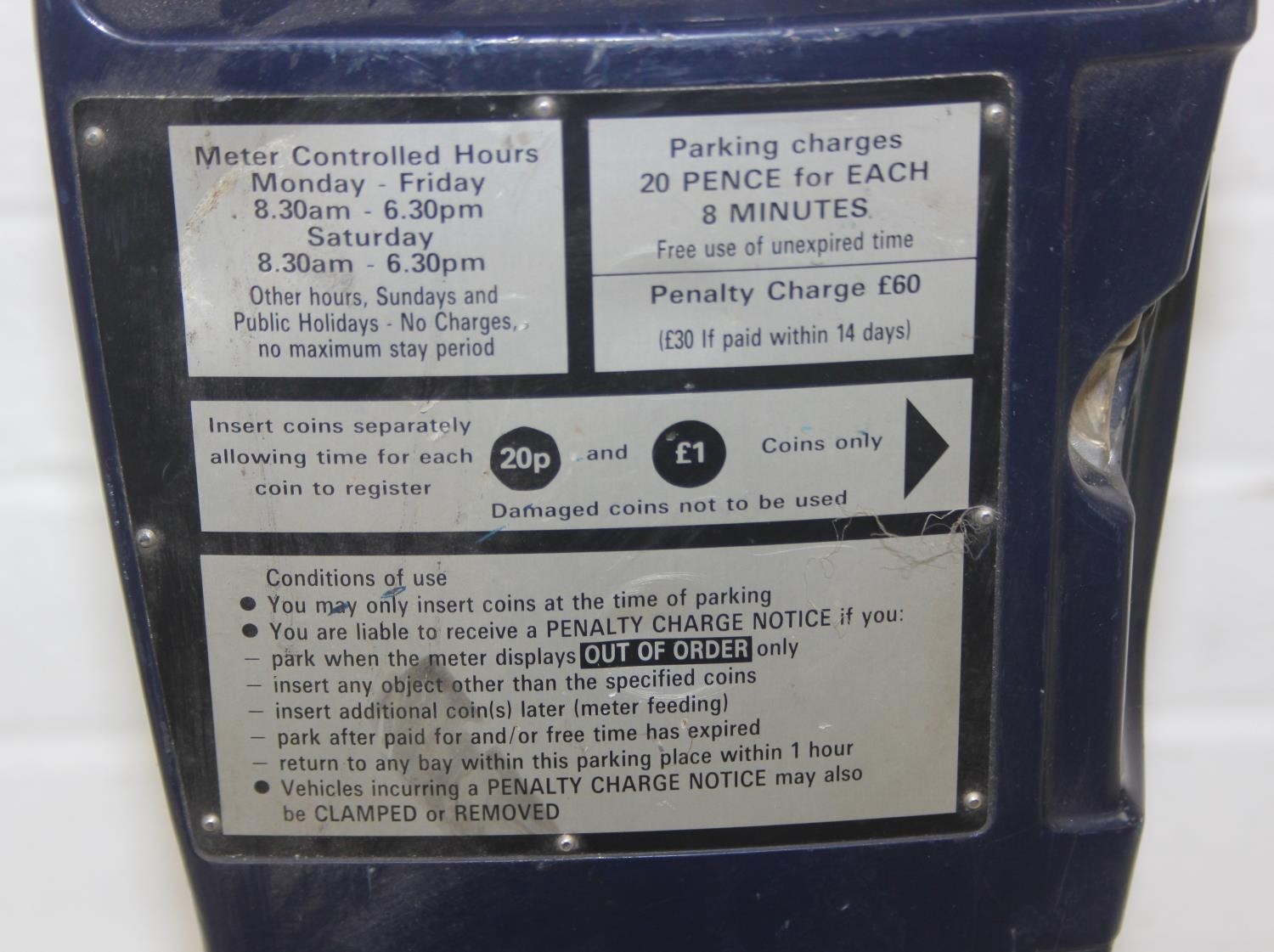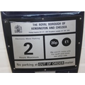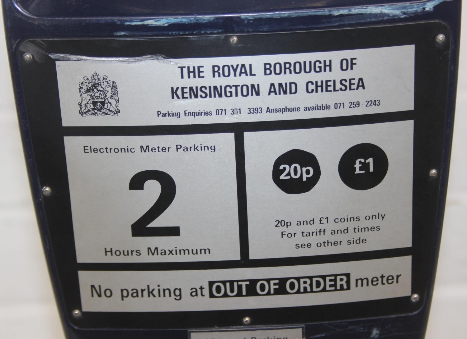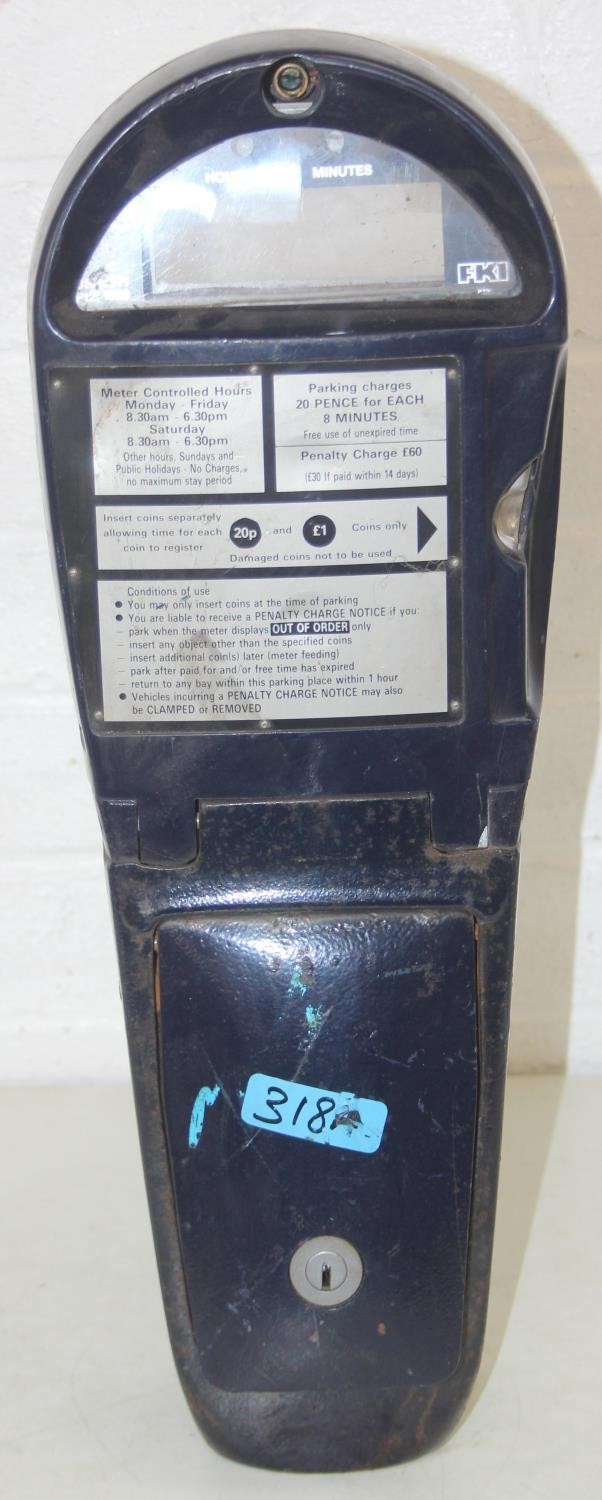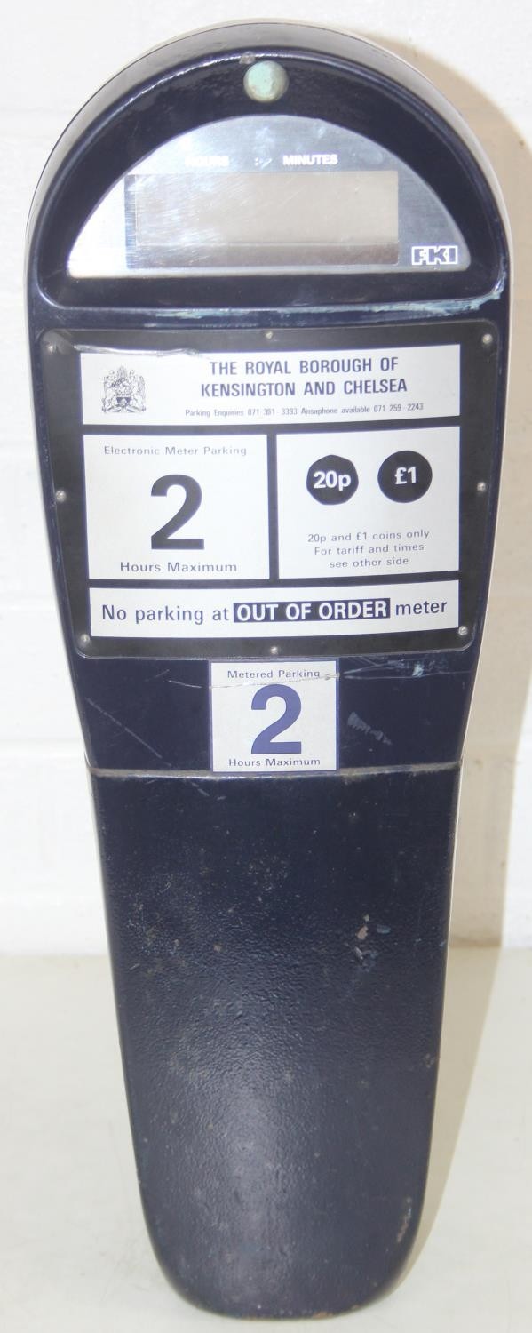 A vintage London FKI made parking meter from Royal Borough of Kensington and Chelsea, 20p per 8 minutes up to a maximum of 2 hours, 51cm tall