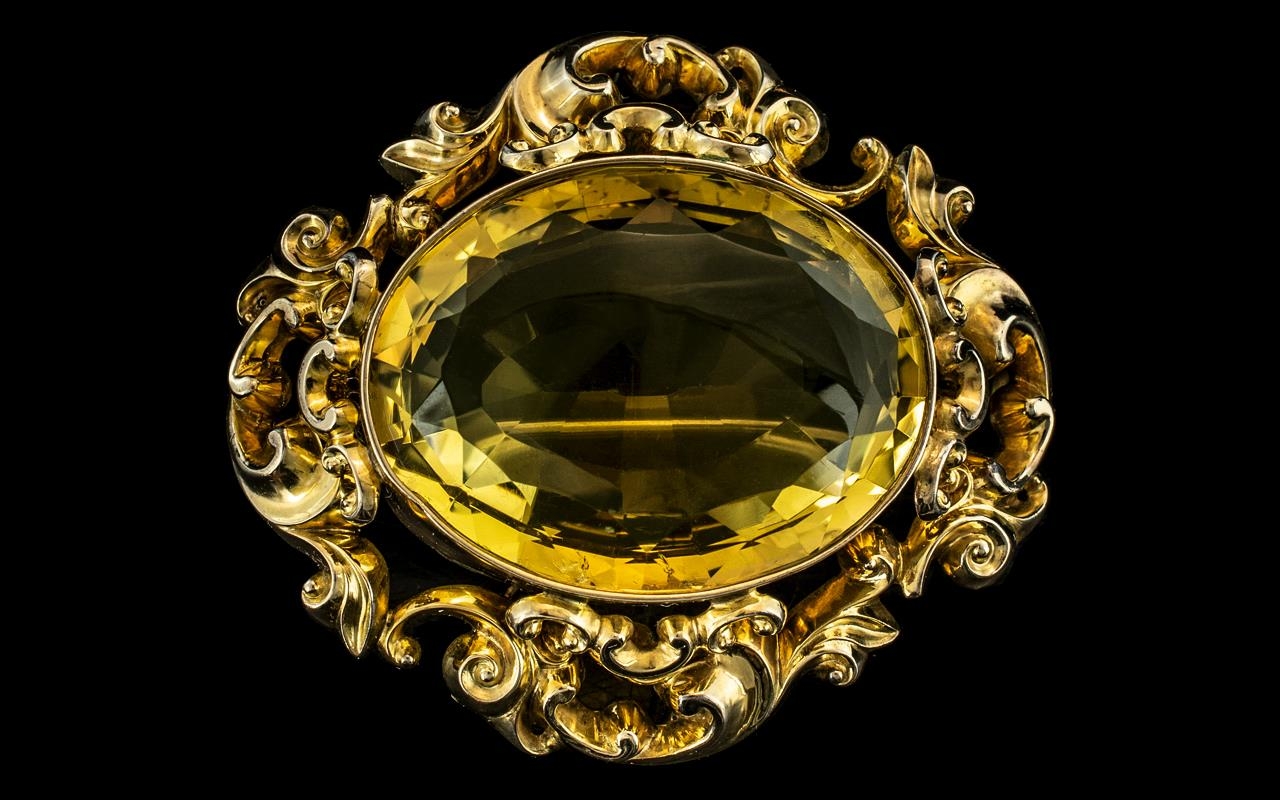 Antique Period - Ladies Large and Superb Quality 18ct Gold Citrine Set Ornate Brooch of Large Proportions. Not Marked But Tests High Ct Gold. c.1860. The Central Large Faceted Citrine of Stunning Quality. Measurement 45 mm x 35 mm. Superb Condition, Weight 52.5 grams, Very Low Estimate for this Quality. Size of Brooch - Width 2.5 Inches - 6.25 cms. Provenance - Comes from a Ladies Private Collection.