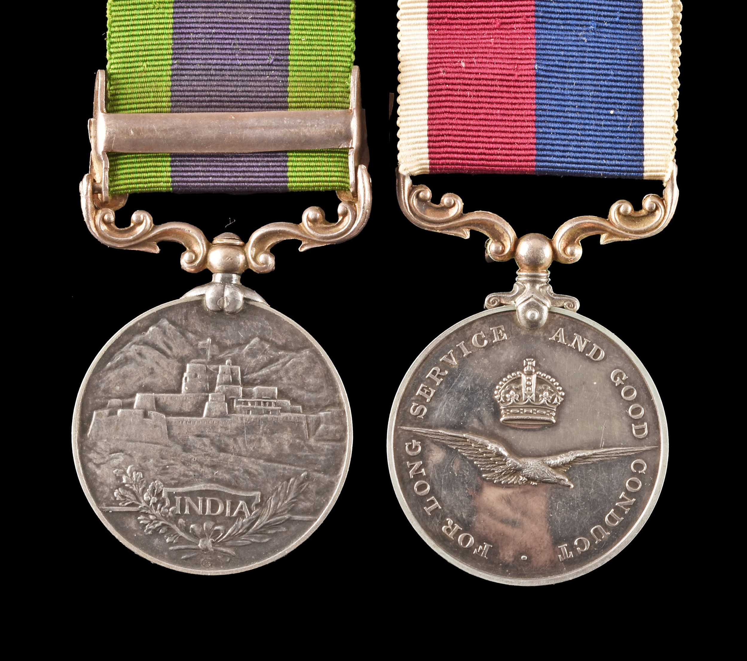 An India GSM and LSGC medal pair to: 353959 Corporal / Warrant Officer A. G. Ruston, Royal Air Force. Comprising an Indian General Service Medal 1909 with North West Frontier 1930-31 clasp (353959 Cpl A. G. Ruston R.A.F.); and a George VI Royal Air Force Long Service and Good Conduct Medal (W/O A. G. Ruston R.A.F.).