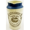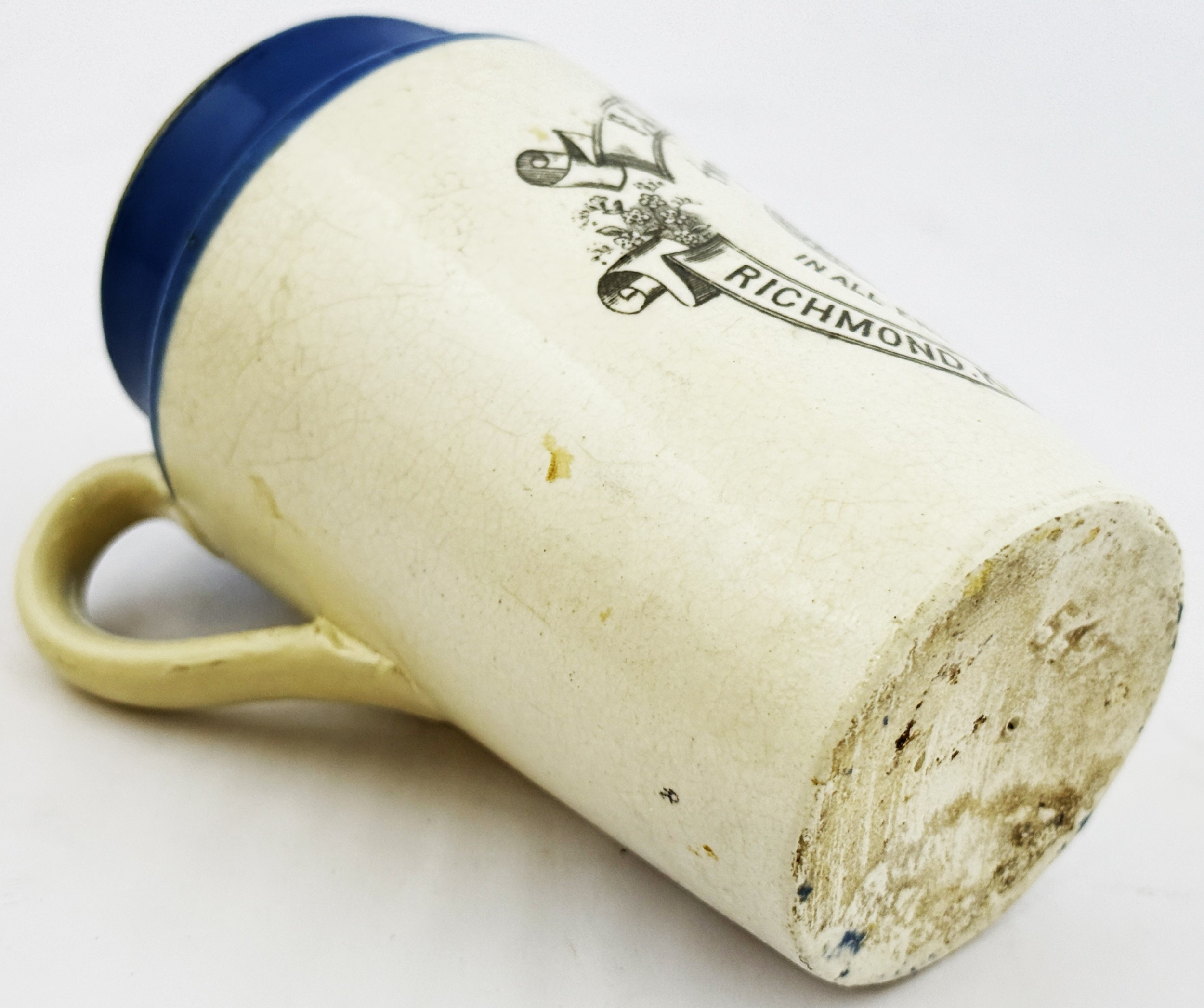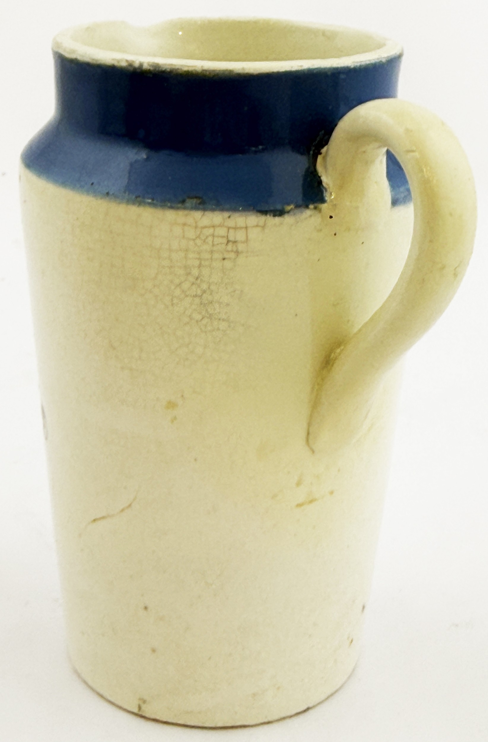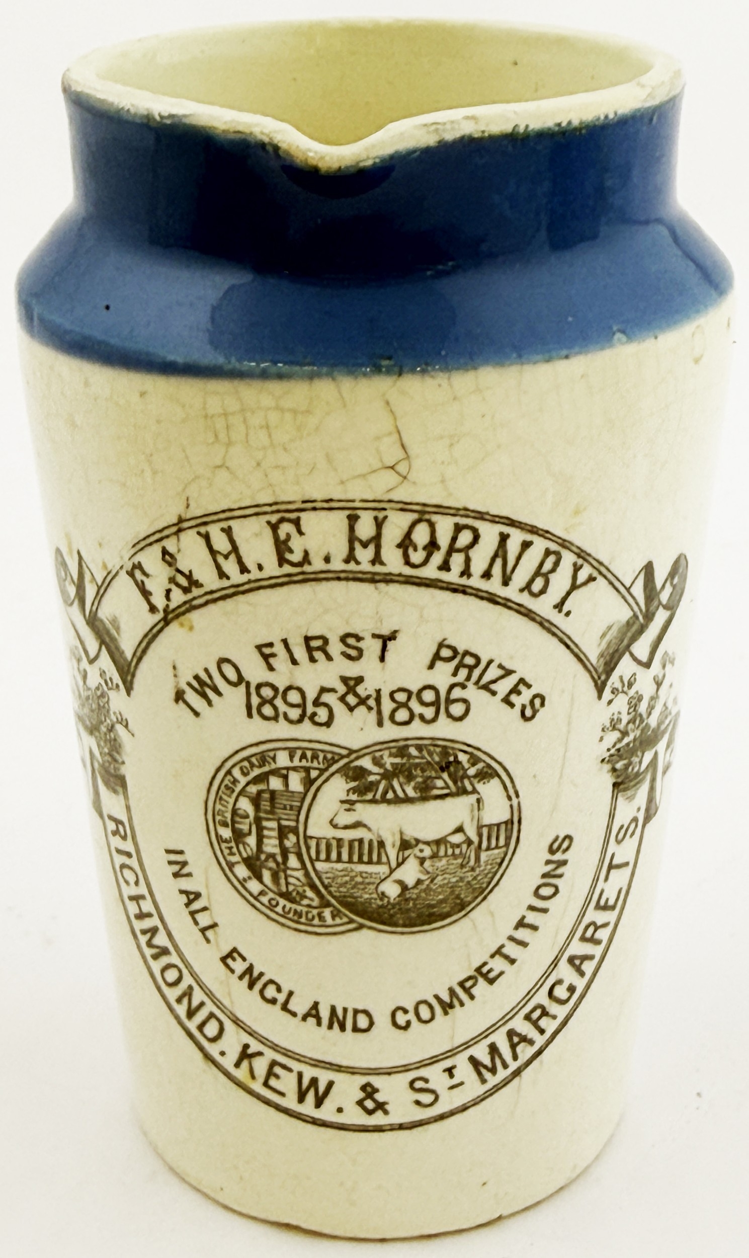 HORNBY RICHMOND & KEW CREAM JUG. 4.25ins tall. Scarce West London blue top handled cream pot from F & H E Hornby, central pict. t.m. of two prize medals. Hugh Davidson collection. Restoration to handle & rim, rare pot nevertheless