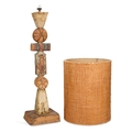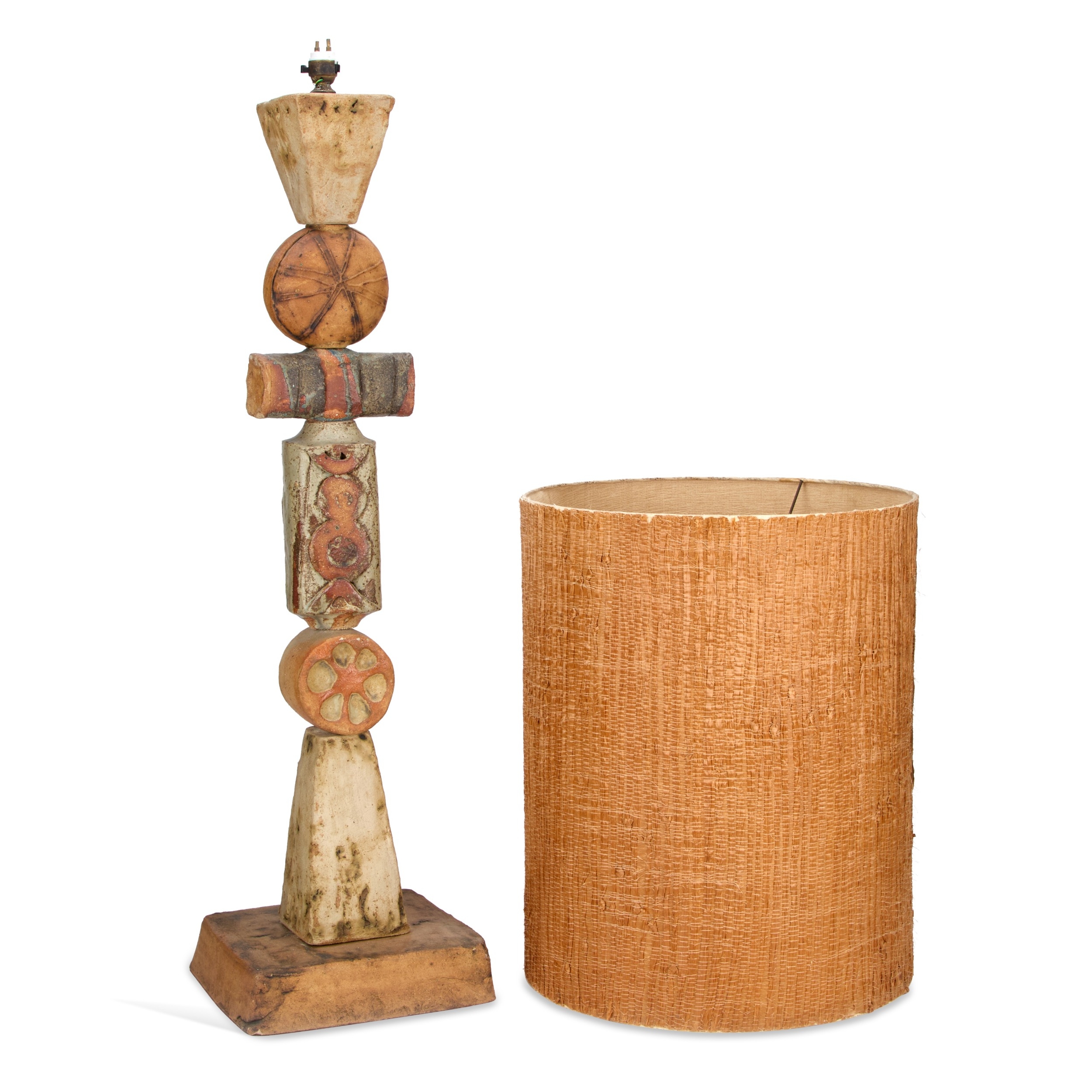 the sculptural column formed from stacked geometric and disc-shaped elements decorated in muted earth-tone glazes with incised and textured abstract motifs, raised on a square base, unsigned; together with the original woven cylindrical shade. 95cm high (excl. shade)