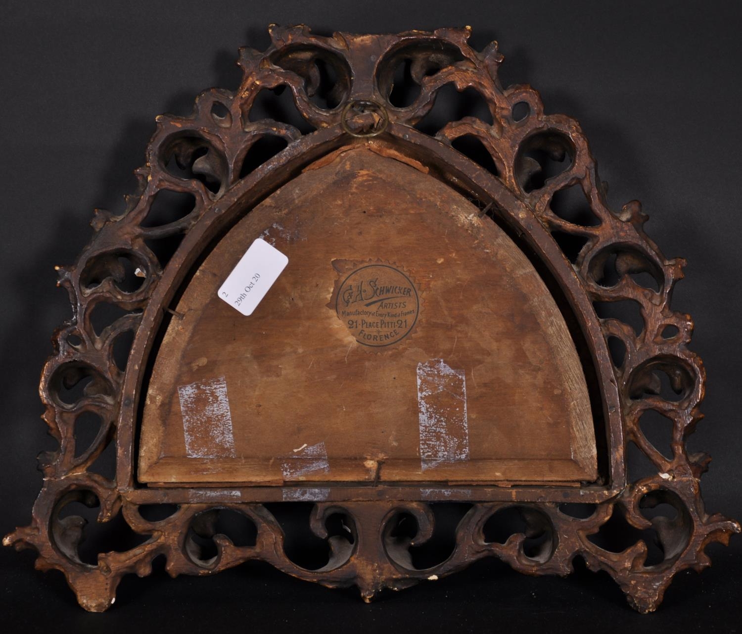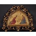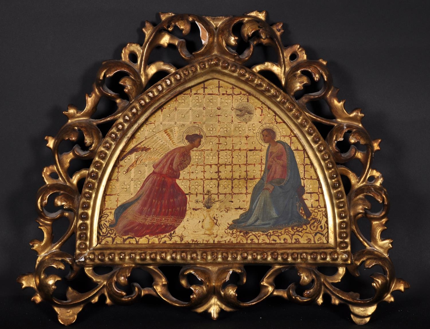 After Fra Angelico (c.1395-1455) Italian. The Annunciation, Oil on Shaped Panel, in a Carved Giltwood Florentine Frame, 7” x 9.5” (17.7 x 24cm)