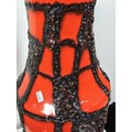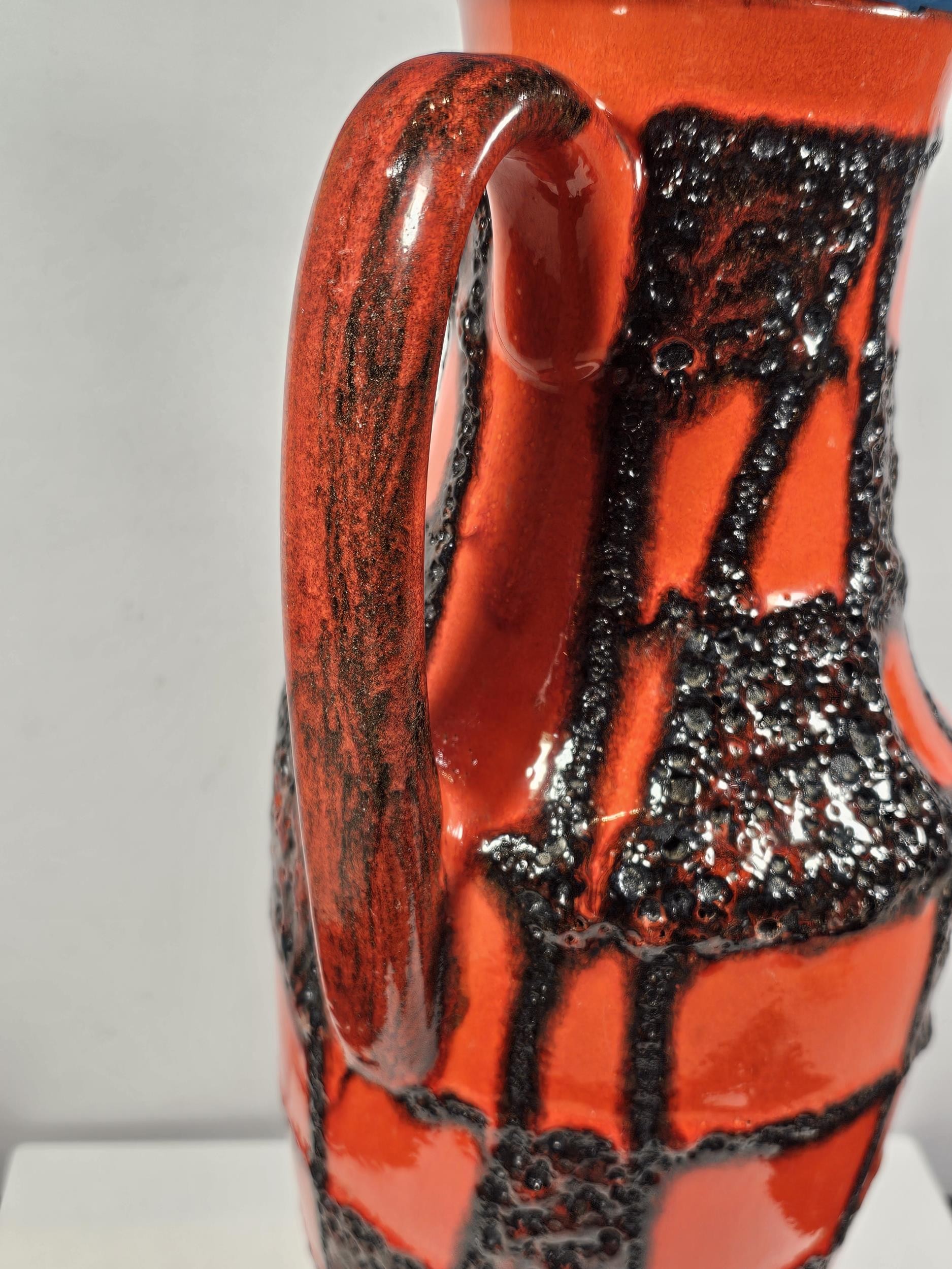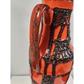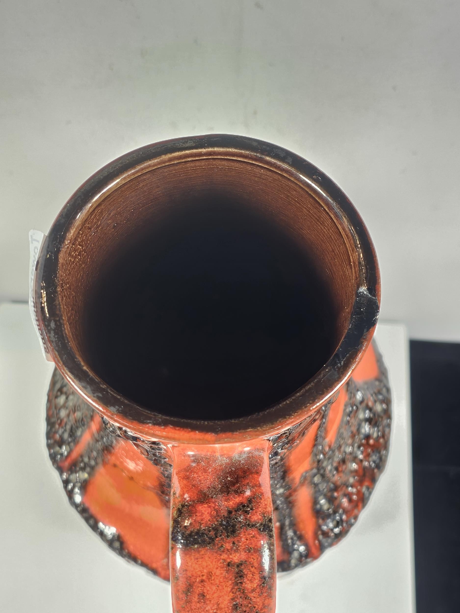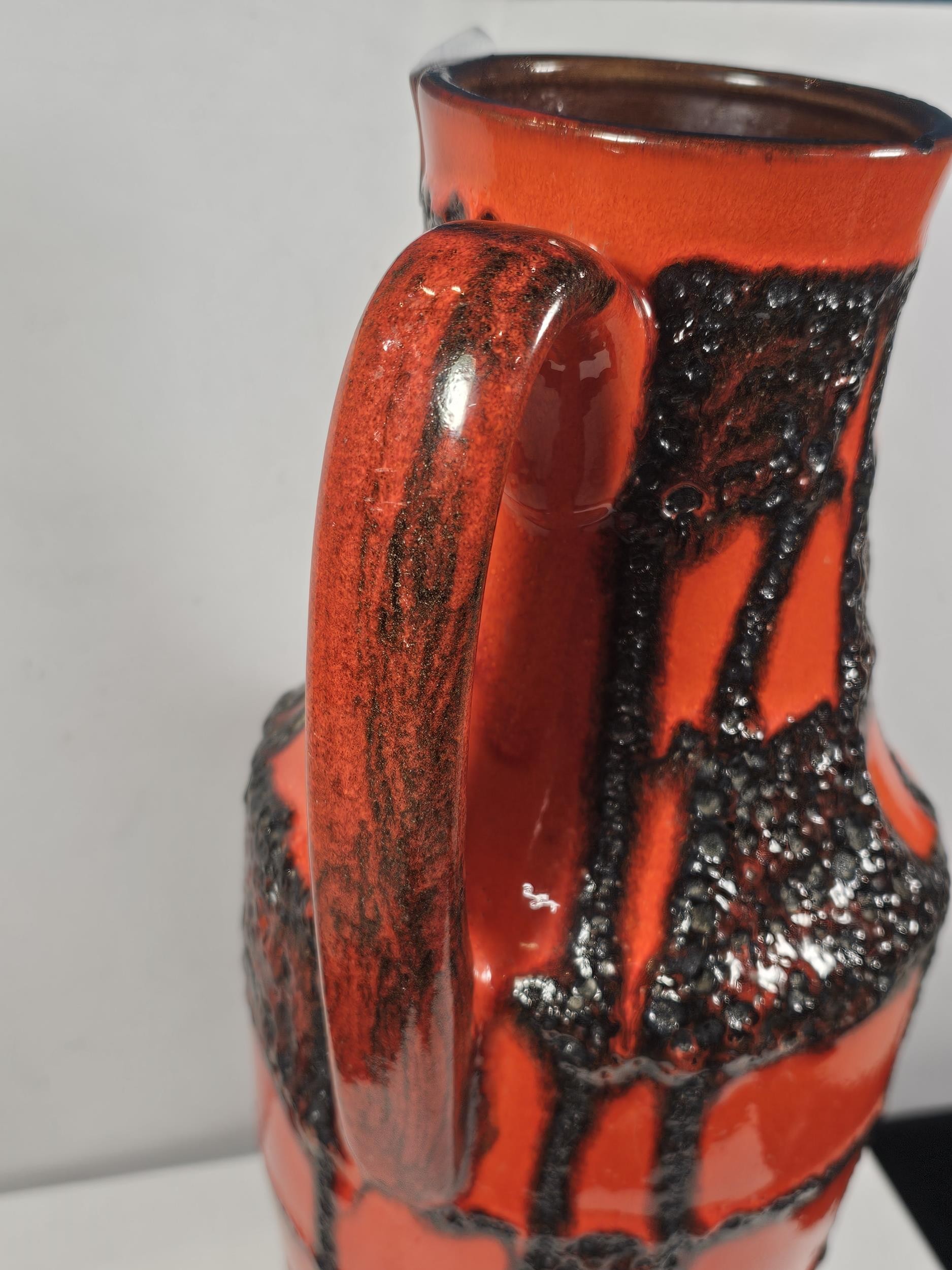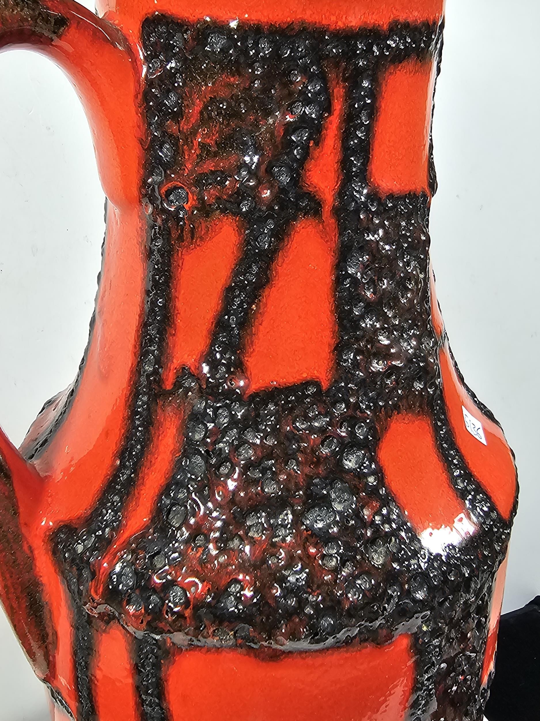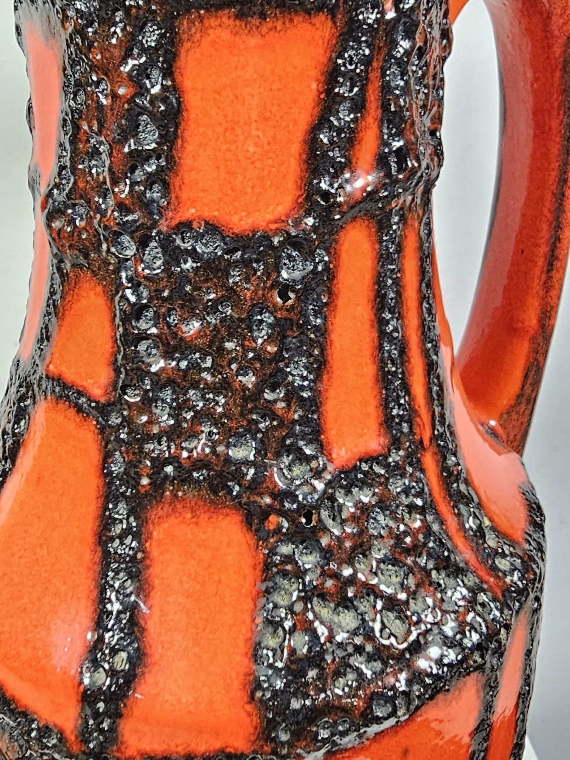 A large striking West German scheurich keramik jug vase, model 407-35, circa 1960's/70's of Baluster form with integral handle, finished in a bold orange ground decorated with a heavily textured black lava glaze, arranged in a distinctive spiderweb pattern. The glaze pooling across the surface to creat strong depth and contrast. It has a height of 35.5cm, with a width of 18cm, it has a minor chip to the top rim otherwise the piece is in excellent condition.