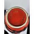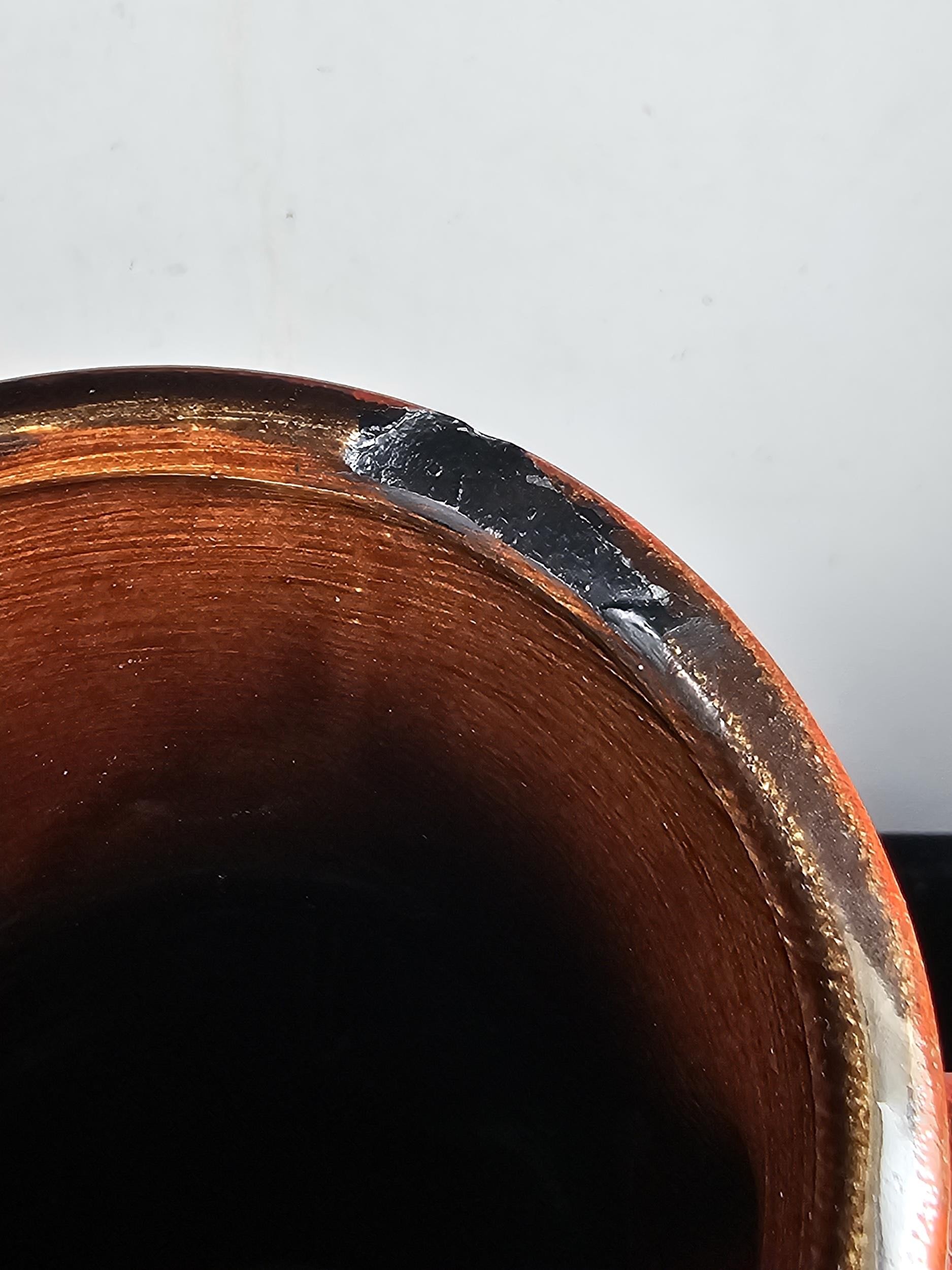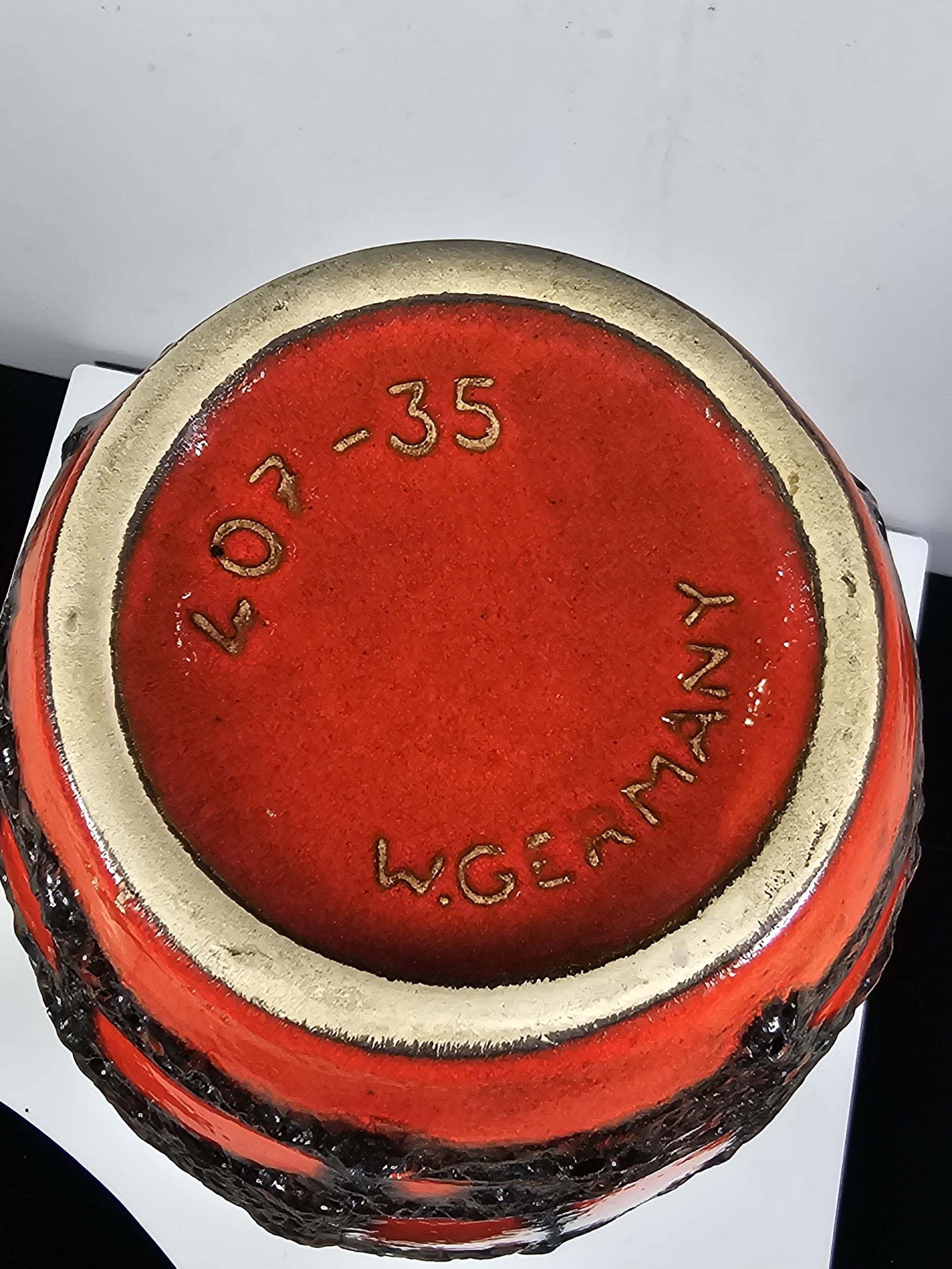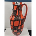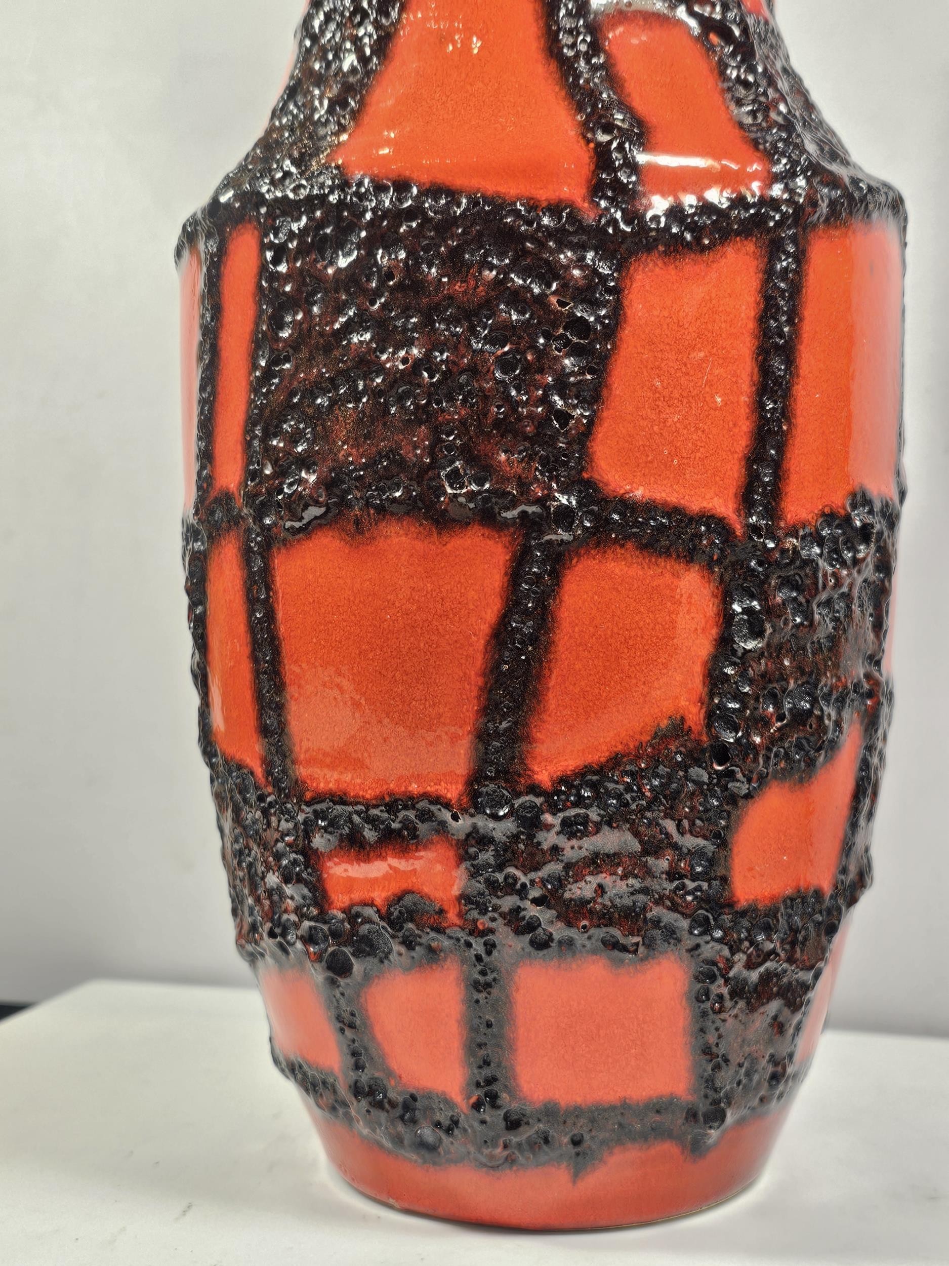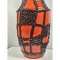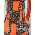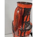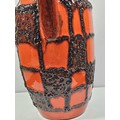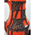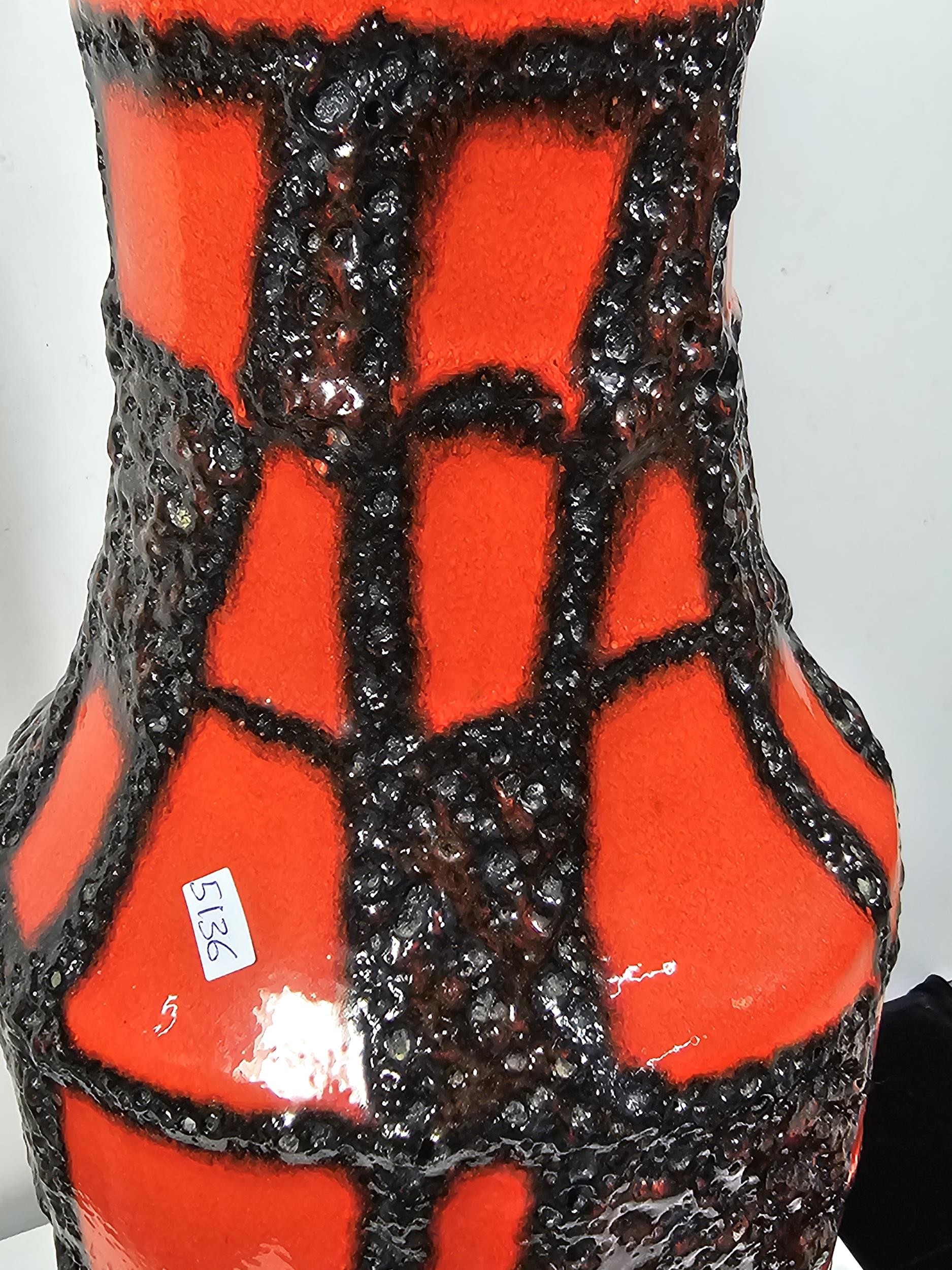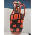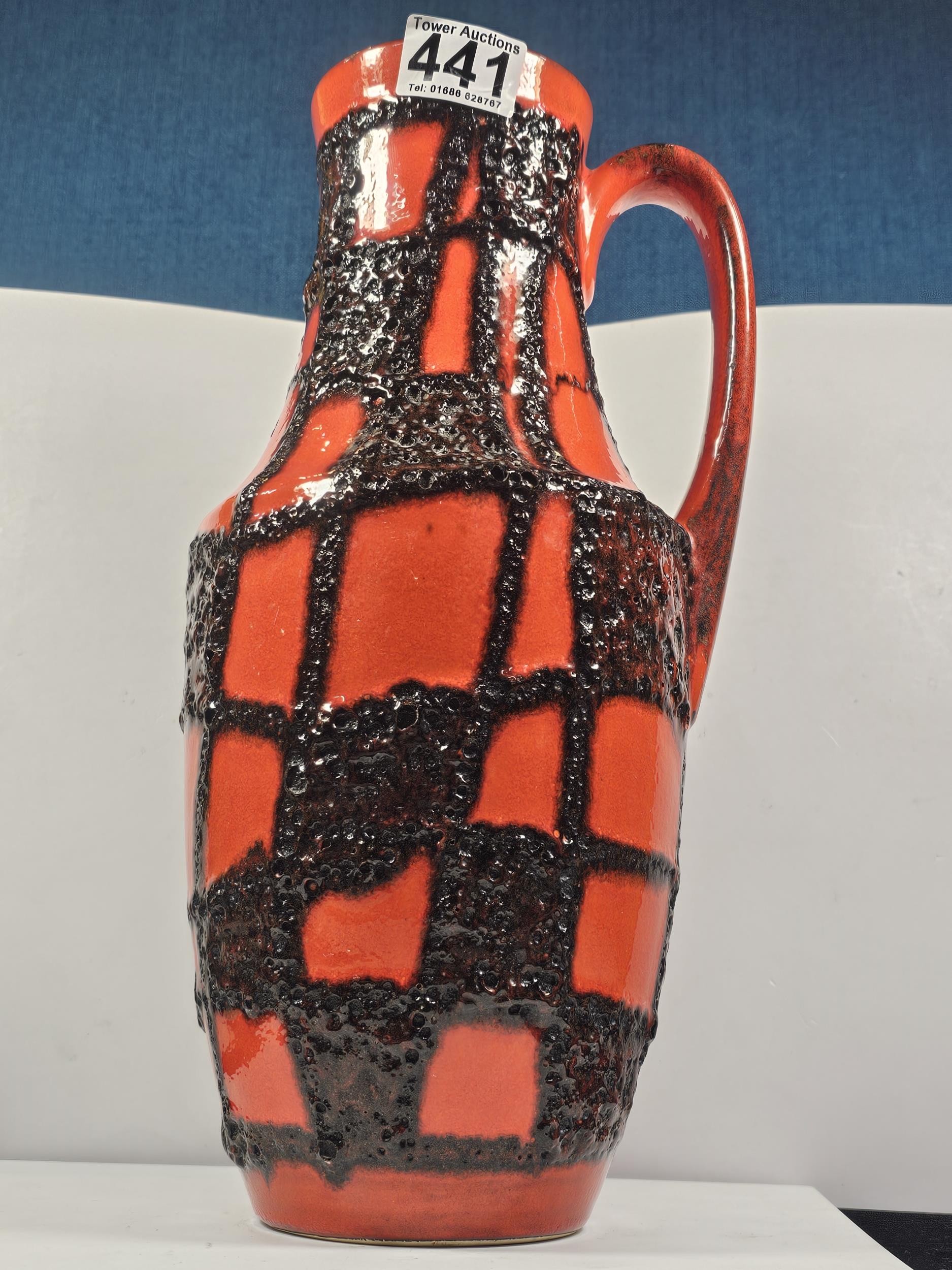 A large striking West German scheurich keramik jug vase, model 407-35, circa 1960's/70's of Baluster form with integral handle, finished in a bold orange ground decorated with a heavily textured black lava glaze, arranged in a distinctive spiderweb pattern. The glaze pooling across the surface to creat strong depth and contrast. It has a height of 35.5cm, with a width of 18cm, it has a minor chip to the top rim otherwise the piece is in excellent condition.