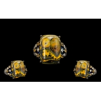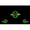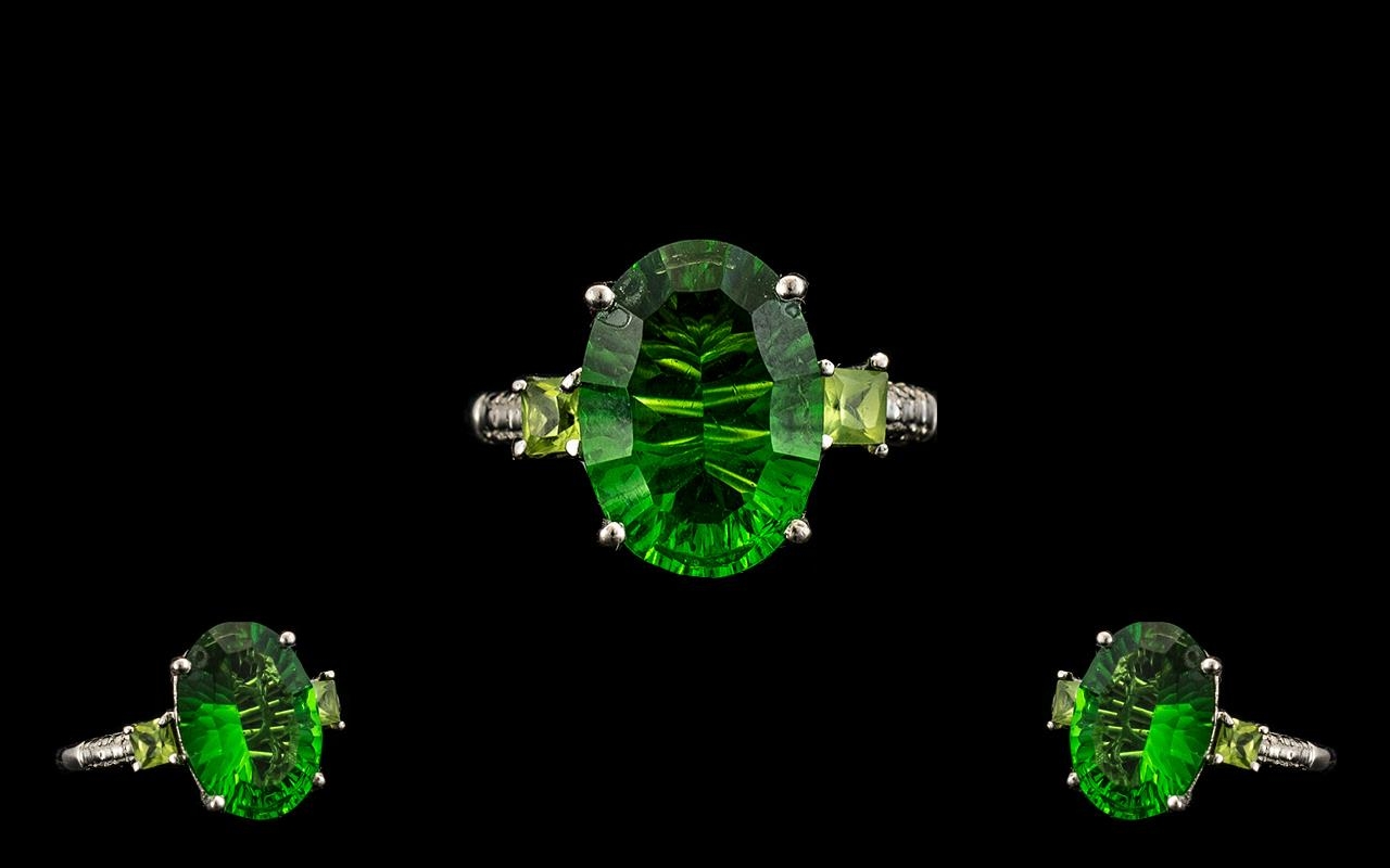 Helenite Platinum Vermeil Dress Ring the central stone measuring approx 4.5 carats flanked by two smaller stones. Ring size O.