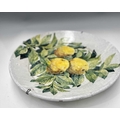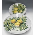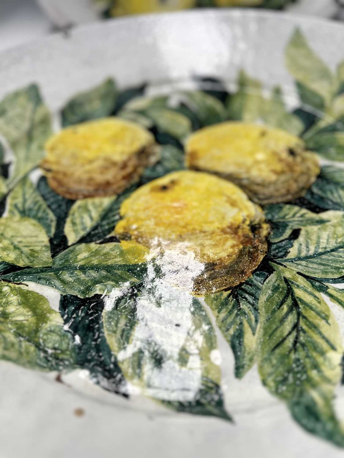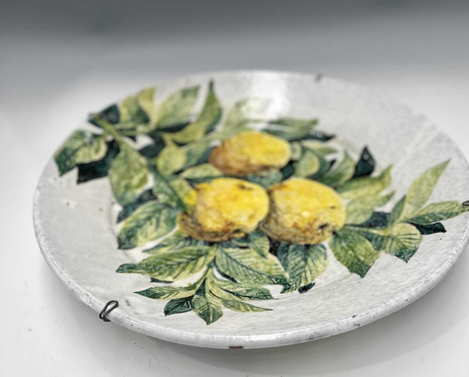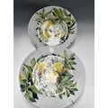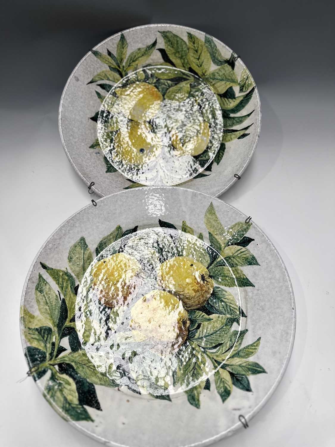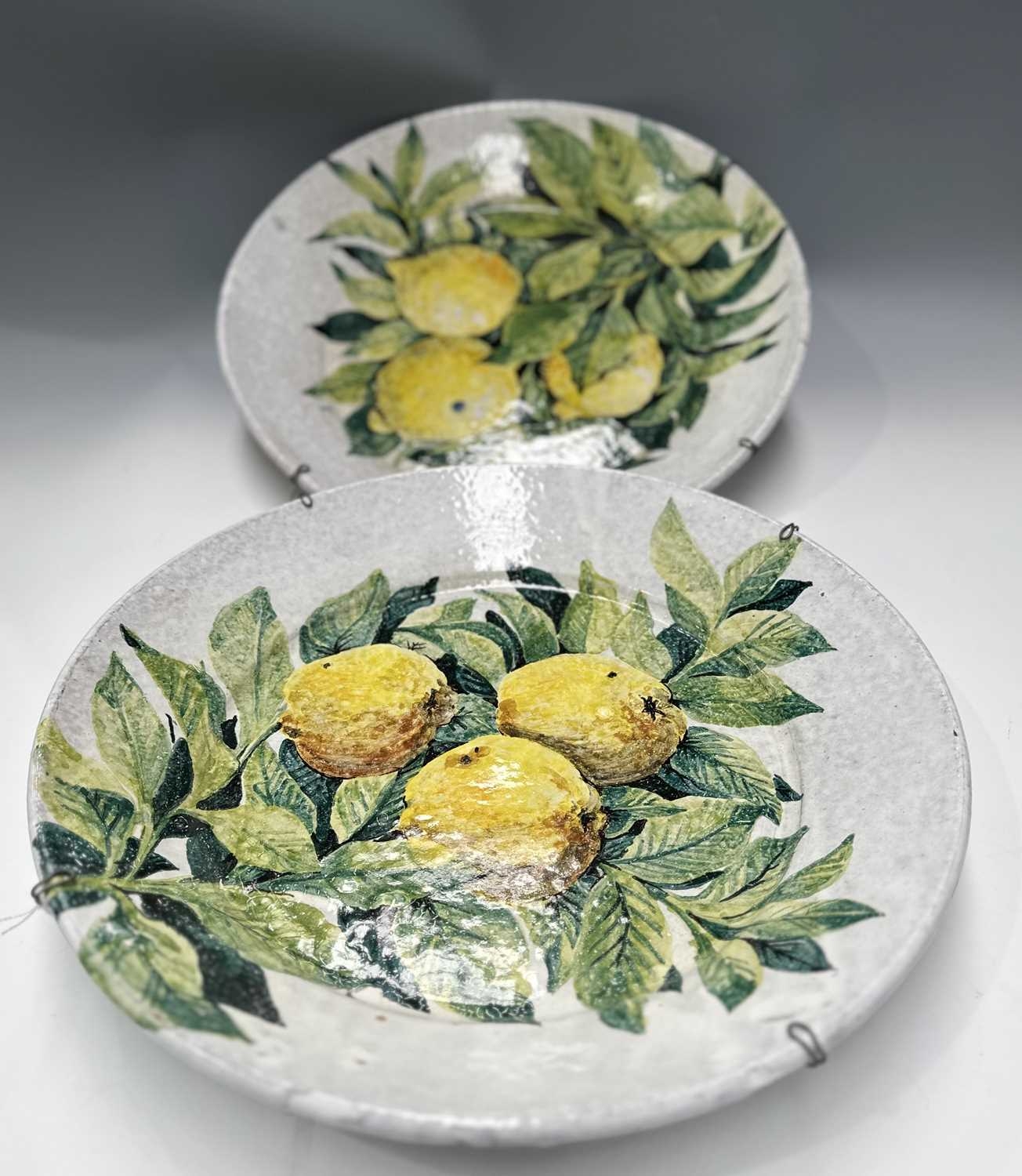 A pair of large faience chargers, each hand-painted with lemons and foliage on a white ground, signed to the reverse 'Porches Algarve KS 1985', the one further signed 'Jaixo Ciara'?, diameter of each approx 48cm (2)