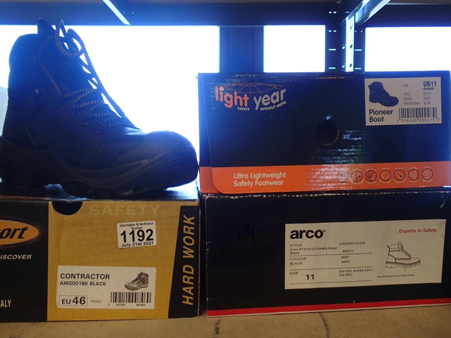 Three unworn pairs of industrial work boots, size 11. Not available for in-house P&P, contact Paul O'Hea at Mailboxes on 01925 659133