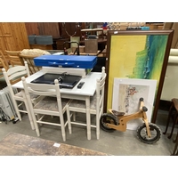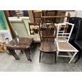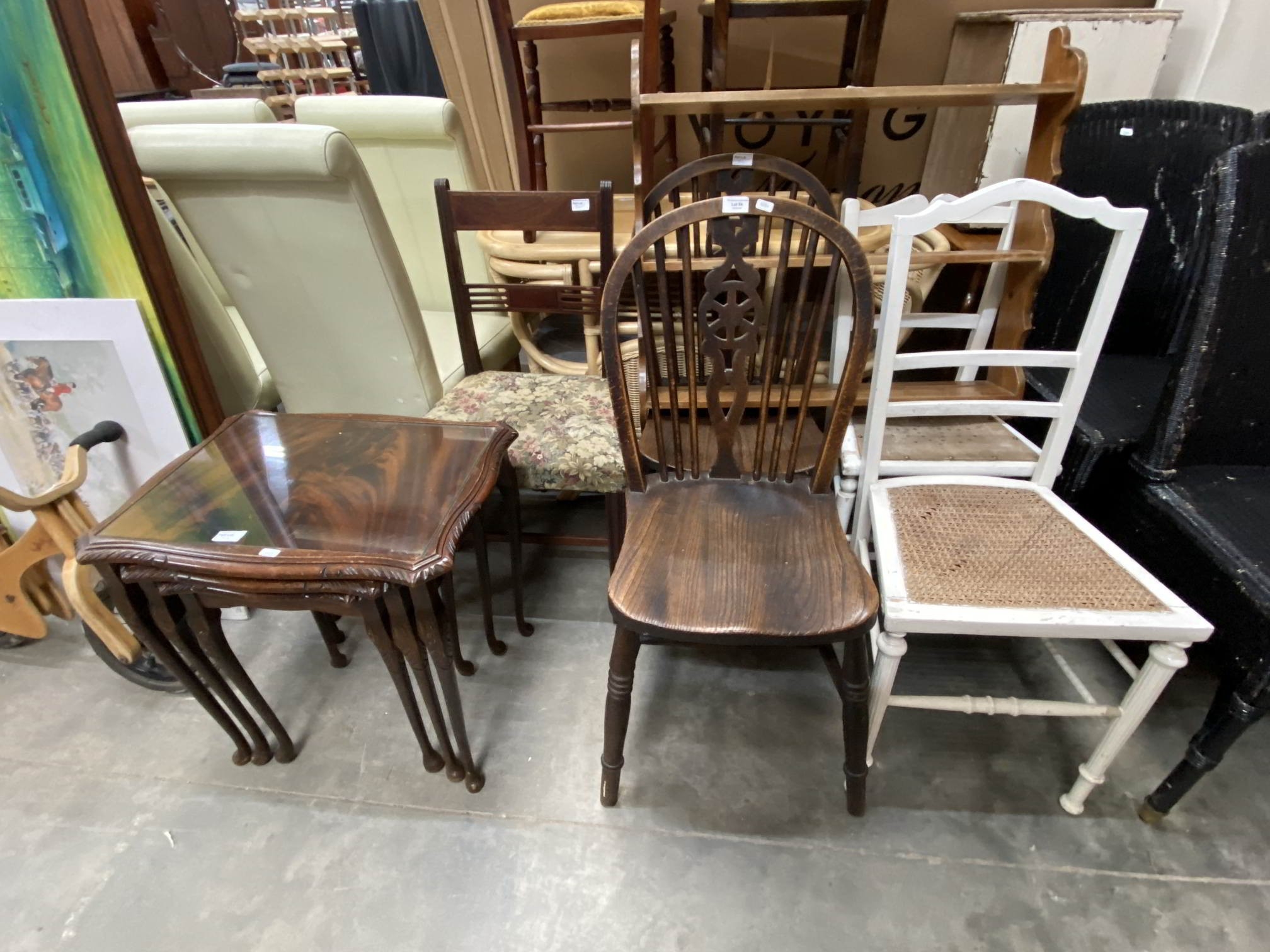 Assorted furniture including a pair of oak wheelback chairs 38W, mahogany nest of three tables 55H 55W 42D etc