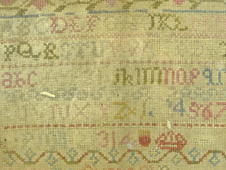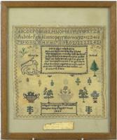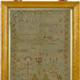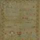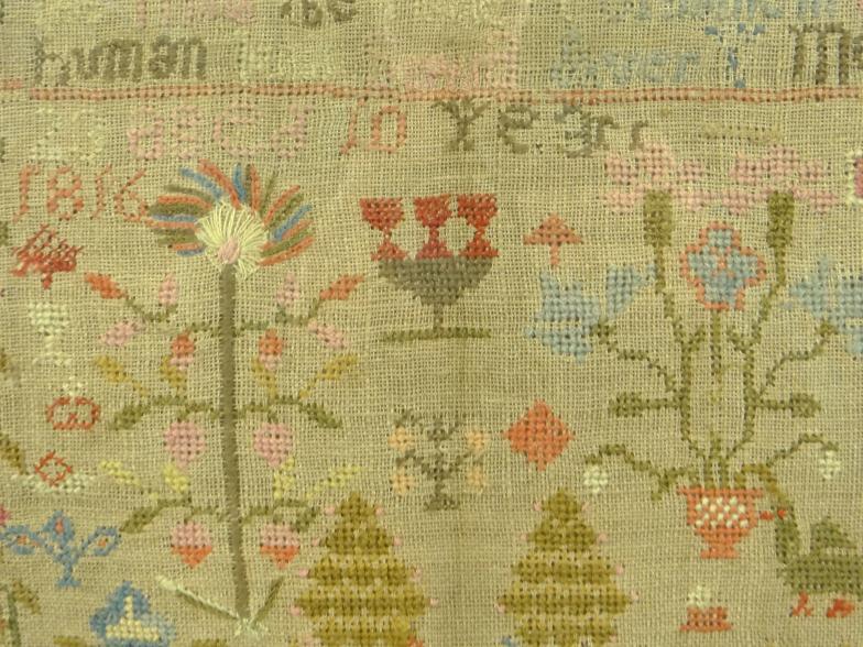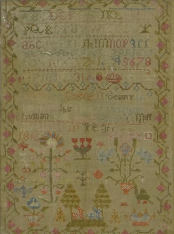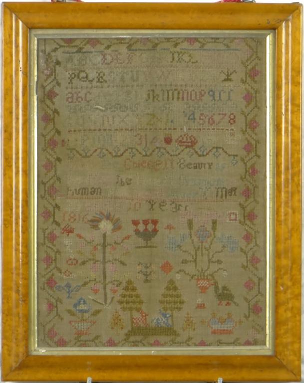 Early 19th century sampler embroidered with alphabet, script and flowers, indistinctly signed ? March 23rd, age 10 years, 1816, housed in a gilt lined birdseye maple frame, the sampler 39cm x 29cm excluding the frame