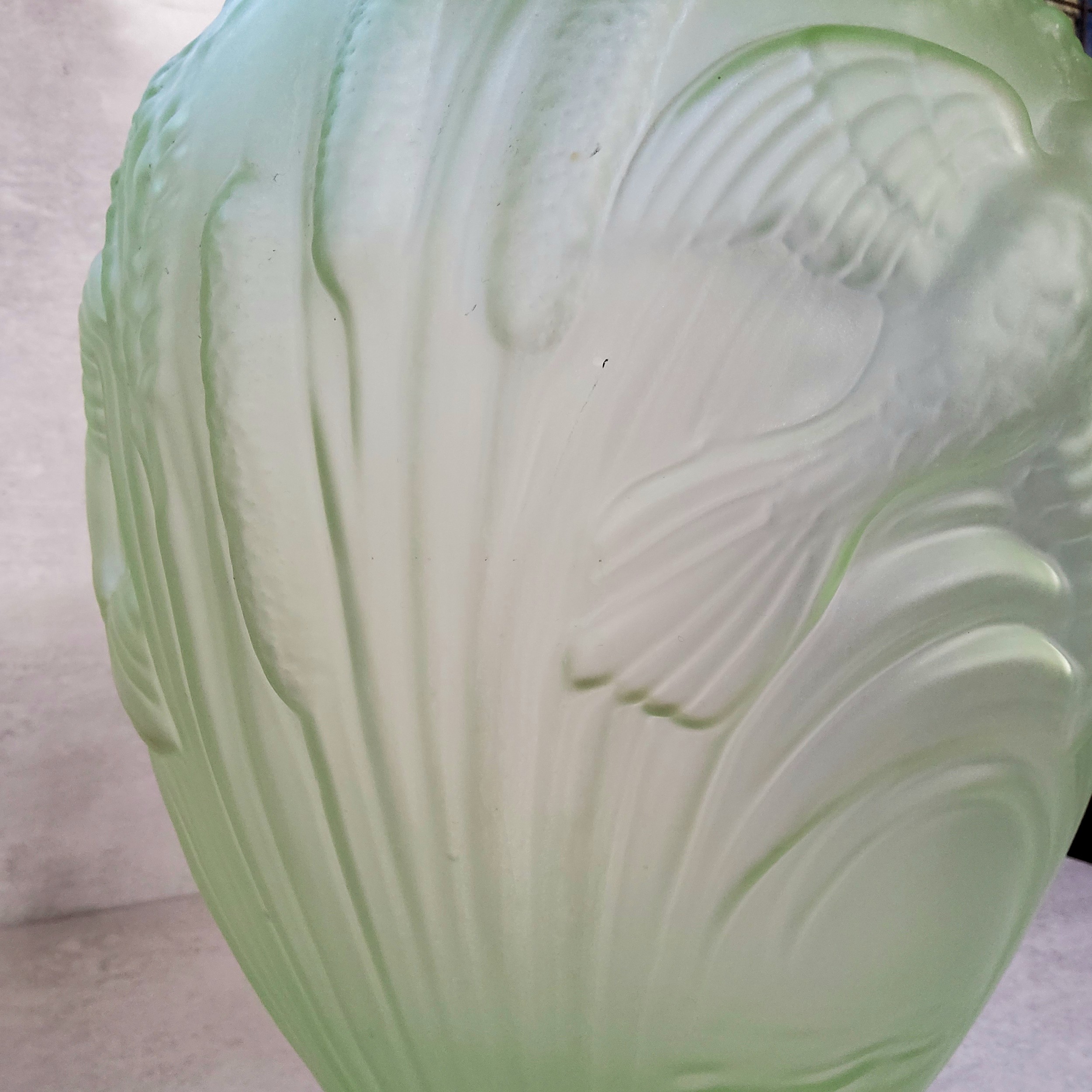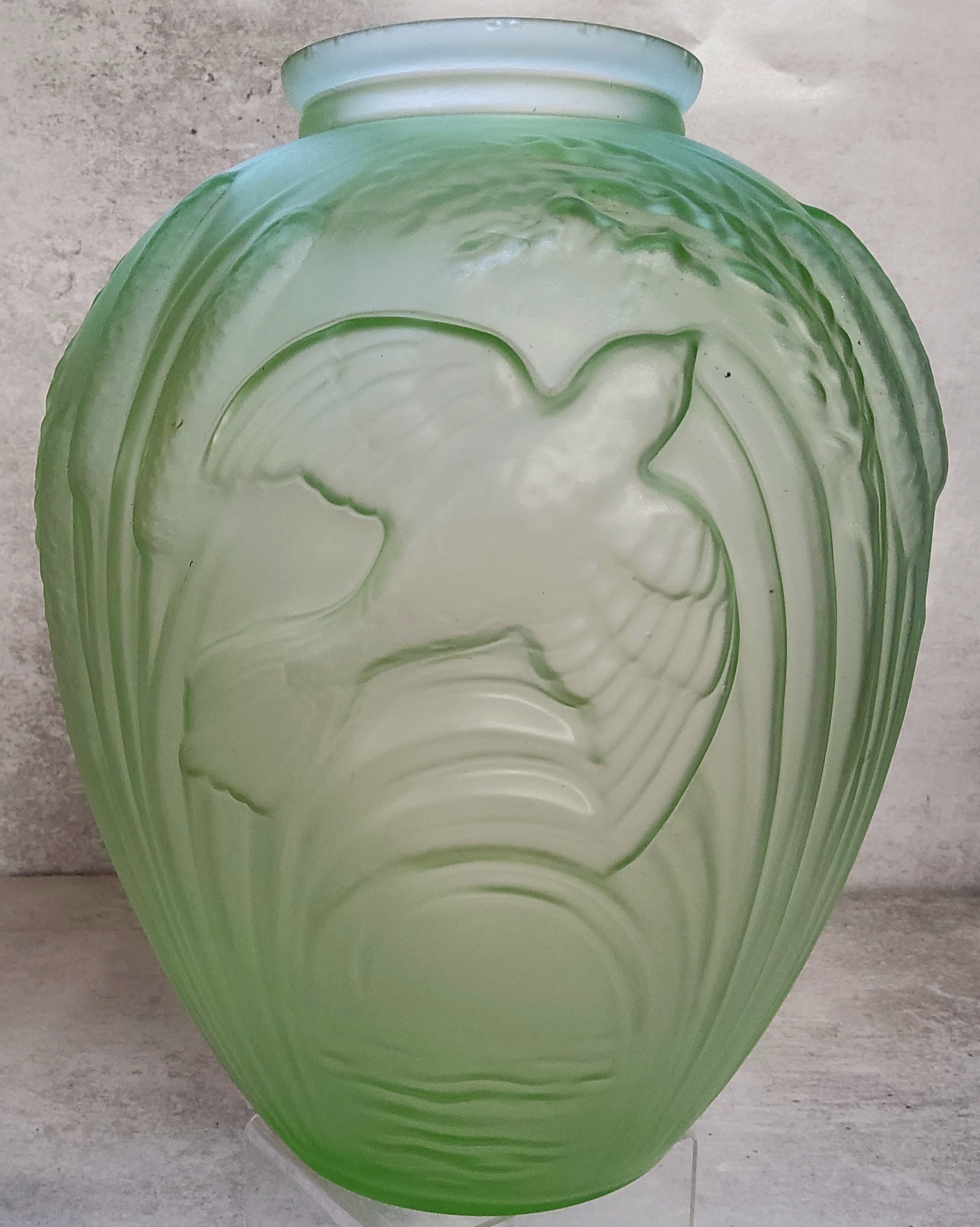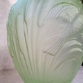 A Rene Lalique style Uranium green glass amphora shaped vase decorated in relief with bullrushes and birds 38cms high c1930's