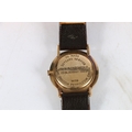 Gents 9ct gold Longines wristwatch, (Cal 19.5), subsidiary dial, applied baton markers and replacement leather strap. Box present.