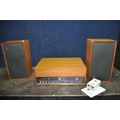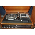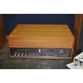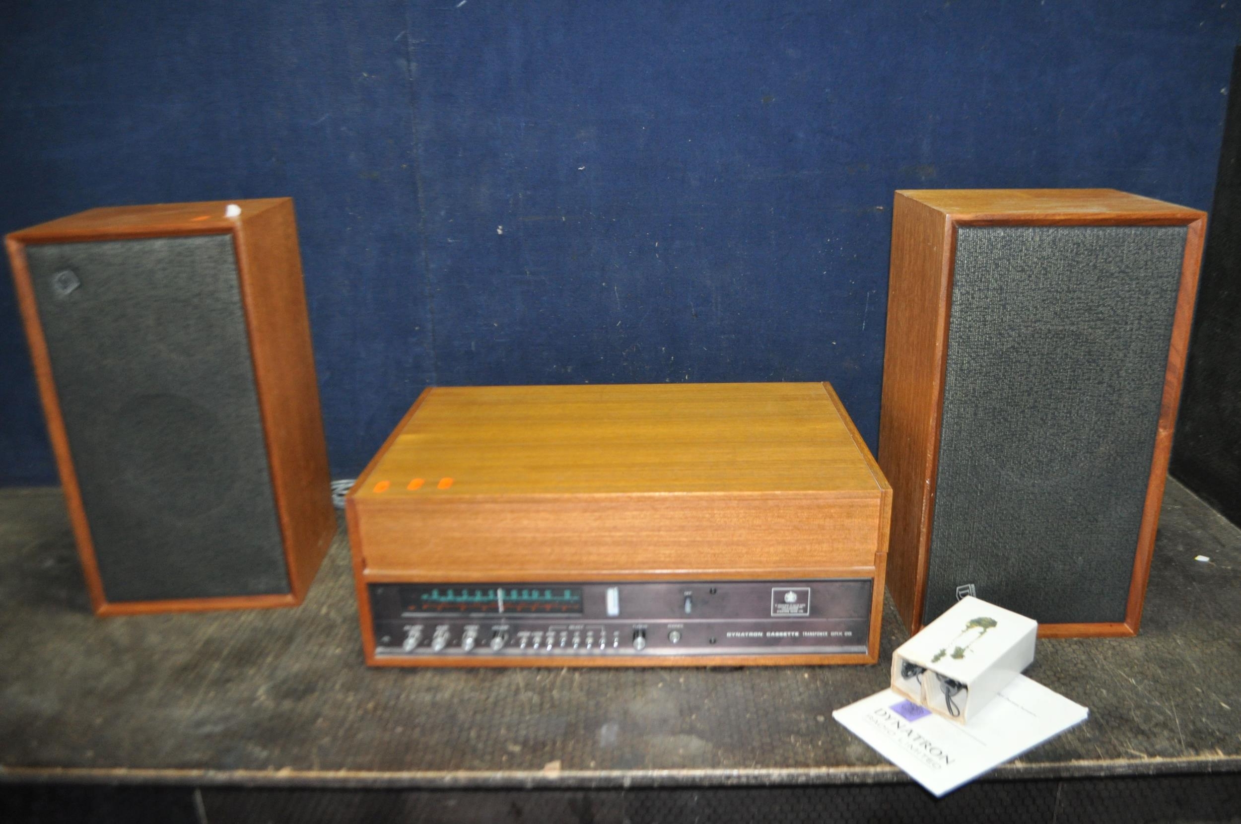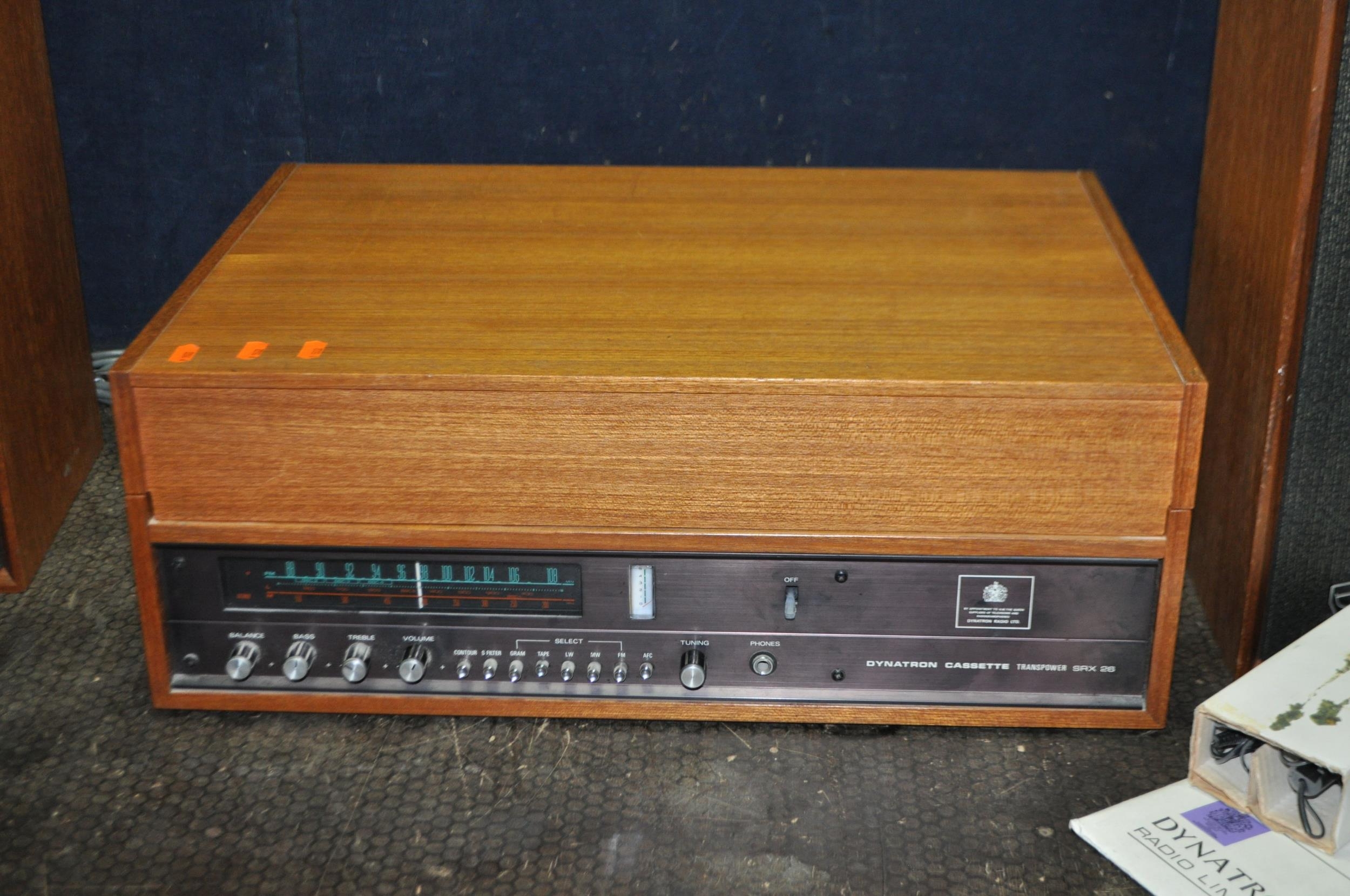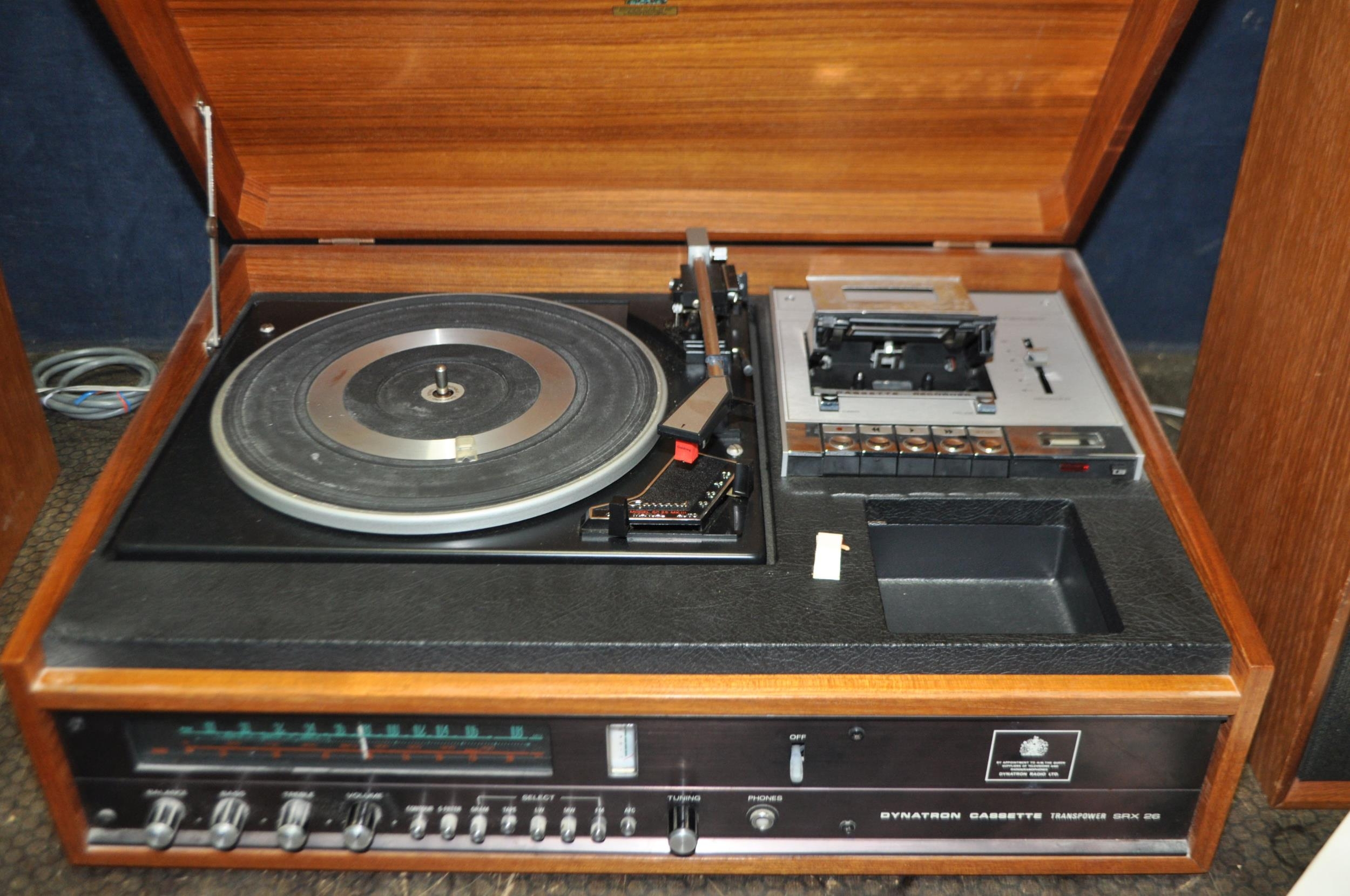 A DYNATRON HFC 38 RADIO GRAM, in a Teak cabinet with matching speakers, SRX25 amplifier, a Garrard SP25 mk3 turntable (PAT fail due to uninsulated plug, turntable working, amp working but controls very scratchy and intermittent, tape not working)