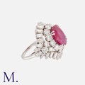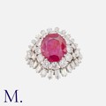 CHAUMET. A Fine Burma Ruby and Diamond Ring in platinum set with an oval-cut ruby of approx. 4.17ct (accompanied by a laboratory report stating it is of Burma origin and no indications of heat treatment), together with round cut and baguette cut diamonds in surround. Signed Chaumet Paris and French marks for platinum.
