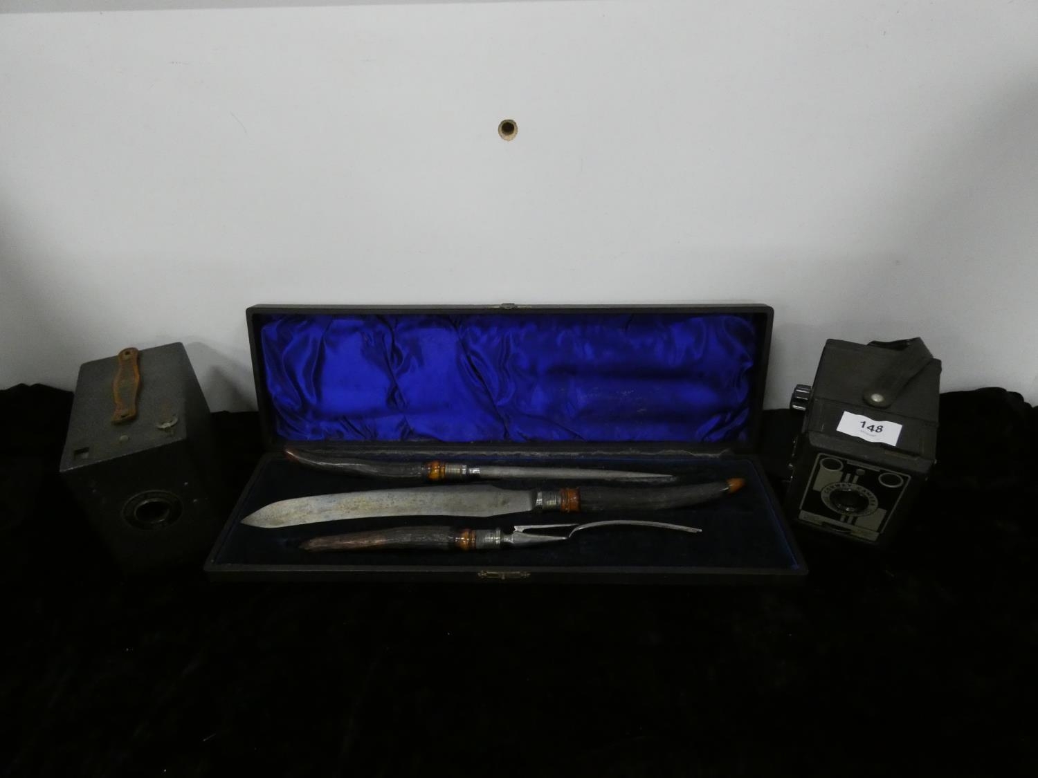 Two vintage cameras and a bone handled carving set.