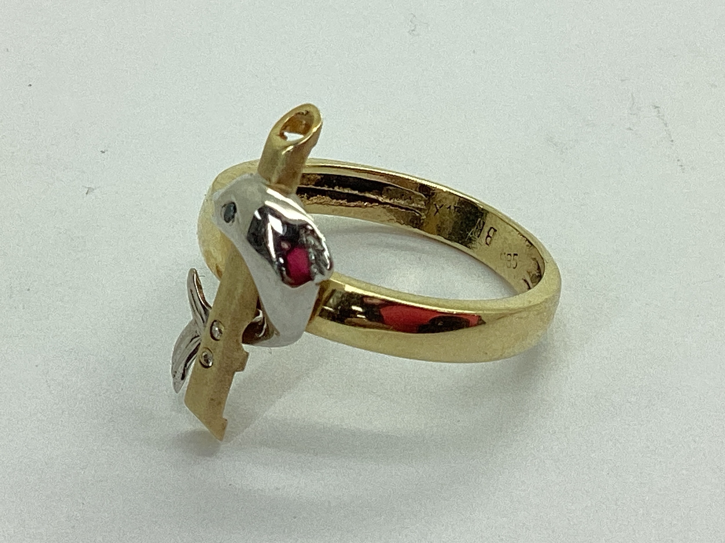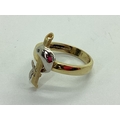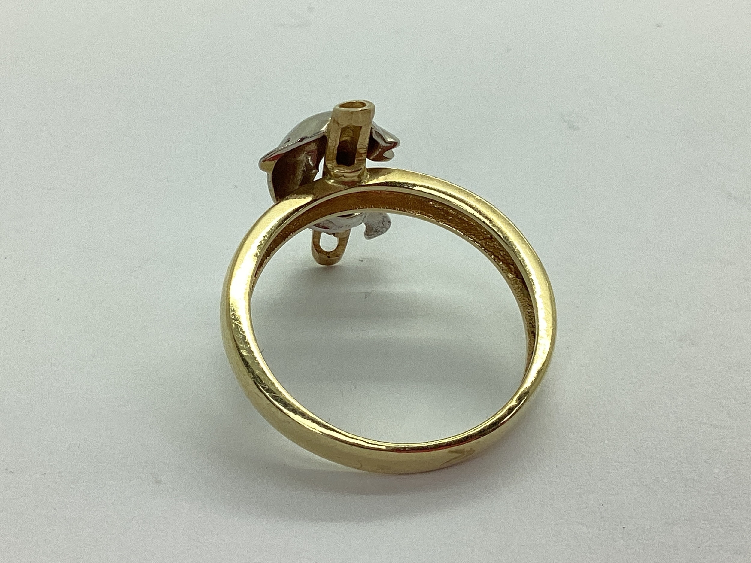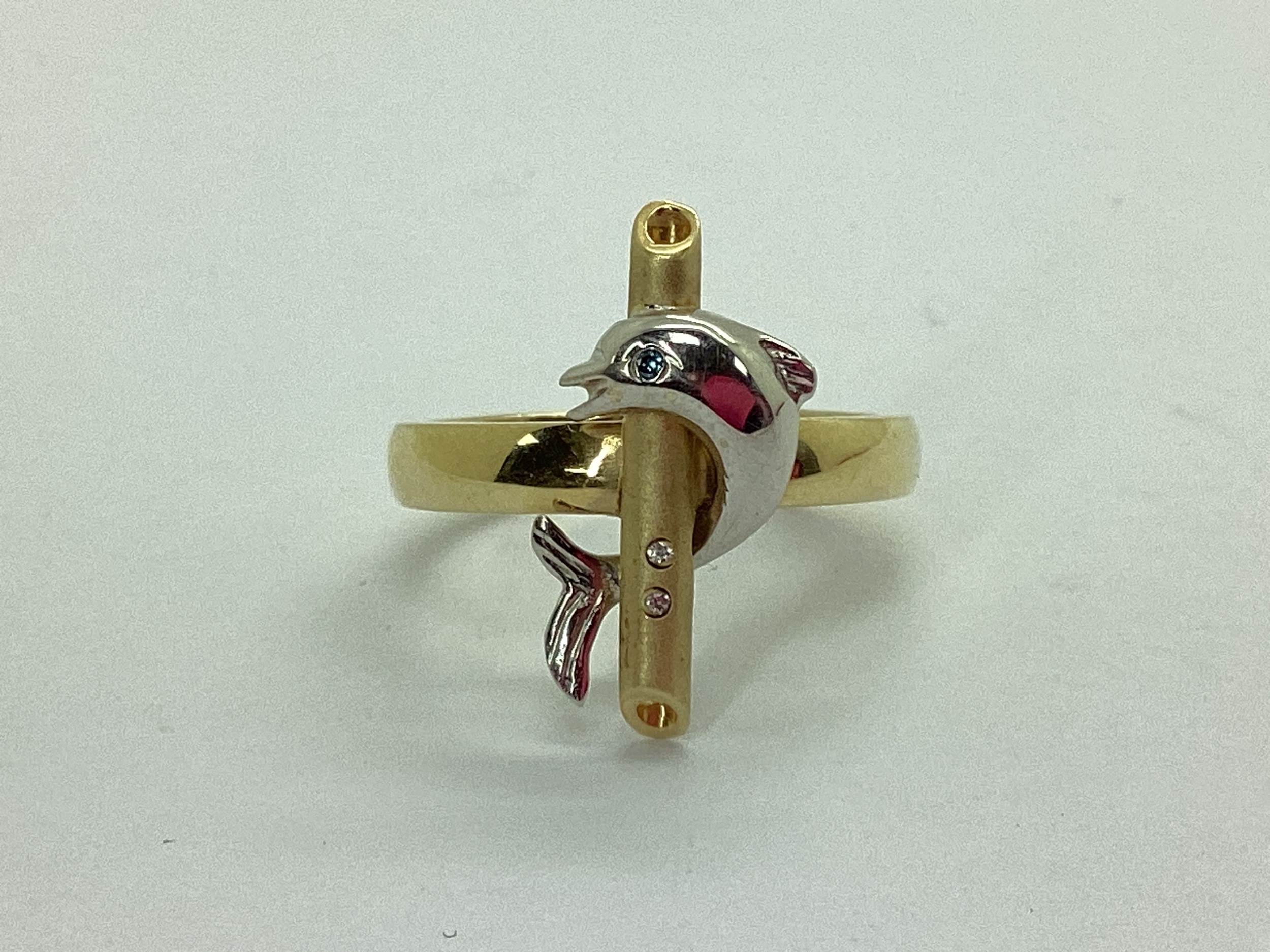 An Unusual Dolphin Dress Ring, with inset highlights, stamped "585" (finger size P) (3.8grams).