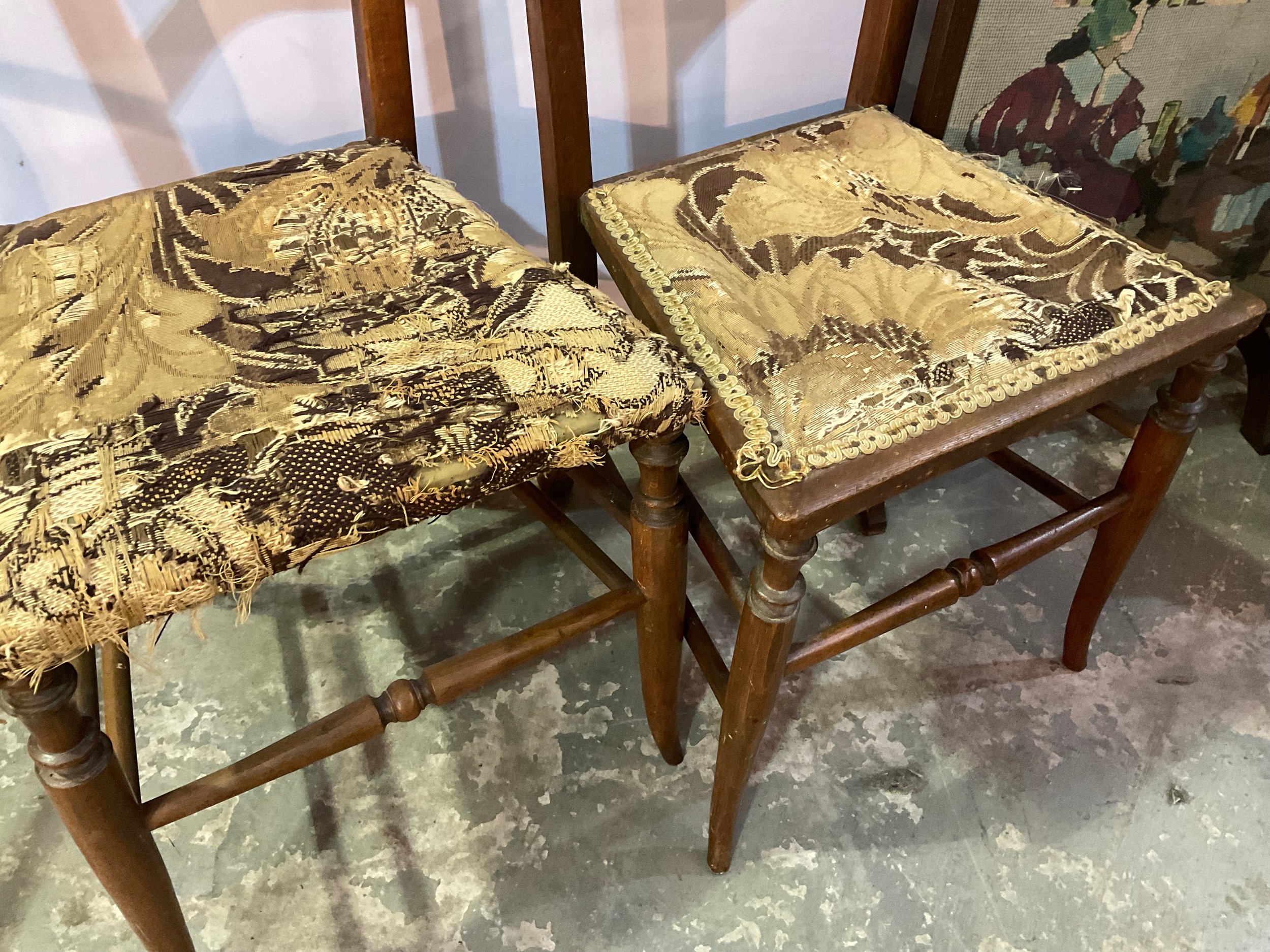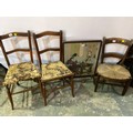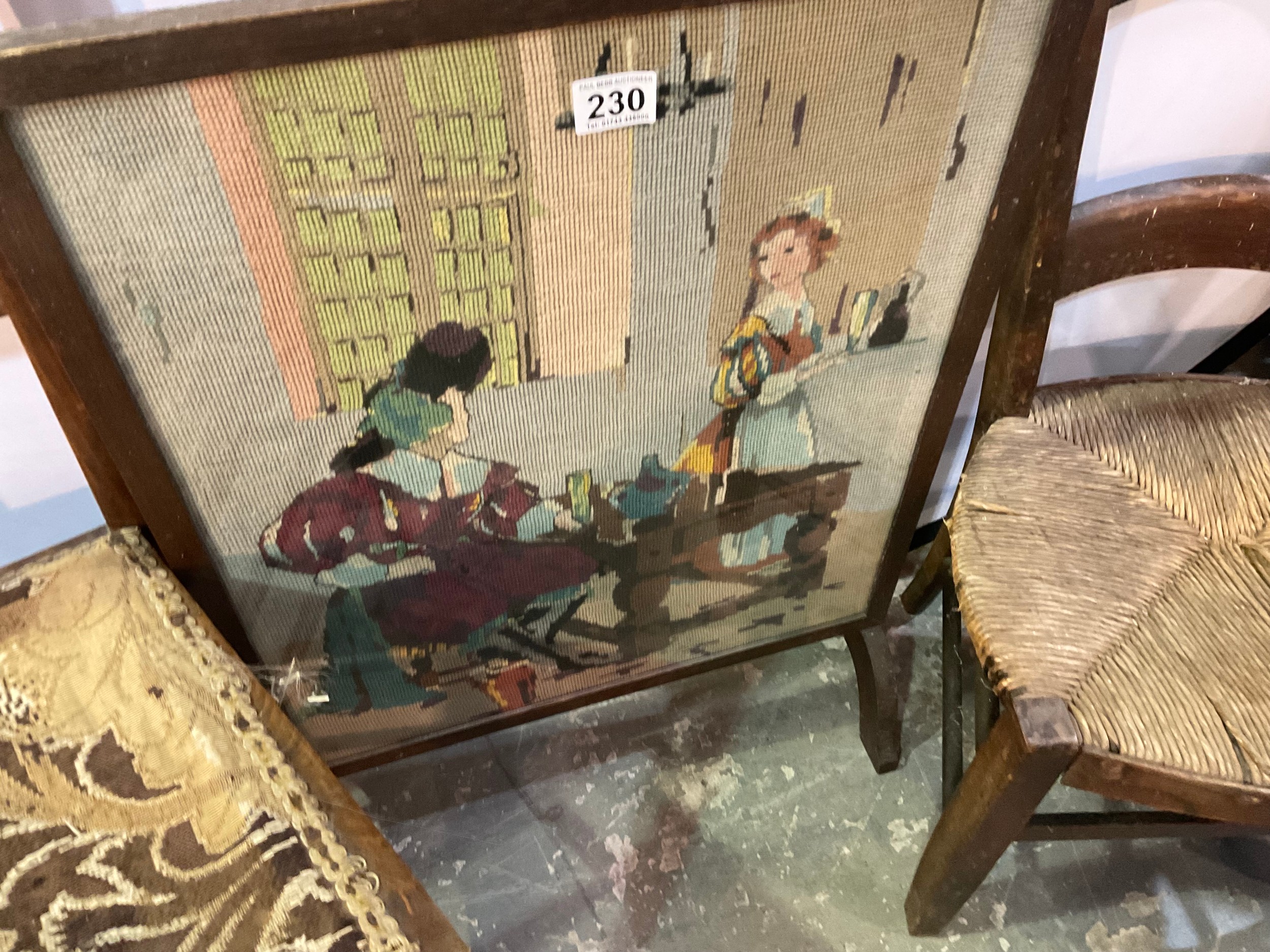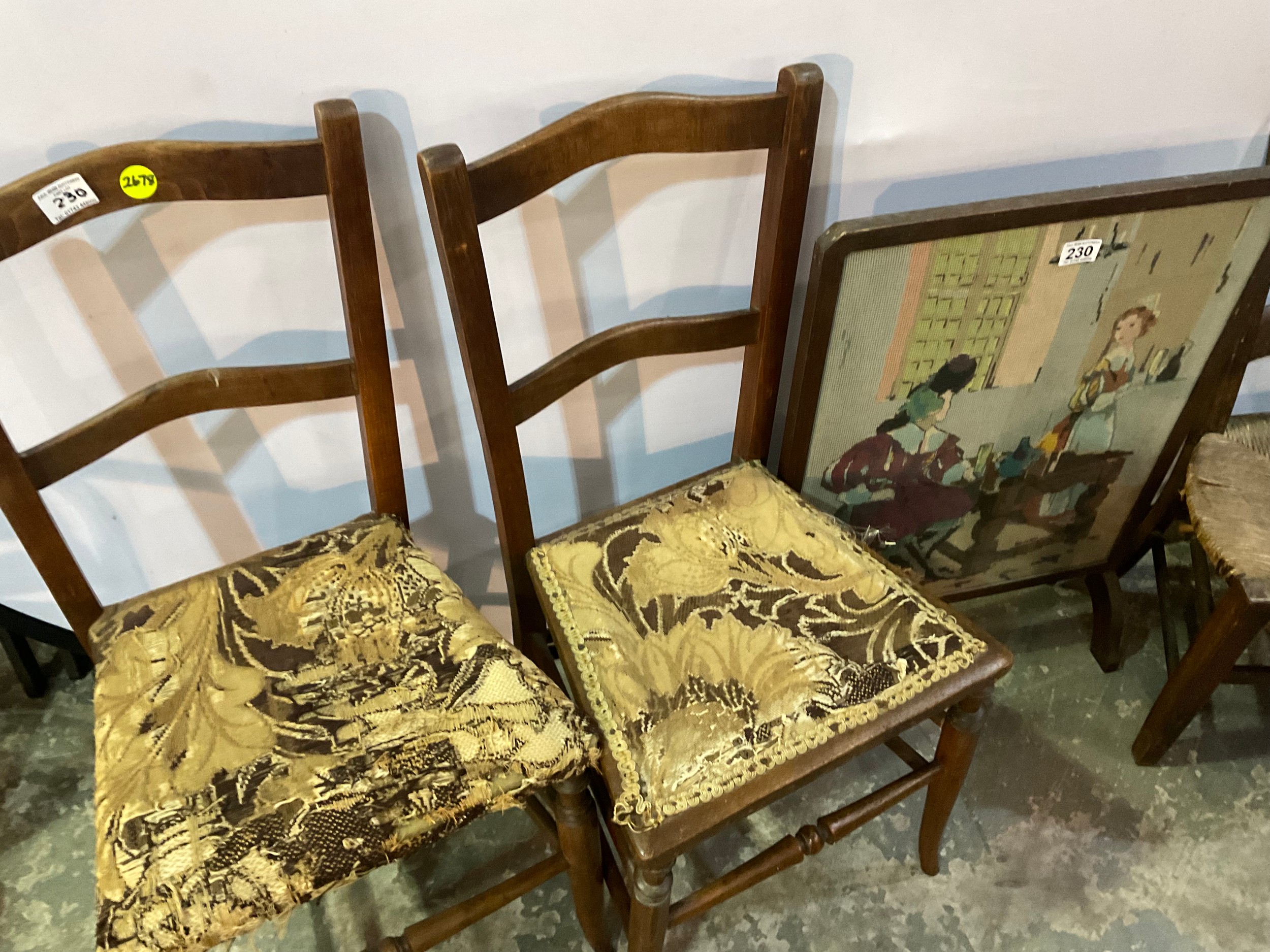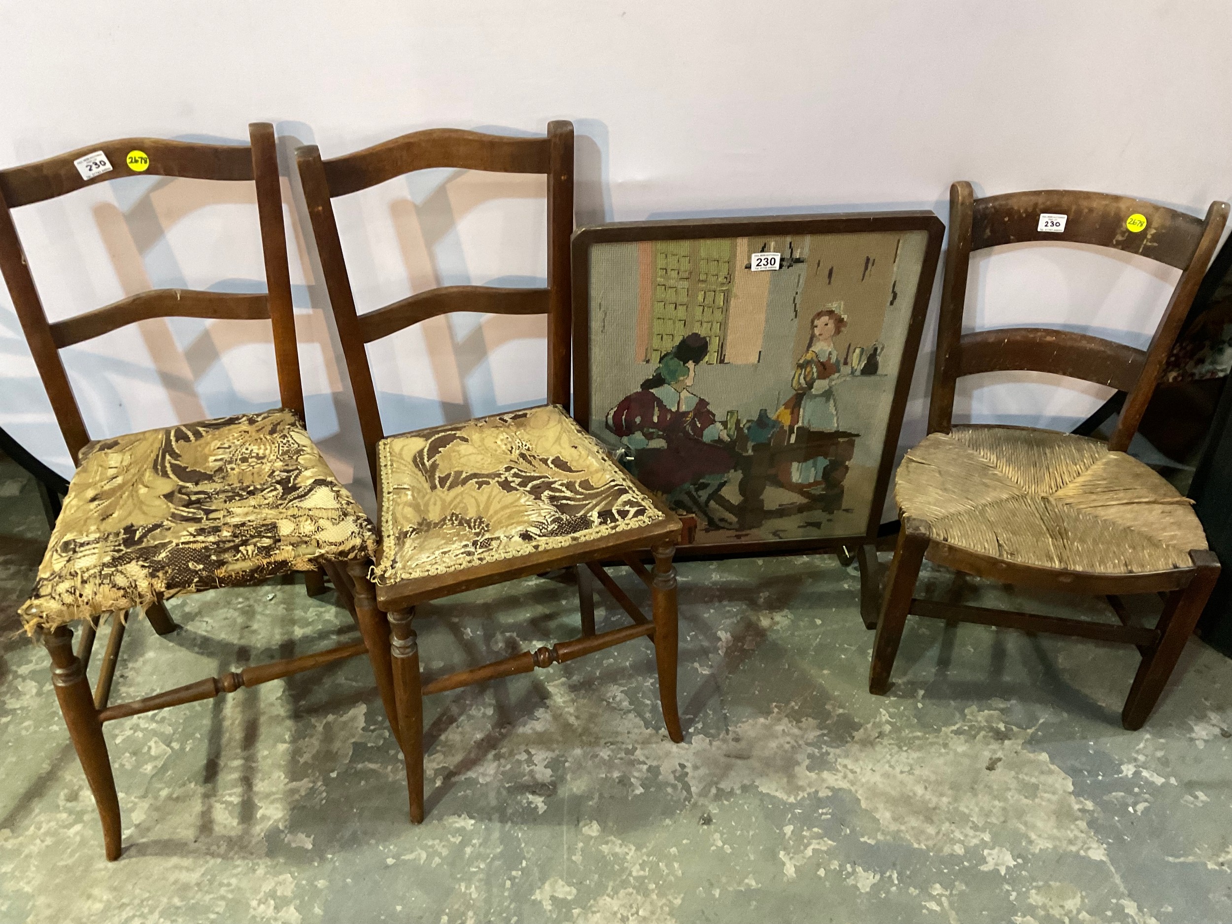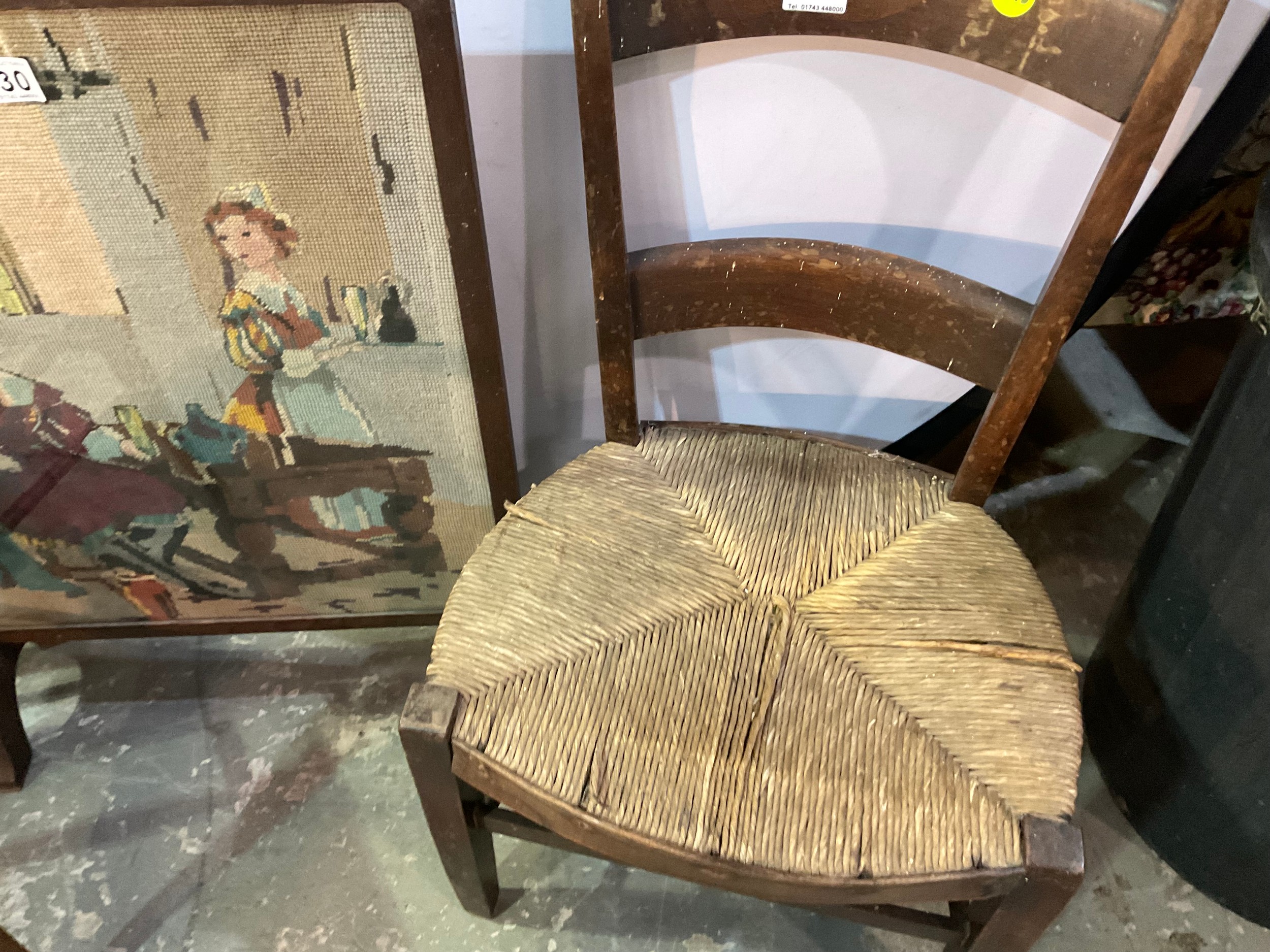 EDWARDIAN RUSH SEATED CHILDS CHAIR, PAIR OF BEECH BEDROOM CHAIRS, TAPESTRY FIRESCREEN