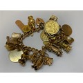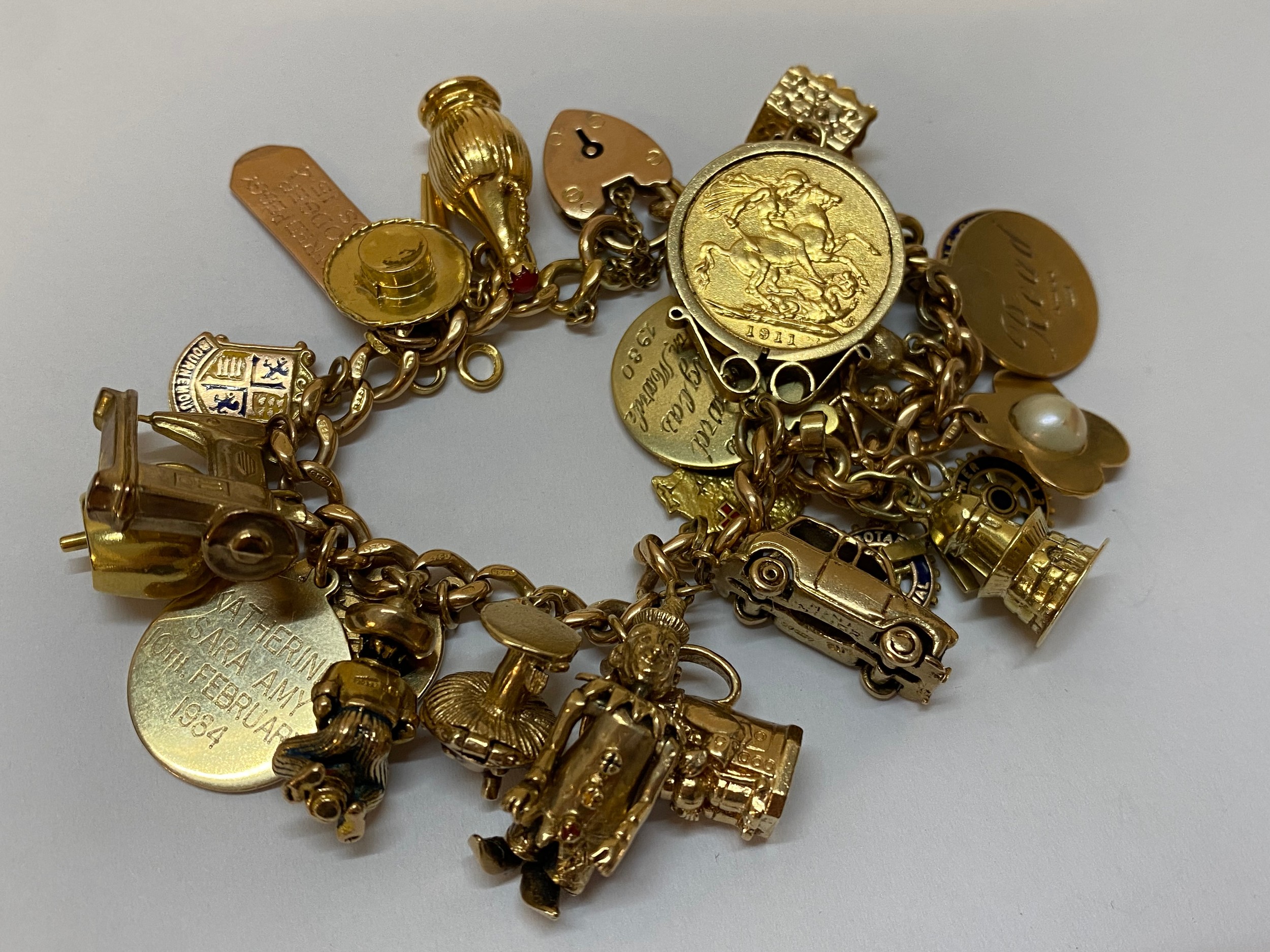 A 9ct. gold bracelet with heart shaped padlock hung with many 9ct. gold charms including a motor car, Toby jug, clown, sewing machine and a gold sovereign in a gold frame