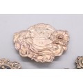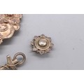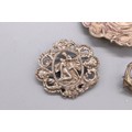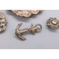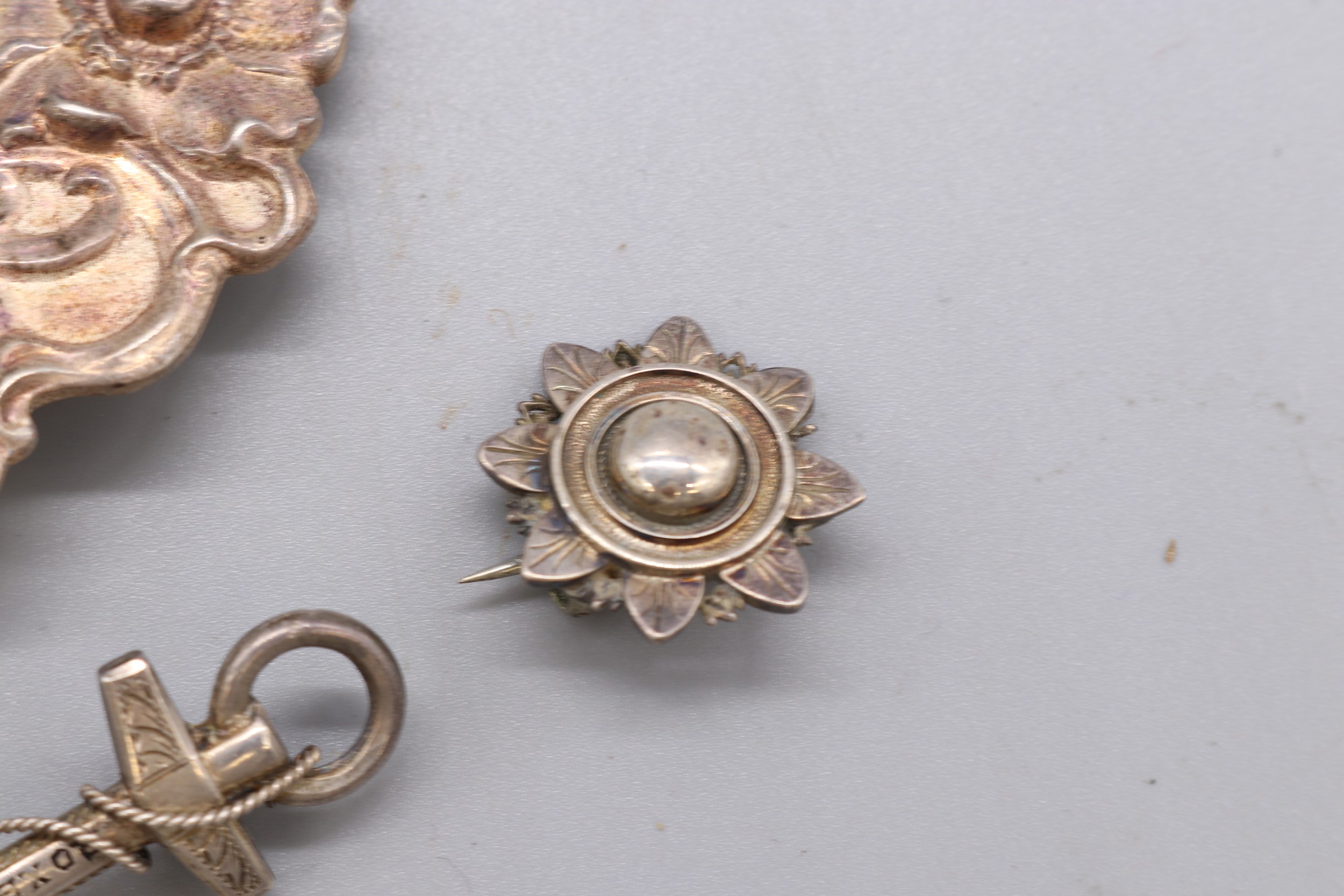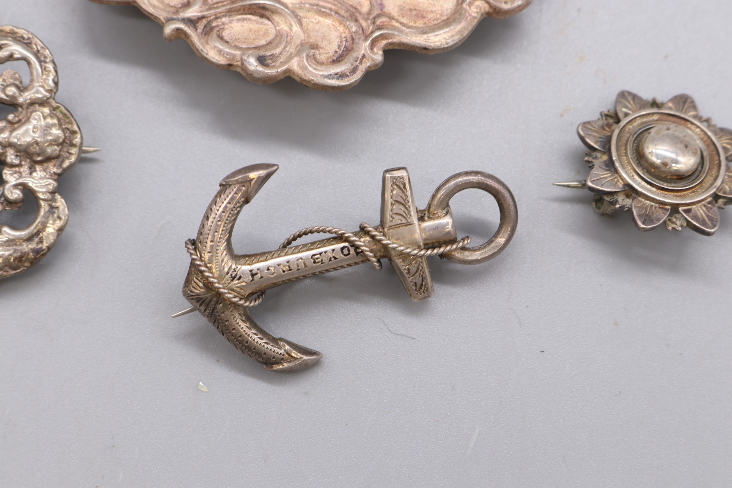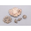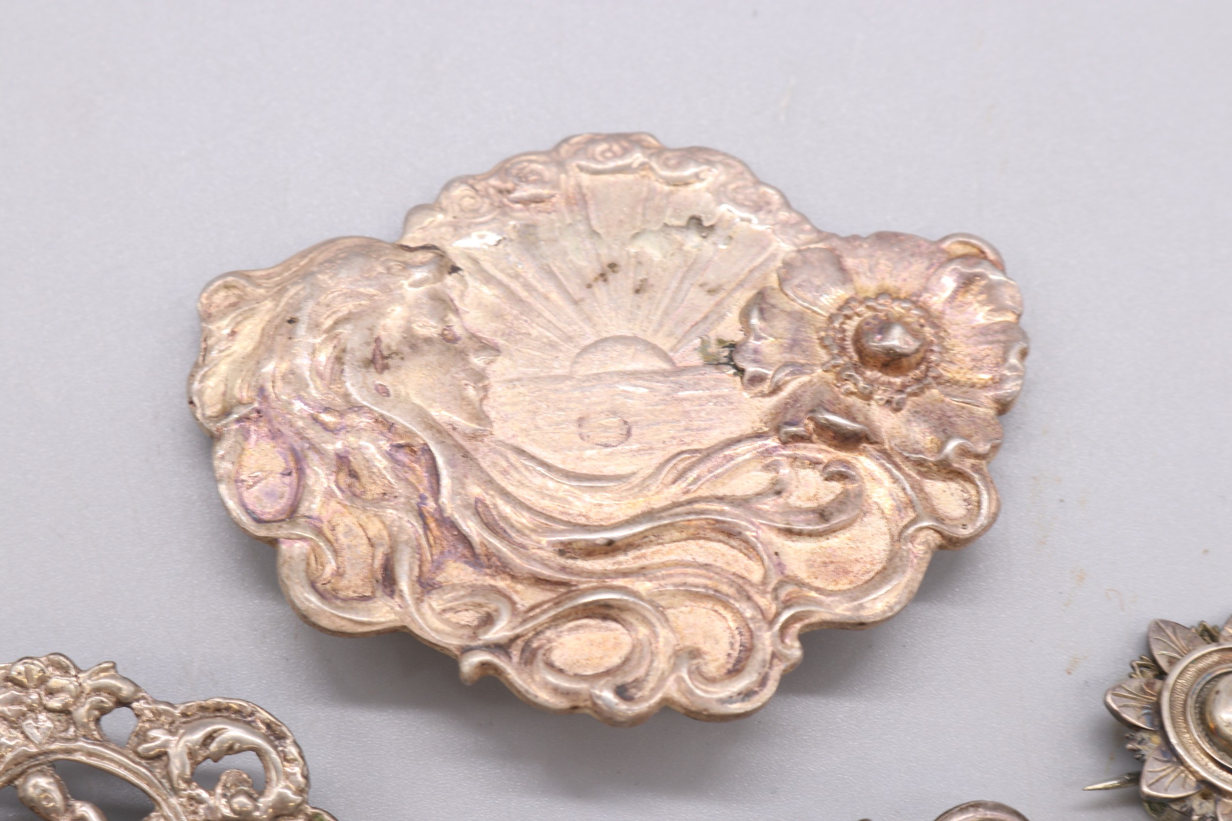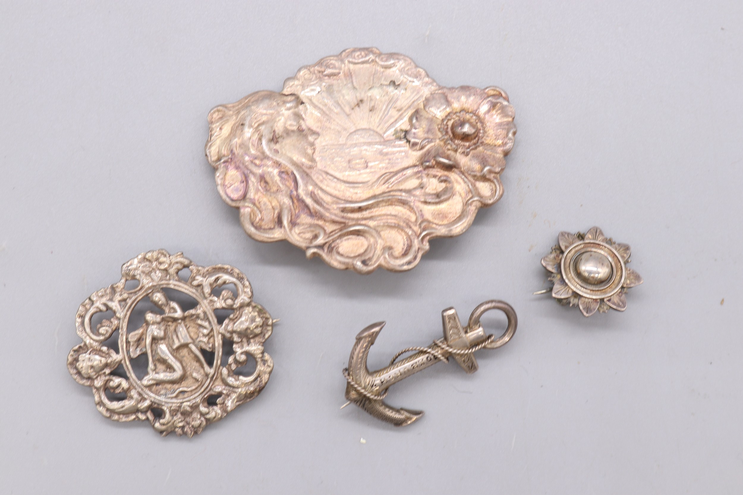 Lot of four sterling silver and white metal bar brooches, comprising a hallmarked sterling silver Art Nouveau brooch depicting a female profile with sunrise and floral motifs, weight 26.66g; a hallmarked sterling silver engraved anchor brooch with rope detail, weight 3.15g; a stamped white metal brooch depicting two figures within a pierced scrollwork frame, weight 14.38g; and a small stylised flower brooch with engraved petals, weight 2.93g