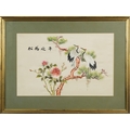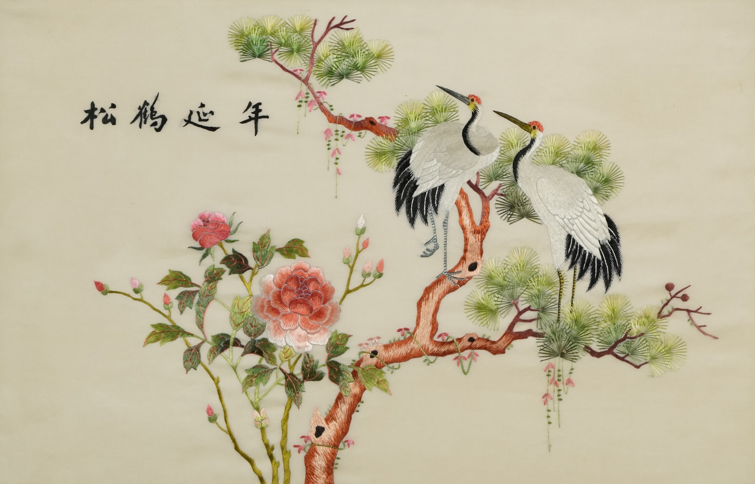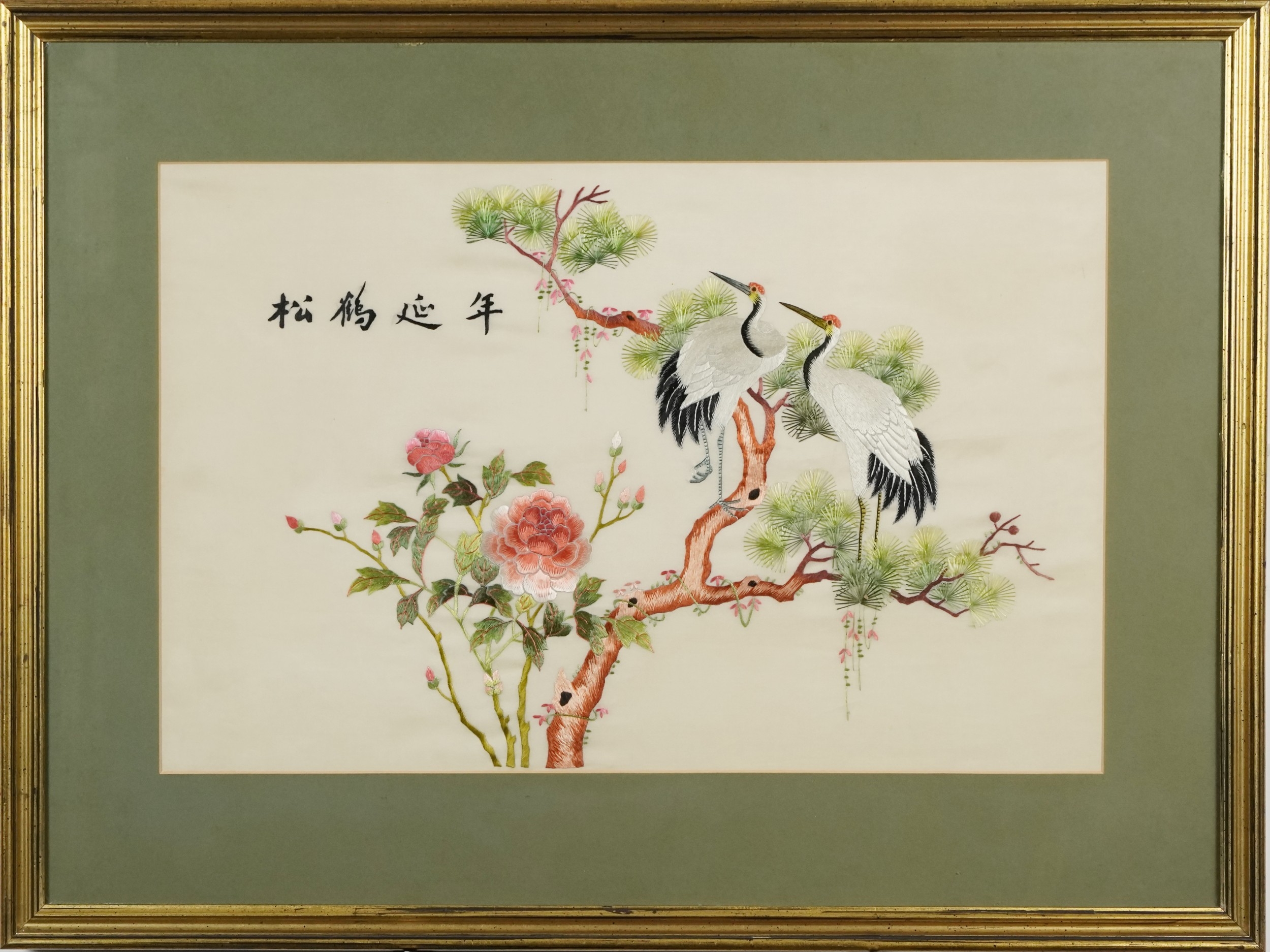 A Chinese silk work embroidery depicting cranes amongst foliage, mounted, framed and glazed, 38cm x 58cm.