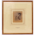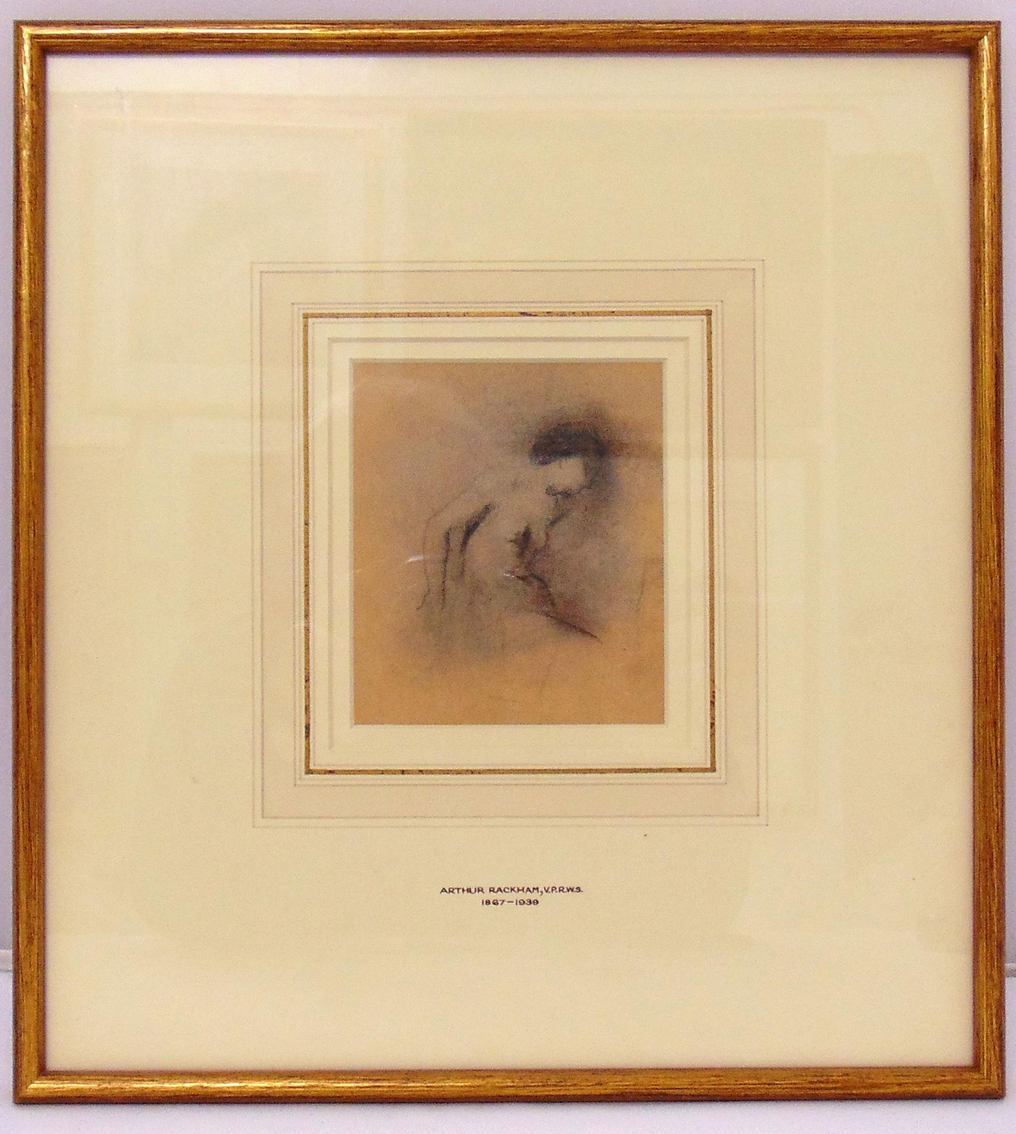 A framed and glazed charcoal drawing of a naked woman with notation by Arthur Rackham and retailed by Duncan Miller fine arts label to verso, 11.5 x 9.5cm