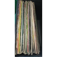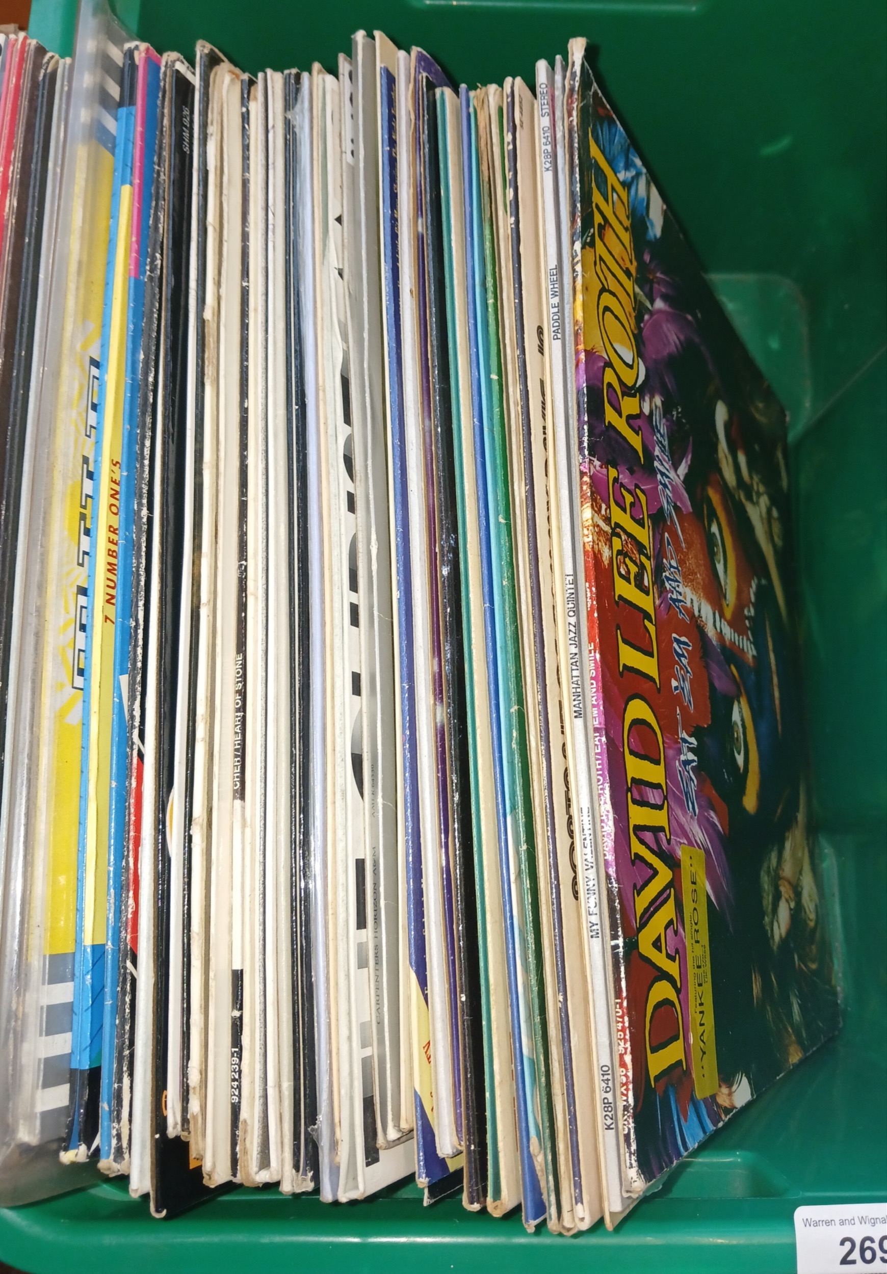 A box of LPs - mixed genres - includes David Lee Roth, Jeff Beck Group, Sammy Davis Jr, Carpenters, Beach Boys, The Ventures, Sky etc