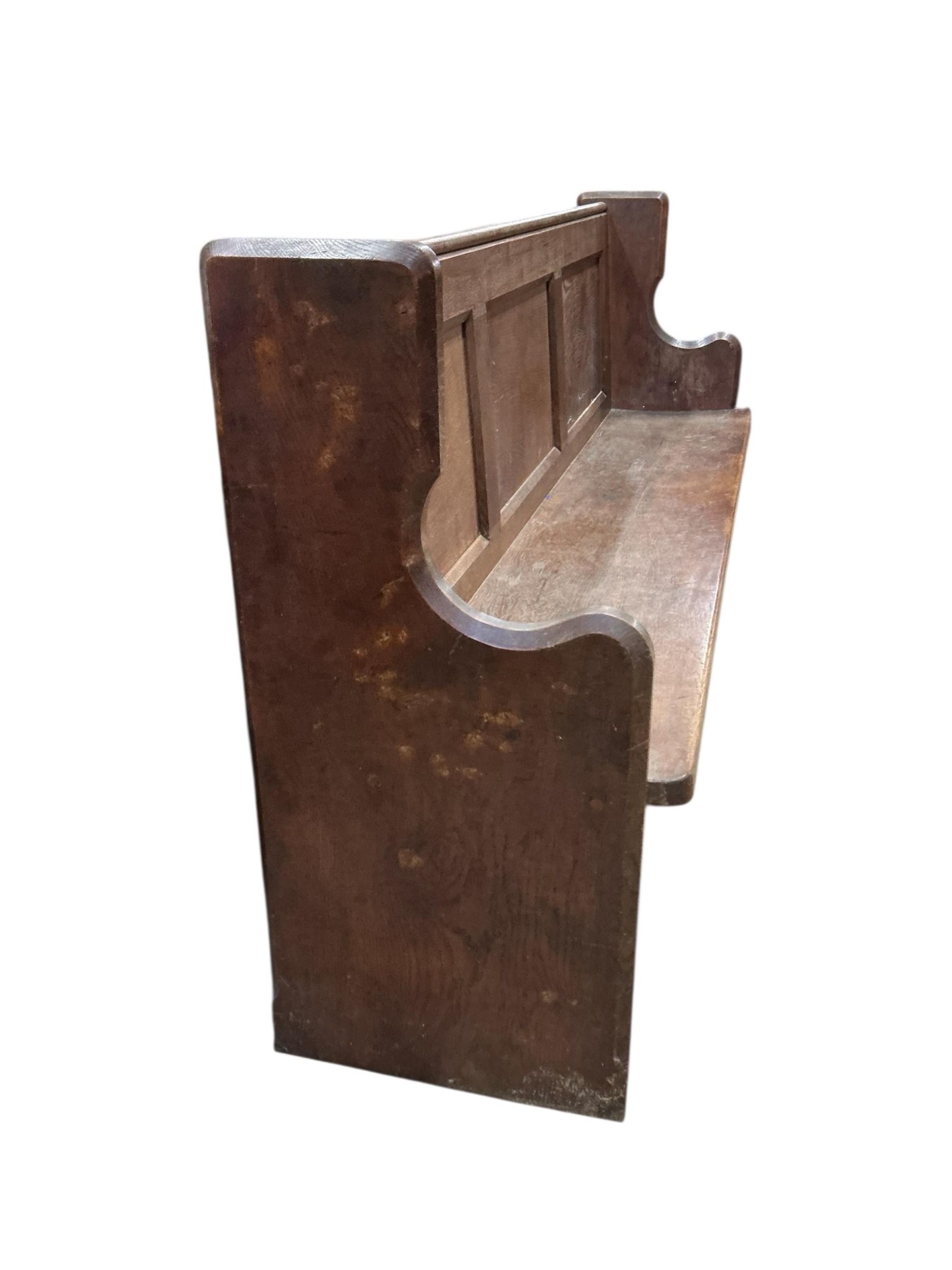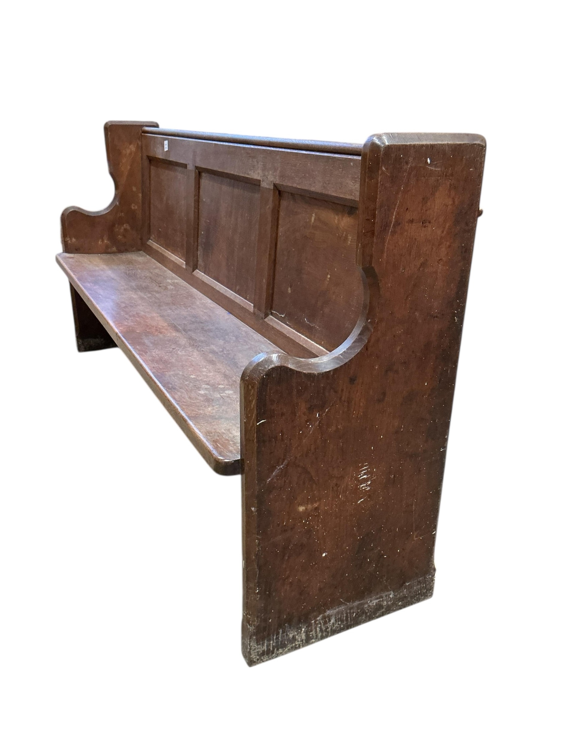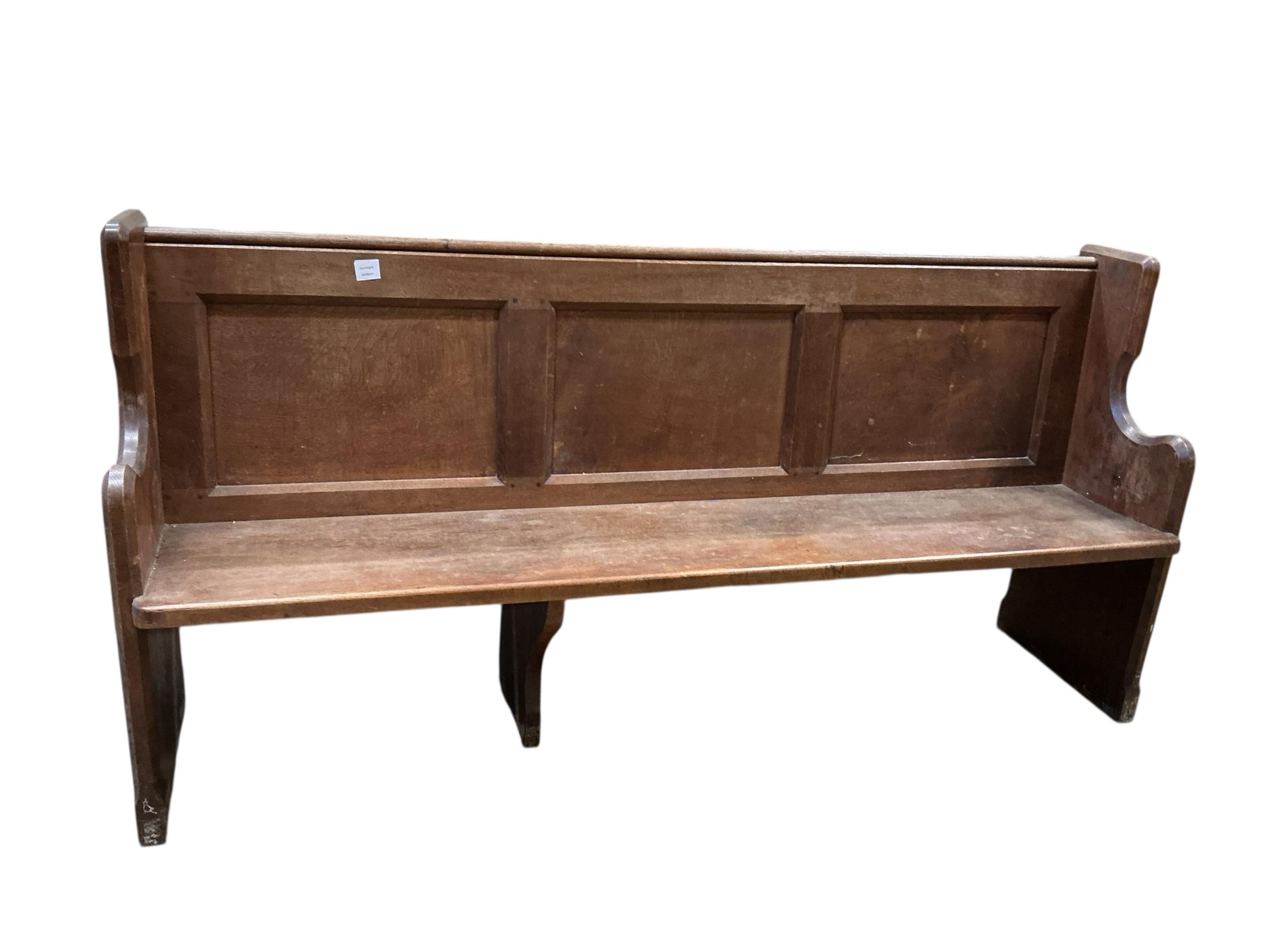 A Victorian panelled oak pew, width 196cm, depth 50cm, height 97cm